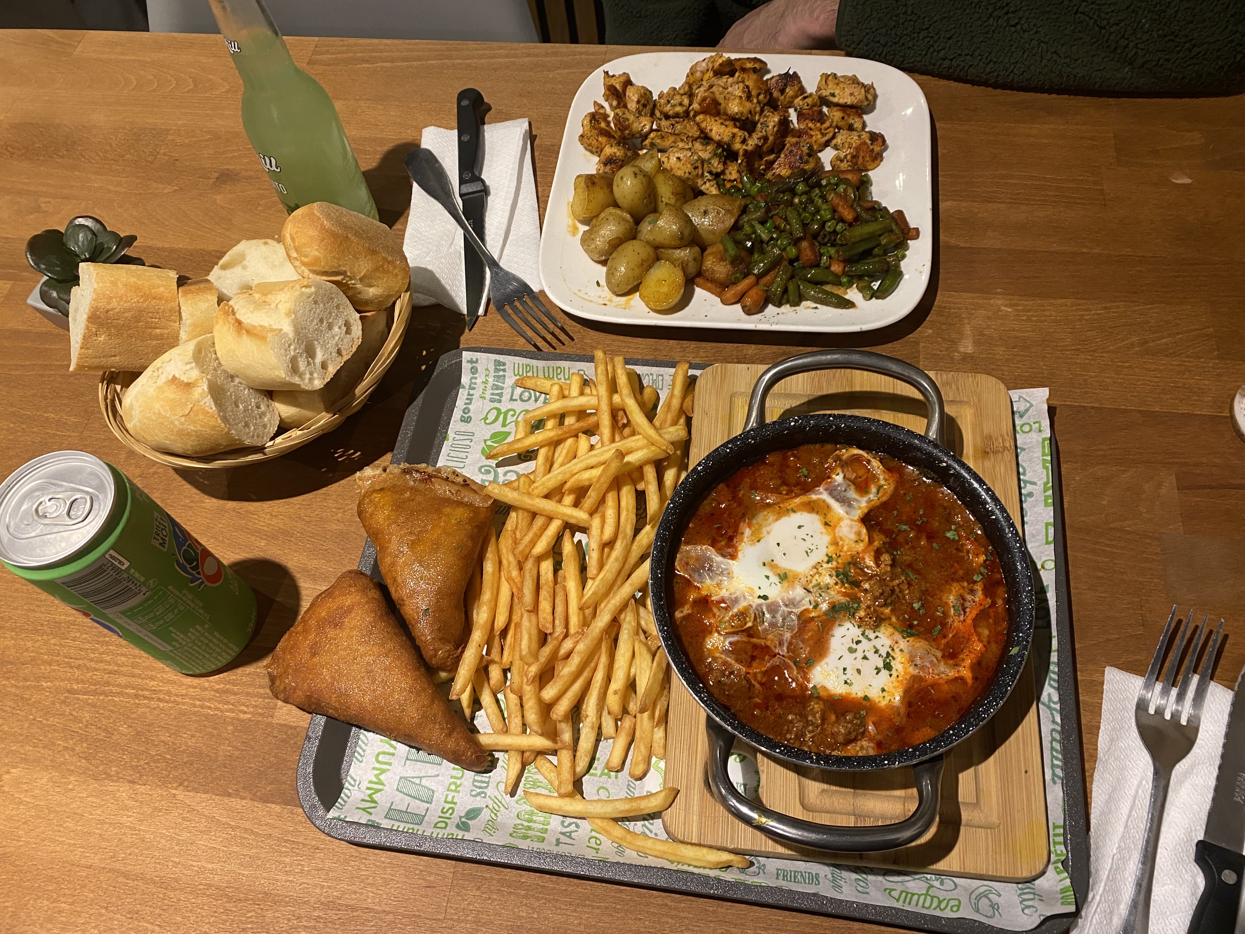 Bonsoir , nous étions 3 ,j’ai commandé un tajine poulet avec des frites avec une salade tunisienne , un couscous royal,frites et une bavette grillé avec une bonne cuisson émincée accompagnée d’une « salade » avec une sauce forestière. Tout était très bon😋servi en 15 minutes. Je recommande fortement , très bon accueil et service . Je reviendrai 😍😍😍😍👏🏽👏🏽👏🏽👏🏽Bravo 👍🏽👍🏽