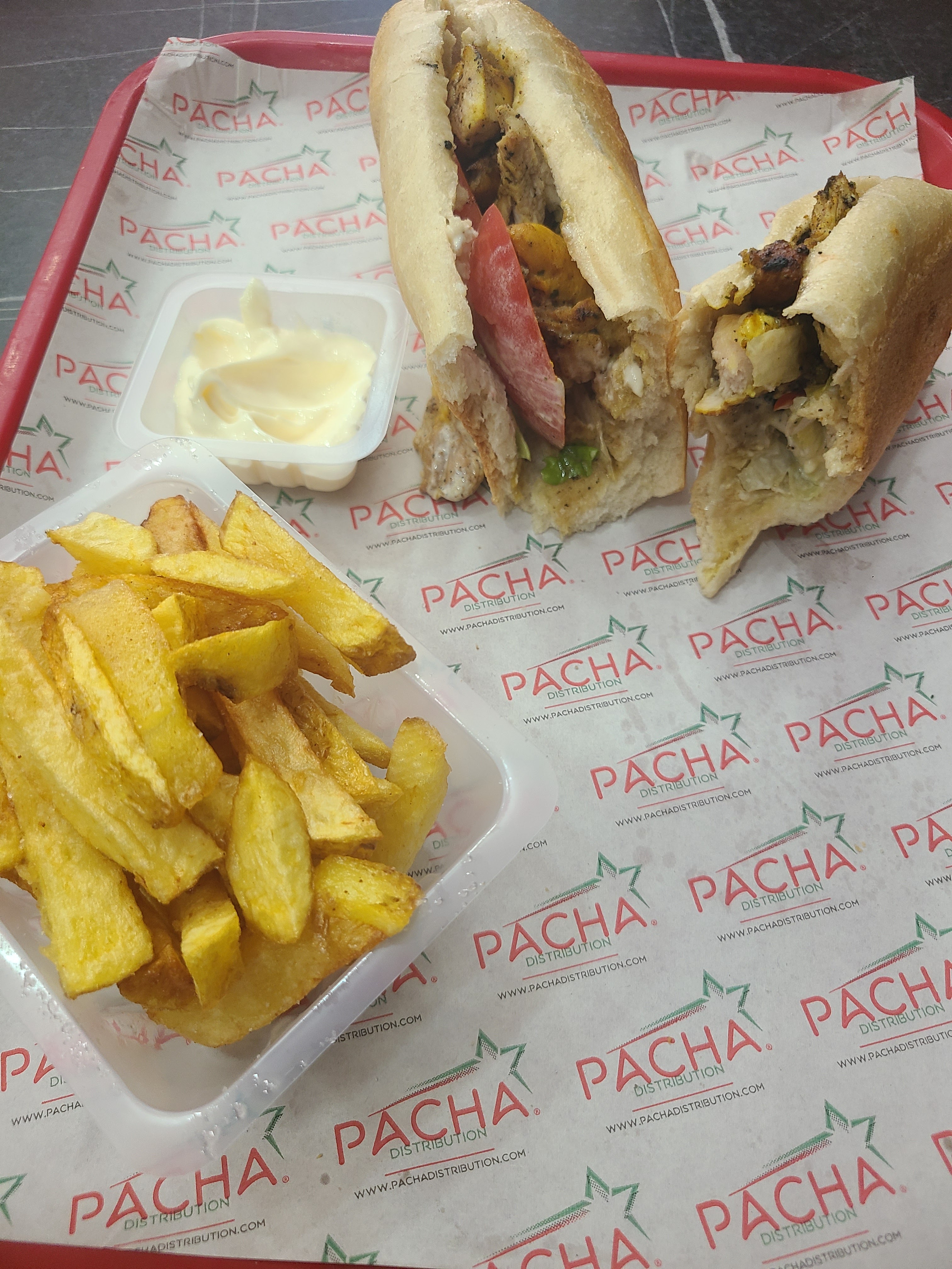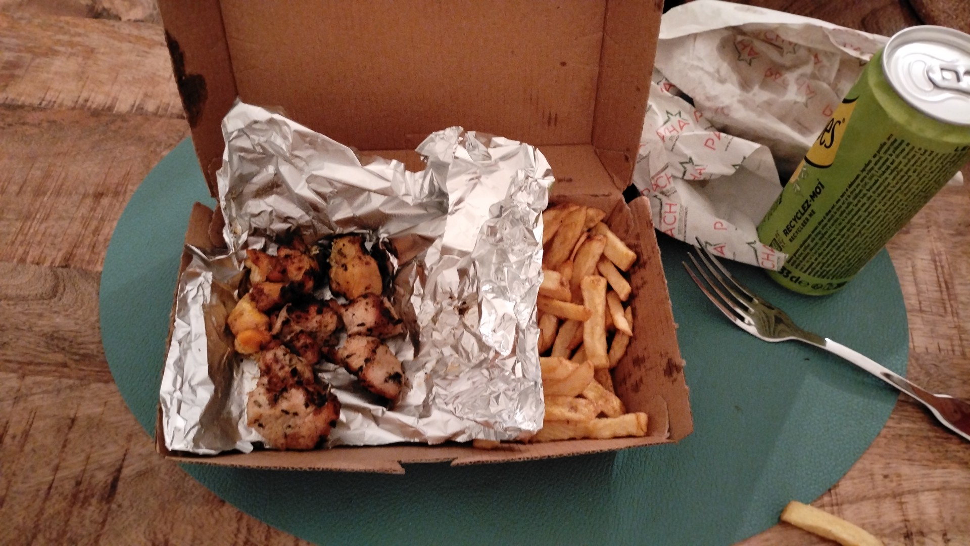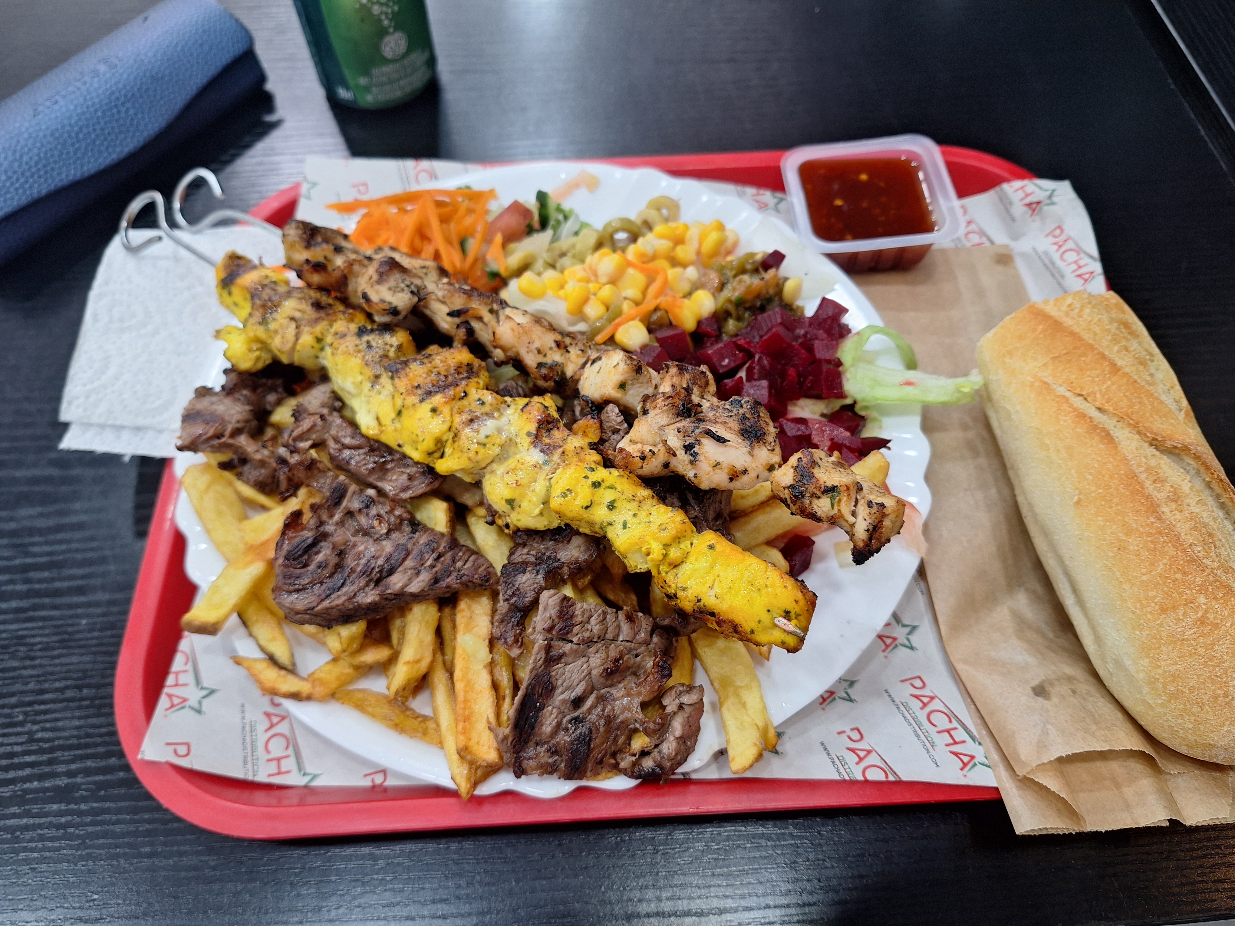 Essayez le poulet mariné grillé au charbon de bois - il y en a environ 5 types - je l'ai eu dans un emballage et ils ont mis à l'intérieur des olives, des poivrons, des frites maison avec des frites à part pour 4,50 € « un truc du fou » comme on dit