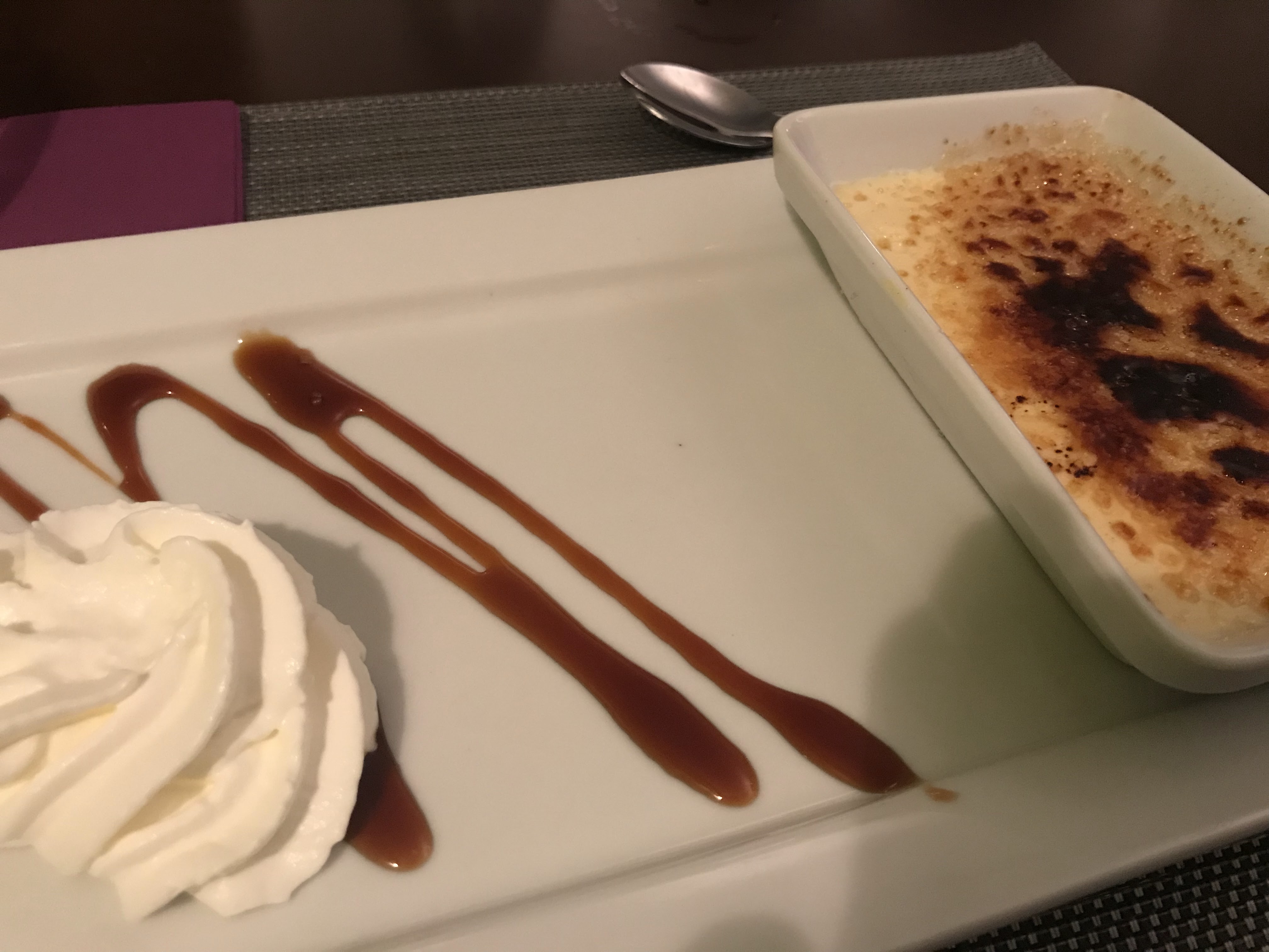 Images : Côtes d’agneaux parfumées au miel et crème brûlée. Positifs : - Une bonne ambiance ; - Efforts concernant la decoration ; - Belle présentation dans l’assiette ; - Possibilité de rapporter le surplus ;(brochettes dans notre cas) ; - Bonne crème brûlée ; - De bonne recommandation ; - Large choix d’accompagnements. Négatifs : - Quelques bouchées avec un arrière goût désagréable venant des côtes d’agneaux ; - On ne sent malheureusement pas tant que ça le miel dans les côtes d’agneaux. - Petite quantité (repas et dessert) ; - Tables grandes (peu d’intimité si repas en famille 5+) ; - Pas de repas pour enfants.