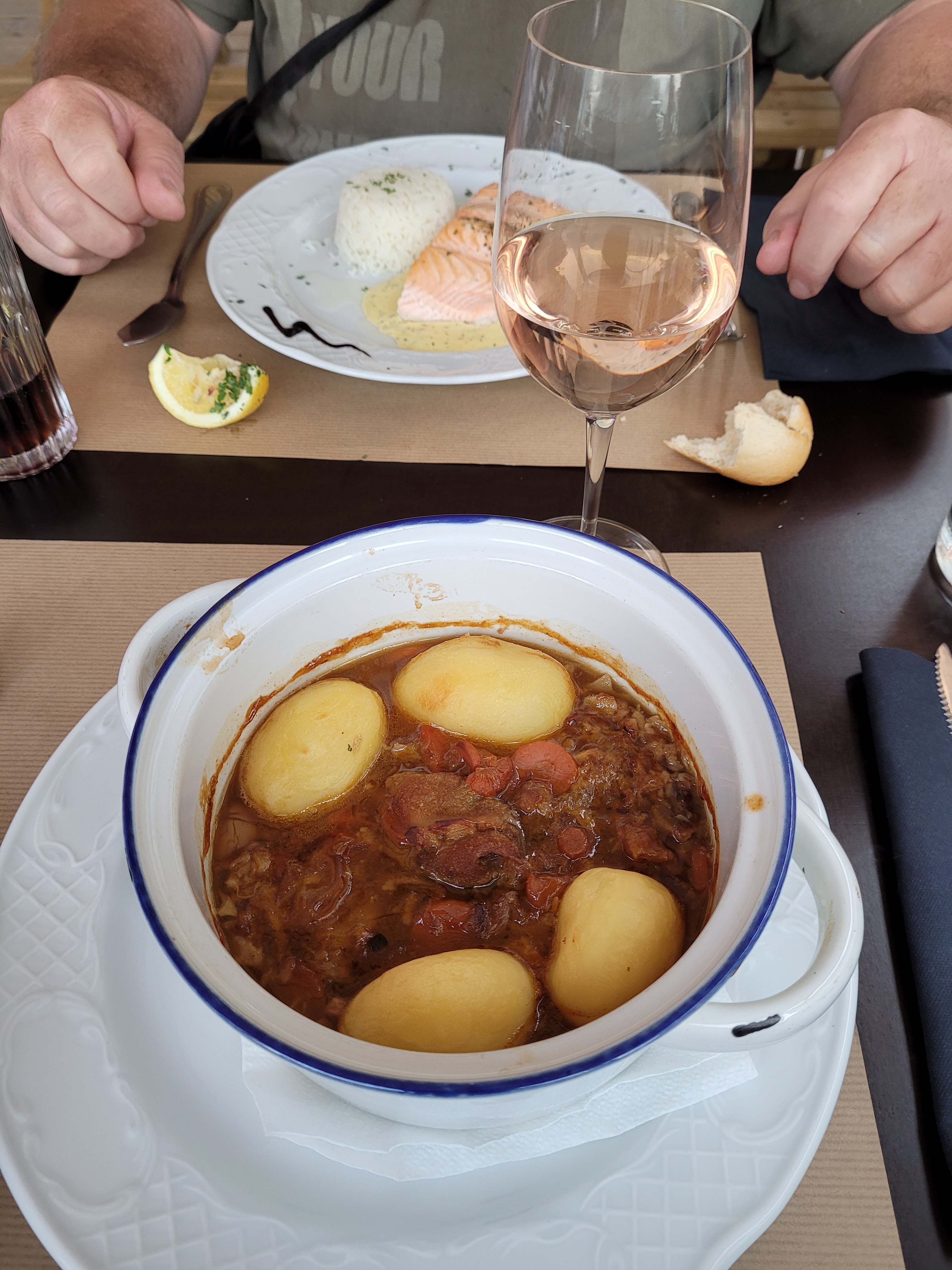 Je suis déçu du menu a 33 euros arrivé 12 h jeudi 12 août . escargots farcies avec au goût très léger sans saveur d ail Bar en surcuisson 'chef le poisson se mange nacré .une bière stella commandé une leff 🥳🤓 reçu 🤓 domage pour la note mais je pense justifier ' le vin blanc se sert dans un seau frais car pas bon le vin blanc chaud