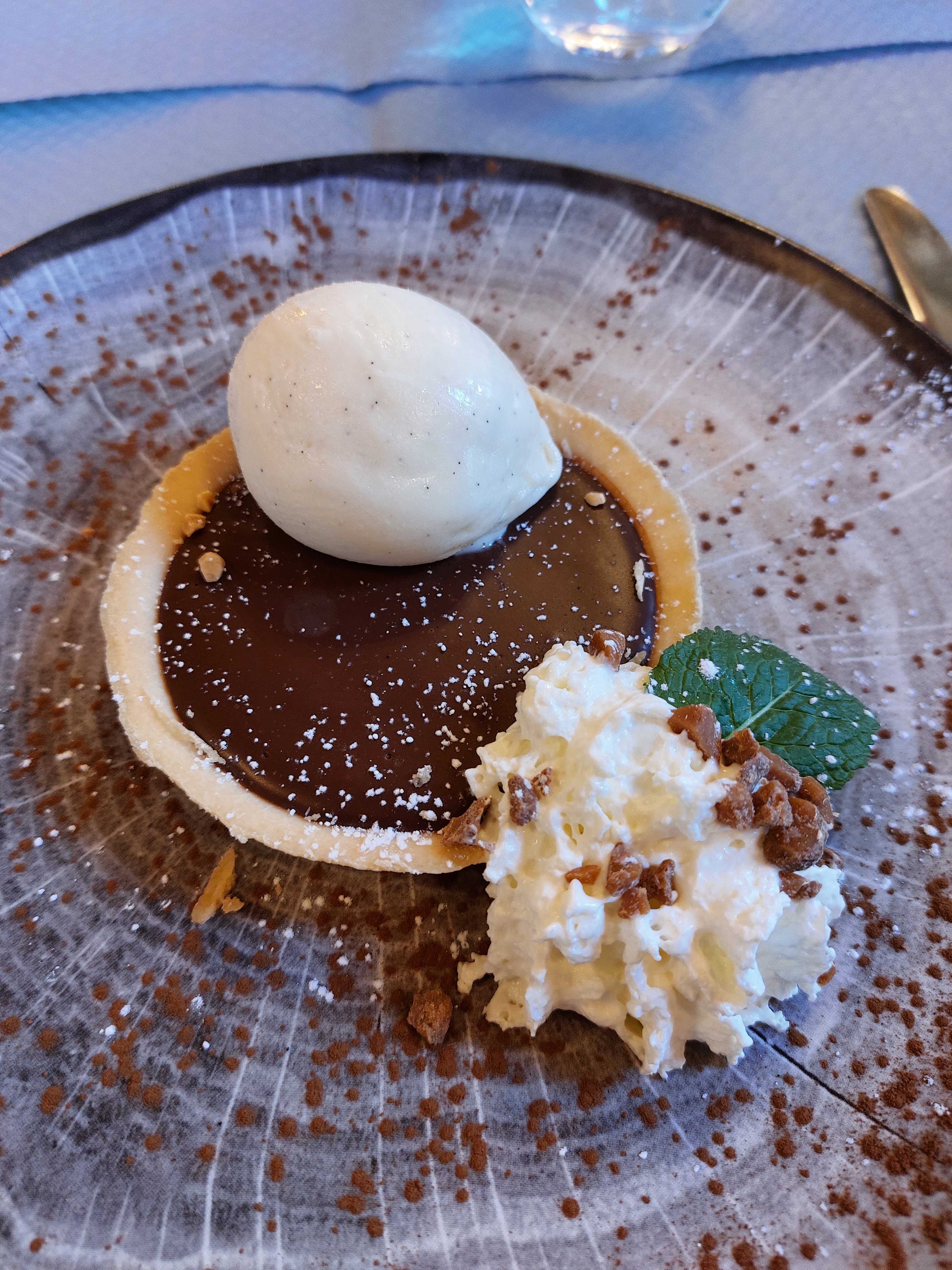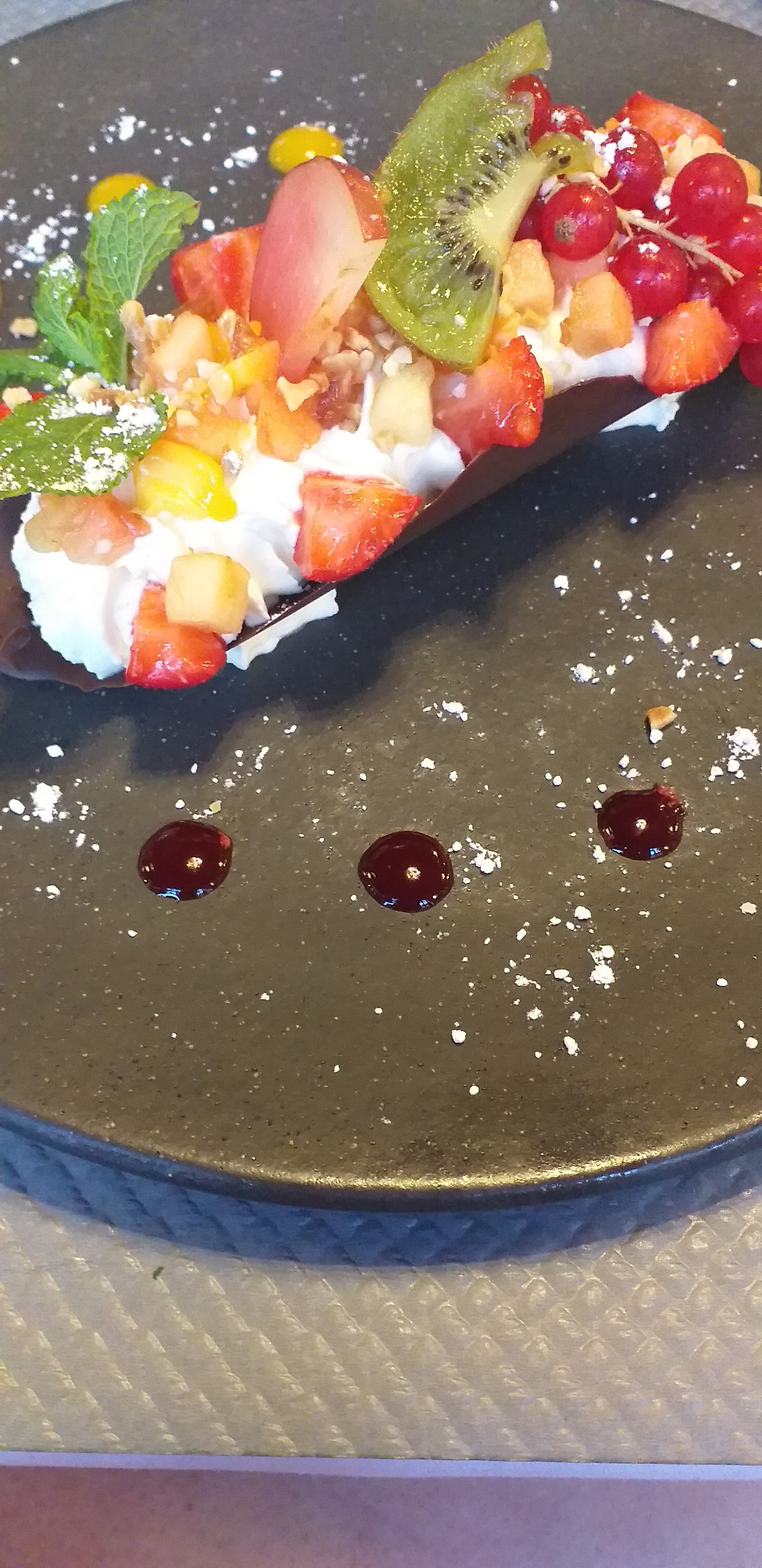 Accueil très sympathique, service parfait et très bon repas, dessert : tuile au chocolat et ses fruits : un délice 😍.