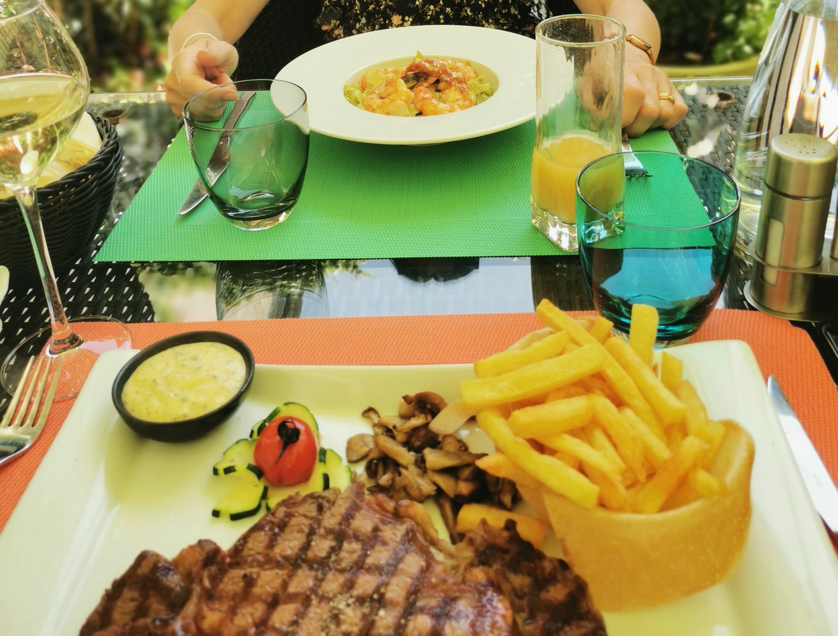 Nous pensions déjeuner dans un restaurant gastronomique. Or, il n en a rien été. Meme si le cadre de la terrasse était agréable nous avons été gênes par un balai incessant d avions volants au dessus de nos têtes. Les amuses Bouches étaient quelconques et non réfrigérés pour exemple celui fait à base de melon. Nous avons pris 3 menus saveurs différents proposés dans le menu à 40 € 1 piece de bœuf avec frites, côtelettes d agneau avec pommes de terre rissolées baignant dans une sauce relevée et un plat de pâtes au saumon au gout insipide. La sauce des cotelettes et le pommes rissolées furent appreciees par mon conjoint, je me suis contentée des côtelettes qui étaient délicieuses mais qui ont été à l origine de nausées à notre retour à la maison nous obligeant à nous allites. Les 2 jours suivants furent également des journées difficiles où l envie de vomir etait constamment présent. Les jours suivants nous fûmes atteints d une gastro entérite qui dura 10 jours et l obligation de consulter le médecin pour recevoir les medications adéquates et notamment des antibiotiques. La note payée pour ce repas d anniversaire de 222 € particulièrement salée compte tenu du peu d originalité dans les plats proposés des jours et nuits de mal être et pour finir les frais medicaux y afferents car il n y a aucun doute l origine de nos désagréments digestifs proviennent d un manque d hygiène notable dans ce restaurant. Hygiene que nous sommes en droit d exiger chez tout restaurateur et particulièrement chez ceux qui se targuent d etre gastronomique. Le seul point positif est l attention fête à l occasion de cet anniversaire dont nous ne garderons pas le meilleur souvenir. Il va s en dire que nous n y retournerons plus et nous vous le déconseillons.