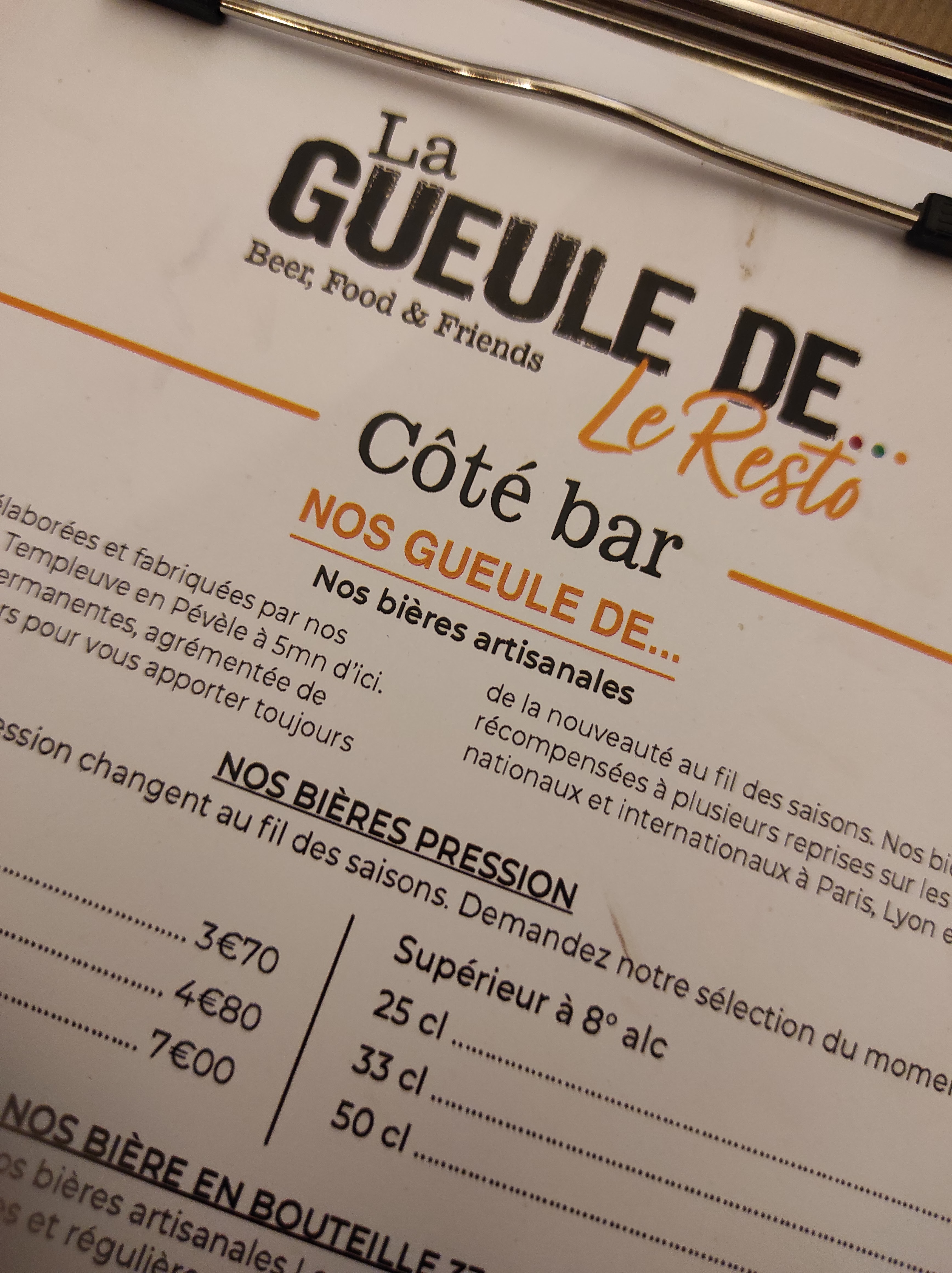 Très belle découverte en plein centre de Templeuve. La brasserie « la gueule de » a eu la bonne idée d’ouvrir ce petit restaurant et c’est une réussite. Une belle décoration, une carte simple mais avec d’excellents burger et viandes (onglet!). Les bières sont excellentes ! Le plus, des jeux à disposition pour agrémenter le repas.