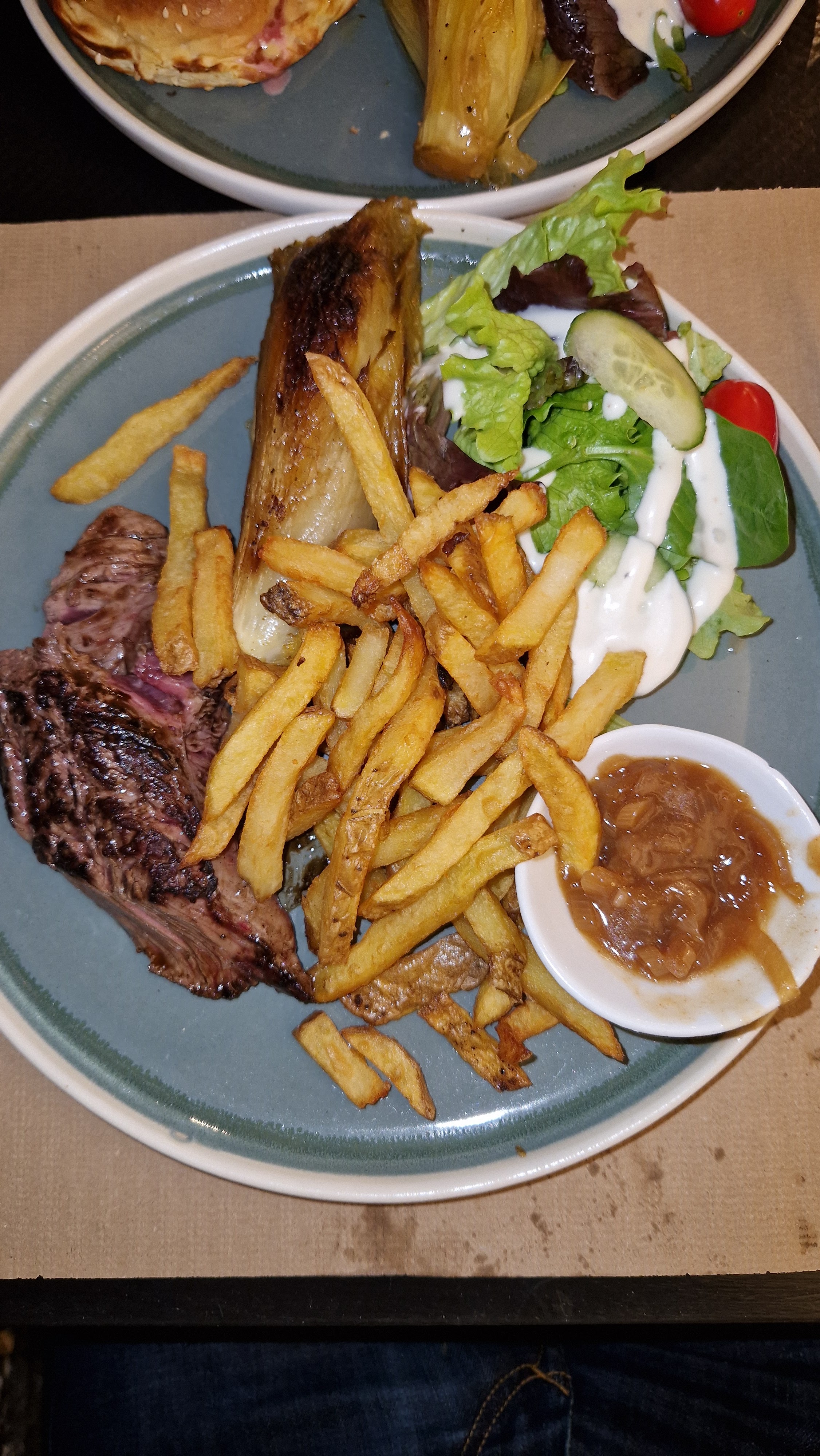 Excellent moment passé en famille, un samedi soir. Table ronde, conviviale dans une ambiance très sympathique. Possibilité de prendre un jeu de société, ce qui est très appréciable ! Cela fait penser à une ambiance d’estaminet moderne… Le service est irréprochable, le personnel est à nos petits soins et fort sympathique. Pour mon anniversaire ils m’ont offert un saucisson sec pour accompagner l’apéritif. La cuisine est généreuse et de très bonne qualité. Ce sont des vrais steaks de chez le boucher et des frites maison il me semble, ce qui n’est pas si courant. De même pour les menus enfants, ce sont de vrais plats, très copieux et de très bonne qualité. Je recommande à 1000 % ! Pour ceux qui aiment la viande et la nourriture, style estaminet.