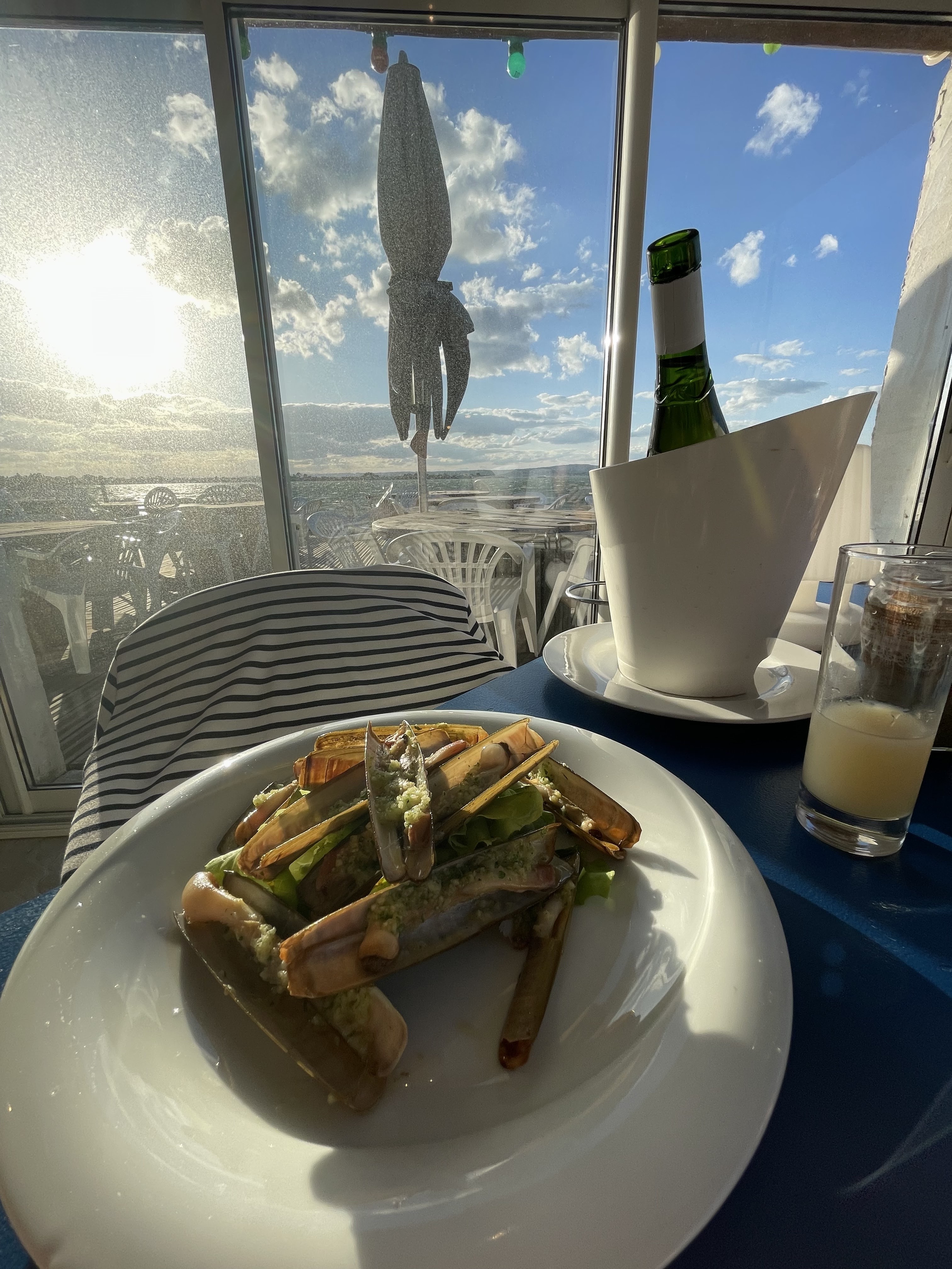 Soirée au bord de l etang ,bon accueil.Couteaux en persillade et sèches grillés Délicieux sauf moules trop cuites ...dommage