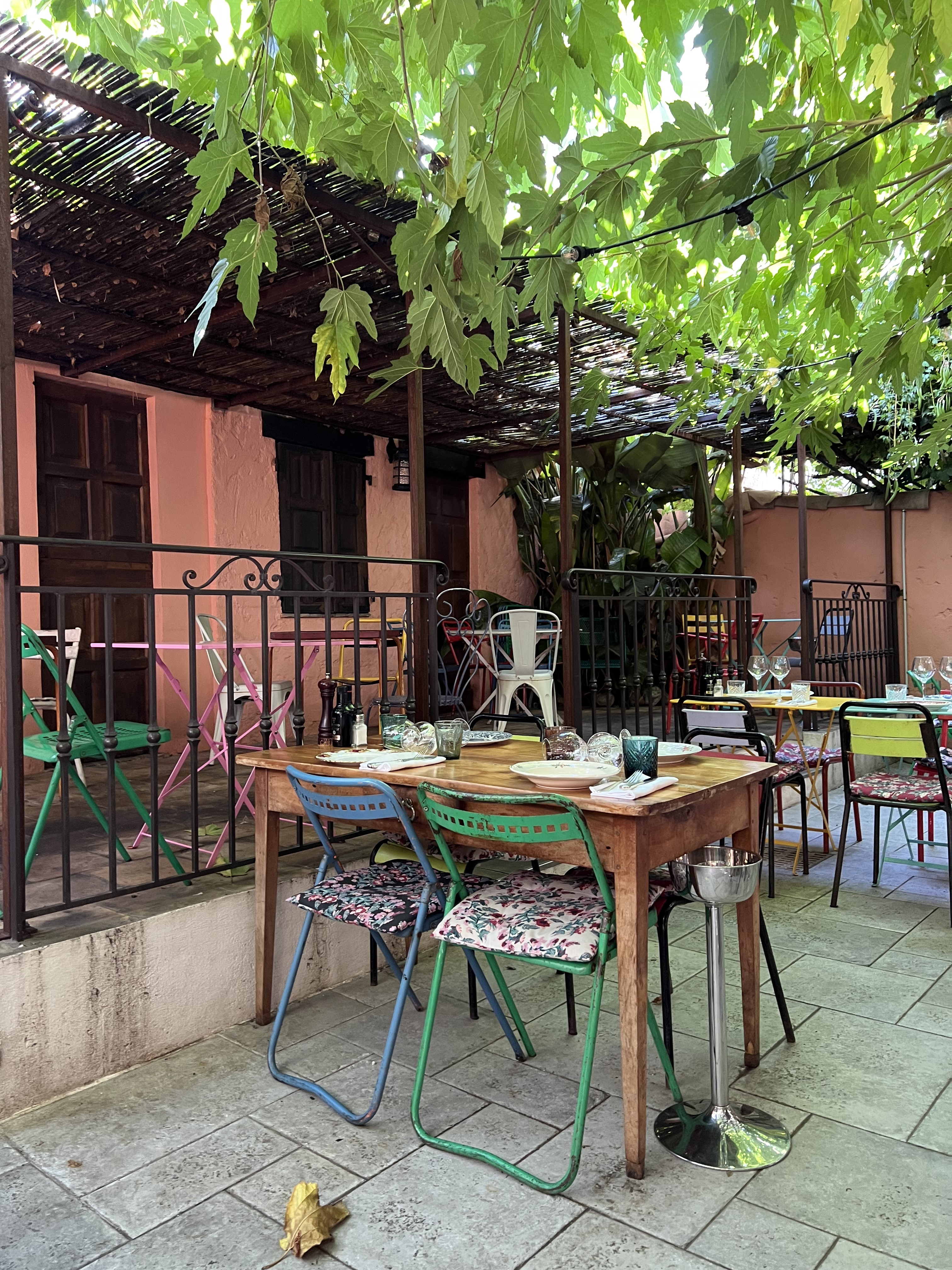 Déjeuner ou dîner dans la cour en dessous des arbres est juste hyper dépaysant. La cuisine italienne et française est très bonne et il y a une bonne ambiance.