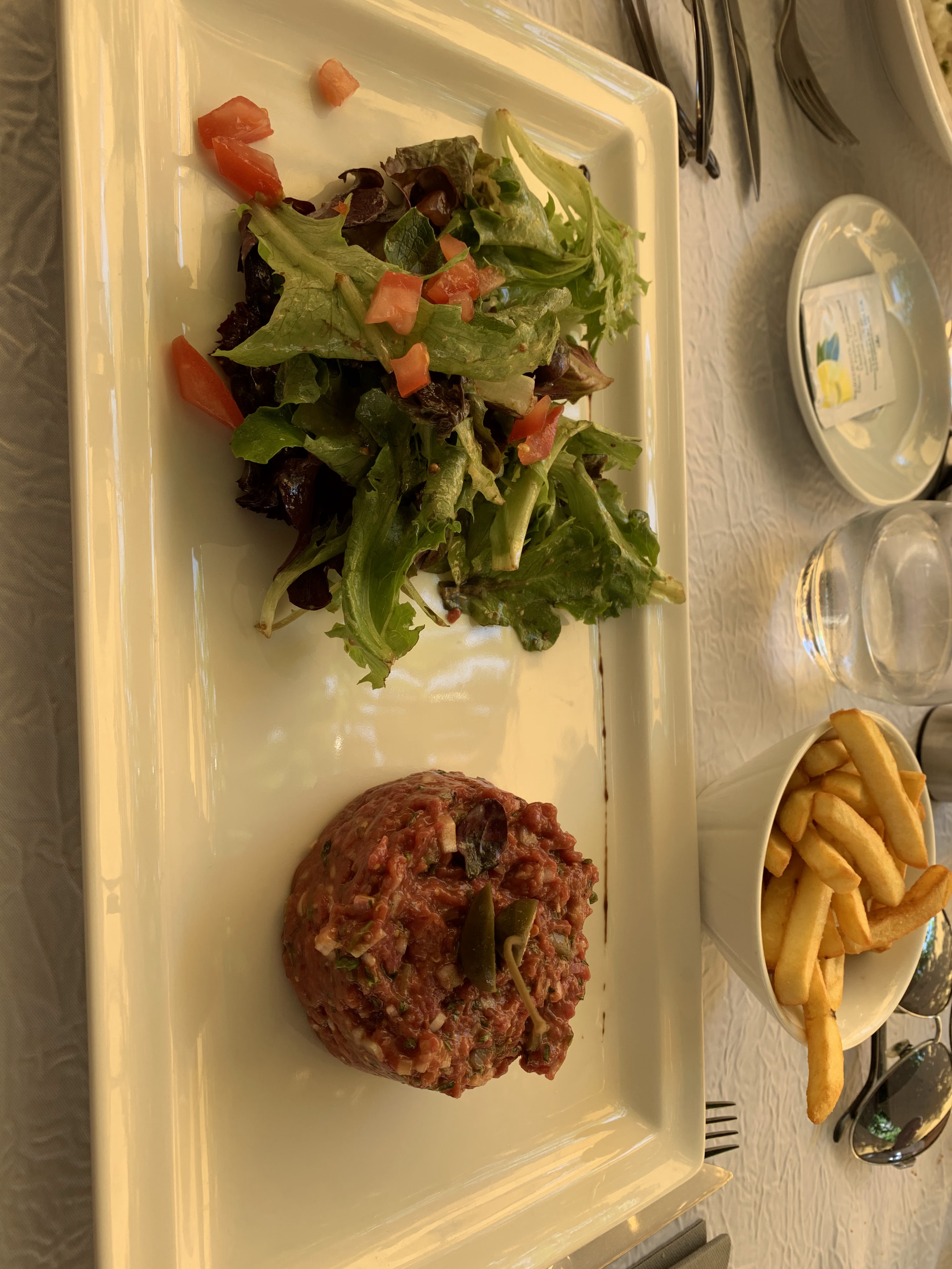 Un cadre agréable et un tartare délicieux à un prix raisonnable ! Un peu déçue par le café gourmand copieux mais aucun dessert de la carte . Ah oui le café à 3 euros c’est légèrement exagéré même si nous sommes à Antibes ! Par contre les frites top 👍