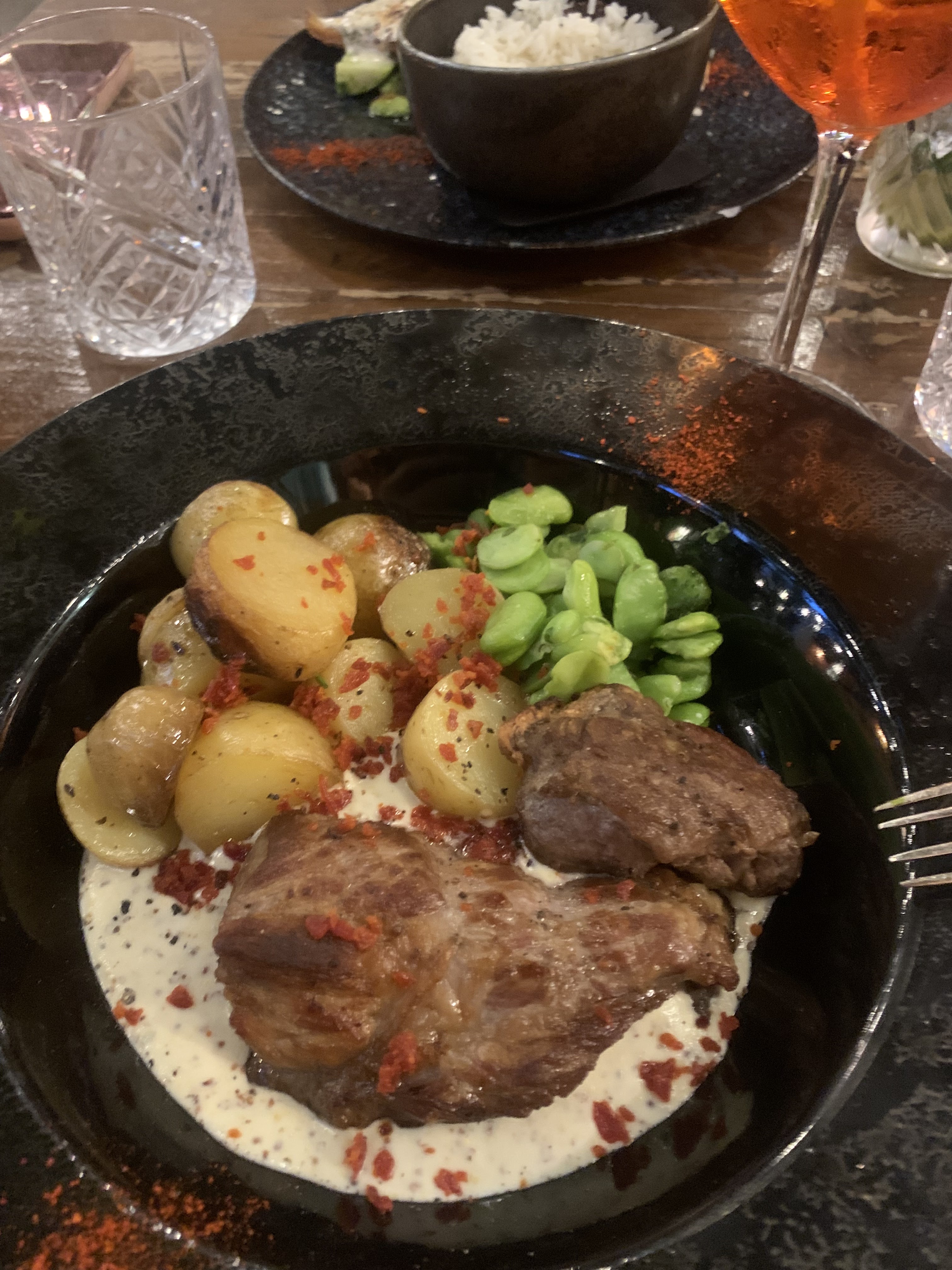 J'avais envie d'en profiter pour une soirée sans bébé avec ma femme, j'ai attendu 40 minutes avant même qu'on me demande un verre, quand la table de 3 jeunes femmes a fait venir le serveur 3/4 fois avec un service qui semblait être un excellent service… … . La côtelette de veau était sèche comme un os (ce veau n'était en aucun cas ou du moins pas proche de la qualité en payant 32 €). Je n’en ai même pas mangé la moitié et j’ai dû mettre des frites au four en rentrant à la maison. L'ambiance était agréable mais malheureusement la nourriture était horrible.