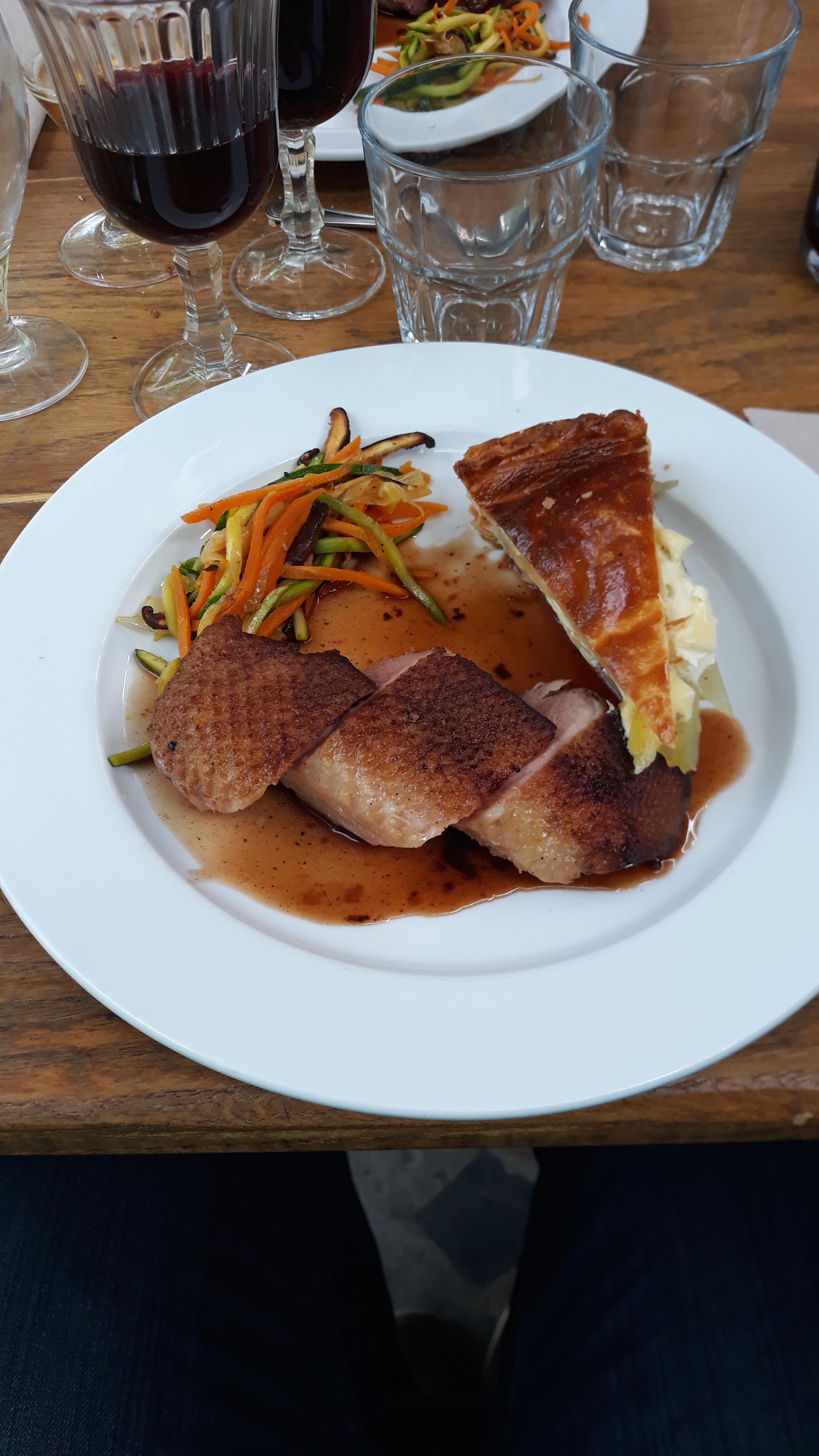 Nous avons pris le menu du jour avec un excellent gaspacho en entrée et un très bon dessert. Le veau est accompagné d'une sorte de quiche avec de l'estragon succulent et original. Je recommande. Bravo pour le service très prévenant malgré un gros service à effectuer.