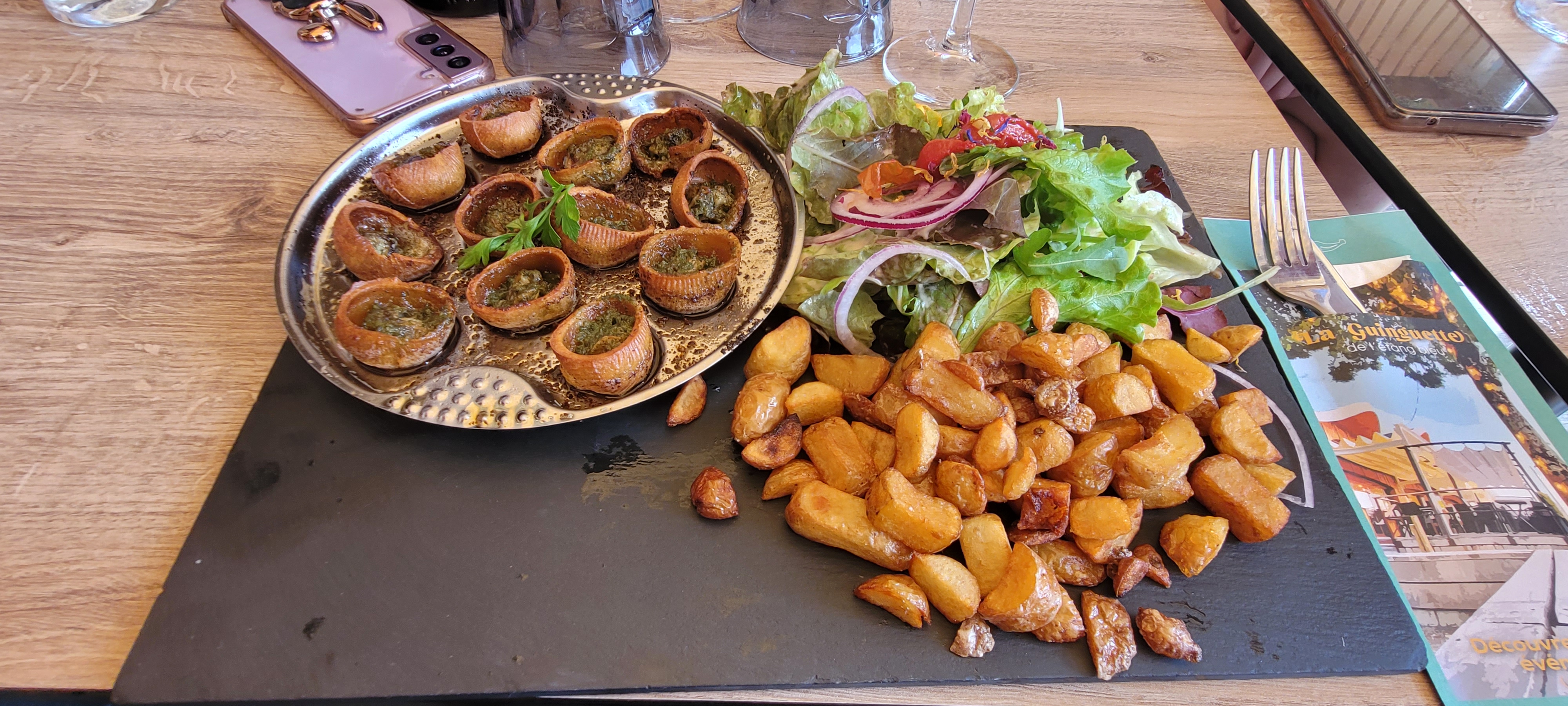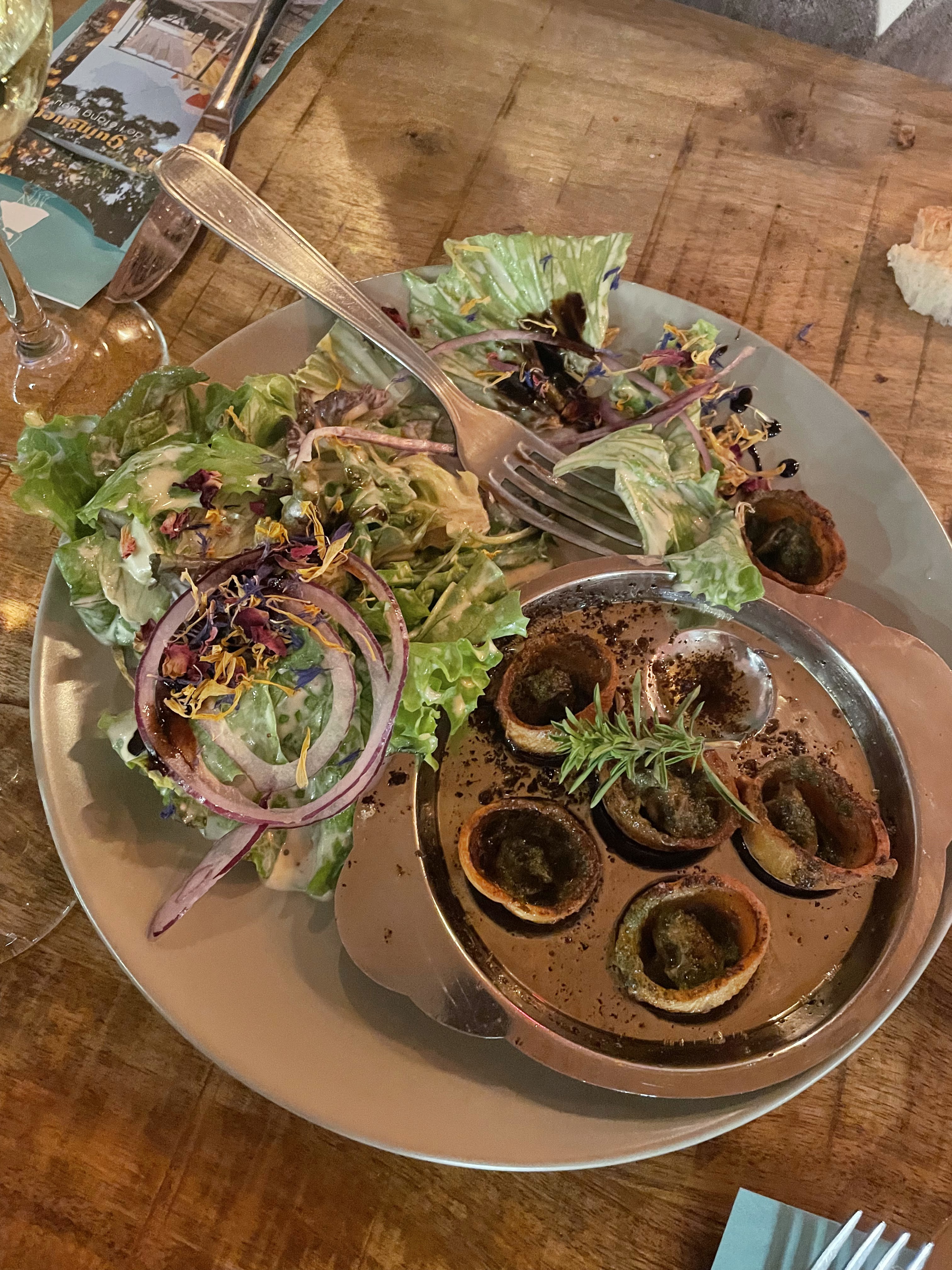 Limace dans les salades (2), repas très gras et très salés, peu copieux, assez cher, 1heure et demi d'attente pour de la ratatouille et un filet de perche baignant dans l'huile. Fantastique!