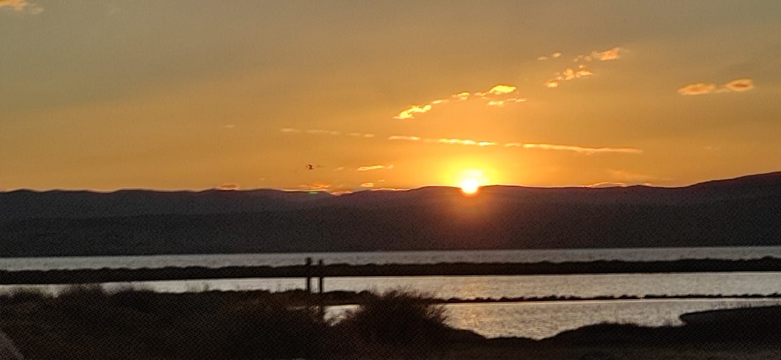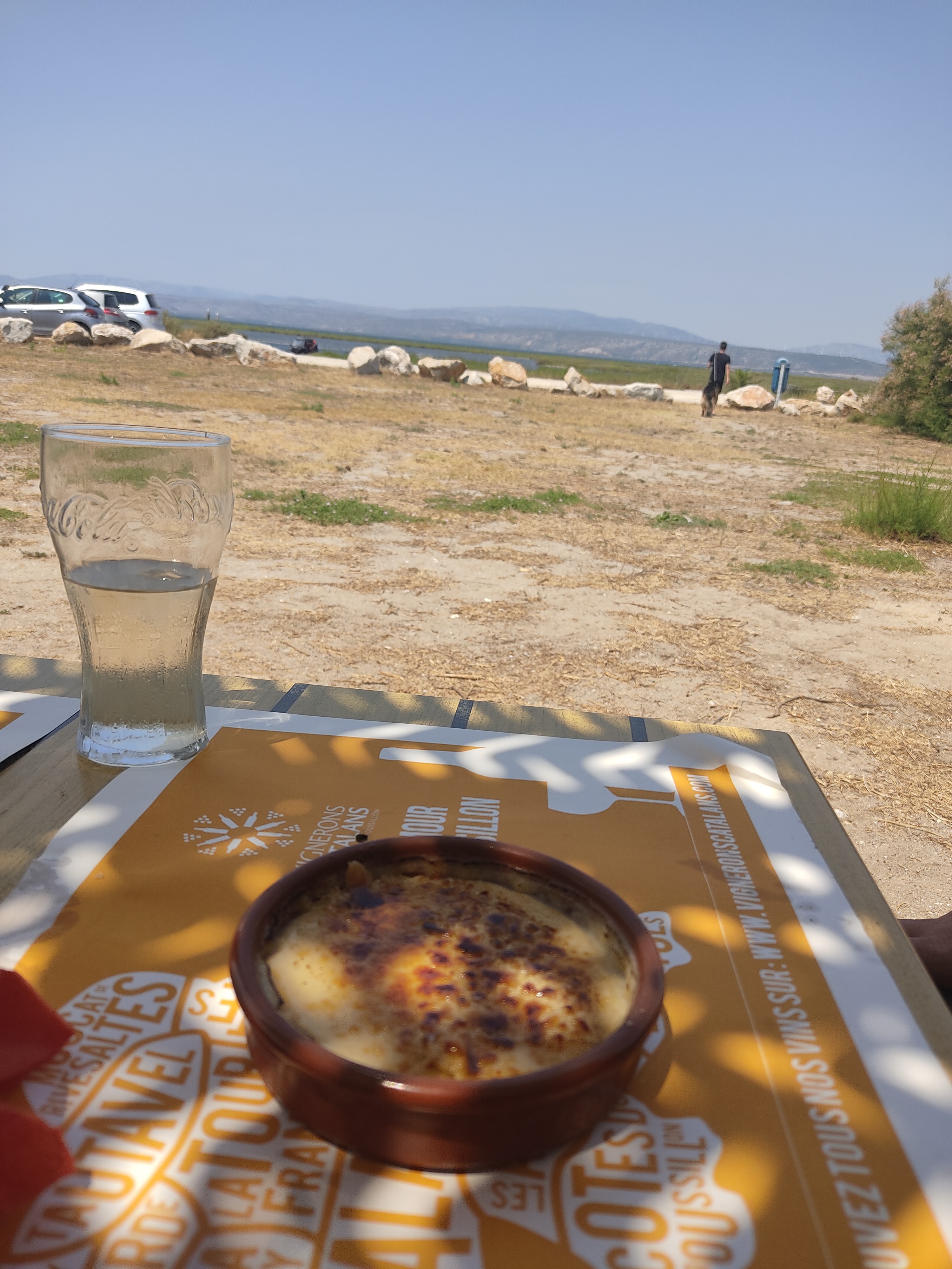 Nous avions pris le soin de réserver, pour 2 personnes. La déco du resto est inexistante, mais il y a vue sur l'étang, et sur la gauche le superbe Canigou au loin. À l'arrivée, on nous place tout de suite à une table en extérieur. Il y a du monde, mais le restaurant n'est pas plein. Rien sur notre table, pas de menu. Les menus, ils sont empilés sur une table dans l'entrée. Un personnel nombreux s'affaire, passe à côté de nous, sans jamais nous voir. On essaye d'appeler leur regard, en vain. On espère un menu, pour commencer à choisir, au moins. Pour passer le temps, je finis par quitter la table et je vais prendre le fameux coucher de soleil sur l'étang en photo. Bon. Voilà. Je reviens à notre table. Toujours rien, au bout d'un bon quart d'heure. La table reste vide. Belle constance aussi au niveau de l'odeur légère mais insistante d'étang ( une odeur de vase pas très agréable) qui flotte dans l'air, quand on est à table en extérieur. Finalement, on est parti, sans même avoir pu voir le menu. Au moins on aurait eu de la lecture pour patienter.
