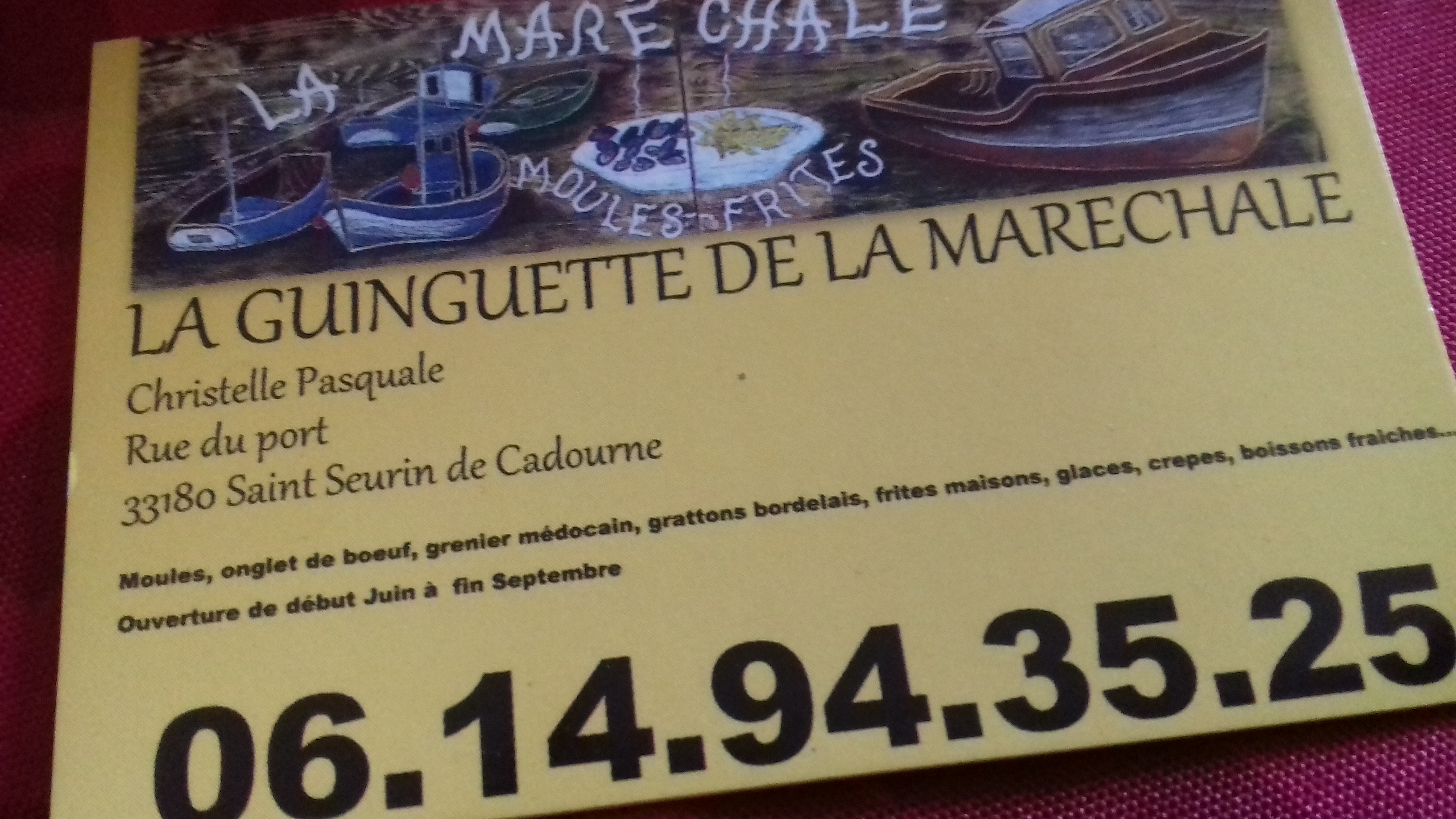 Voici toutes les informations sur le Restaurant La Guinguette De La Maréchale qui ce trouve au Rue du Port, 33180 Saint-Seurin-de-Cadourne (33). Sur cette fiche vous trouverez les photos, l'adresse, les horaires d'ouverture, le numero de téléphone et les avis clients.Vous pouvez églement rédiger un avis si vous le souhaitez en bas de page.