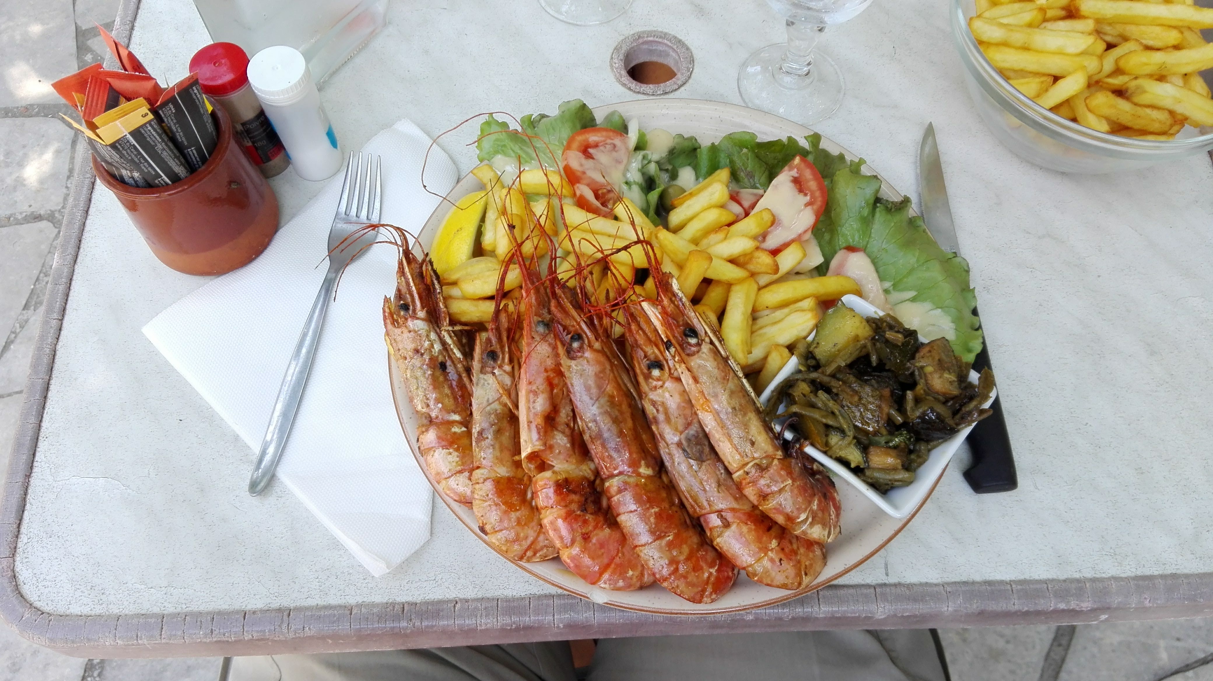 Acceuil sympa, gambas très bonnes et copieuses, tables à l'ombre, parfait après une baignade le matin