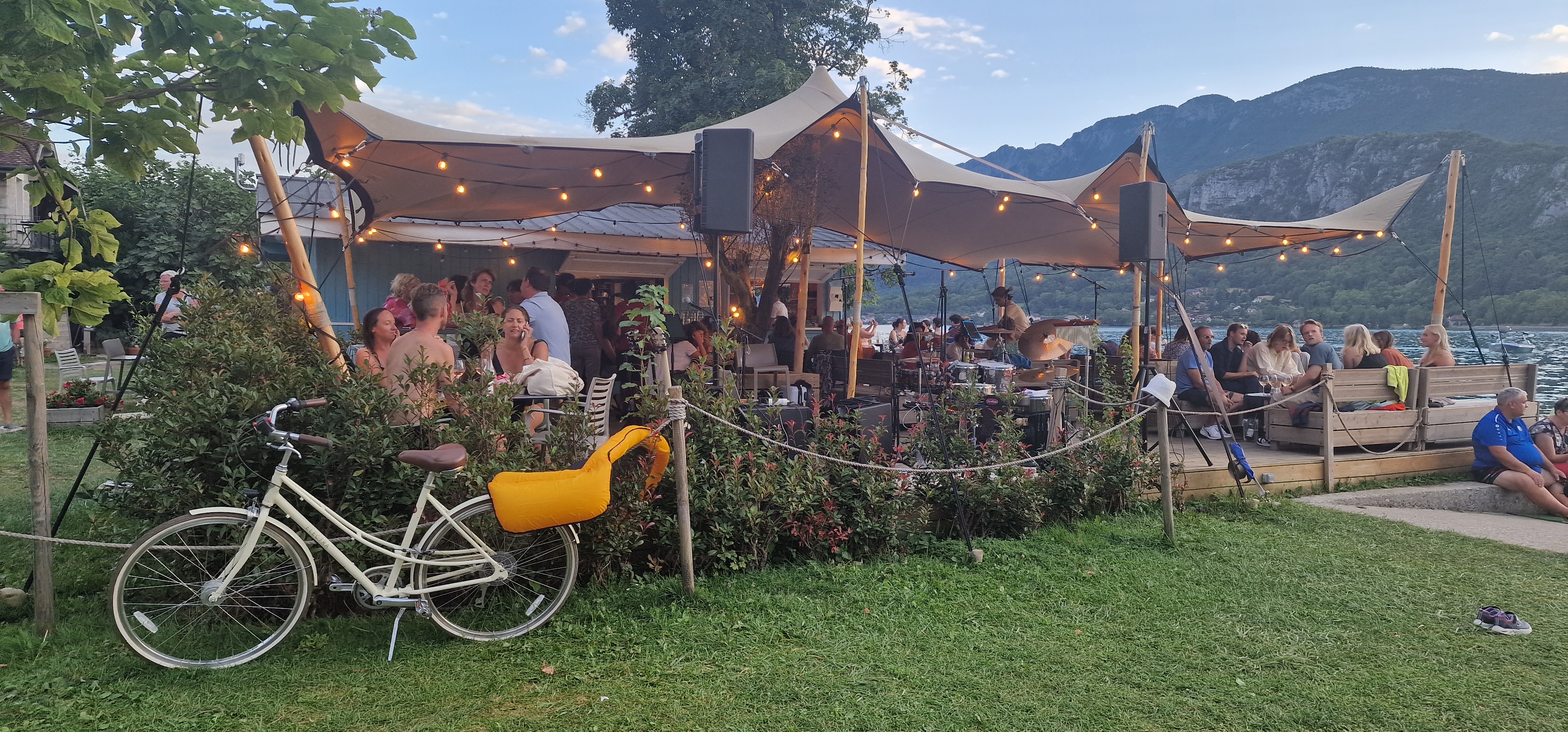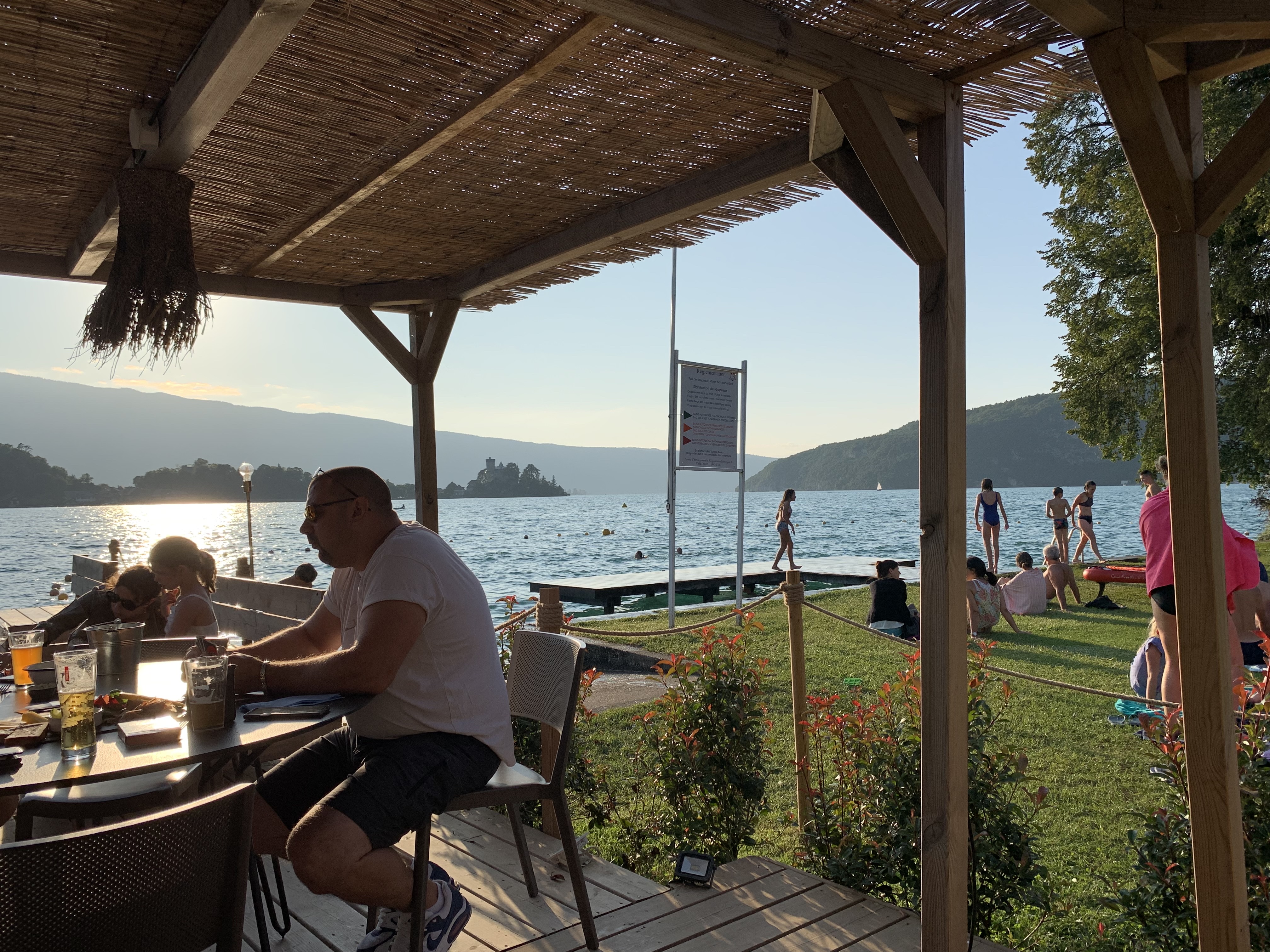 Lieu de détente et de farniente au pied du lac d'Annecy idéalement situé pour admirer le coucher de soleil. Beaucoup de monde une réservation est nécessaire le service est assuré par des jeunes en emploi saisonnier donc un peu d'indulgence à prêt tout c'est les vacances. Les prix sont correct, les plaches a partager sont bien garnis avec des produits frais et locaux.
