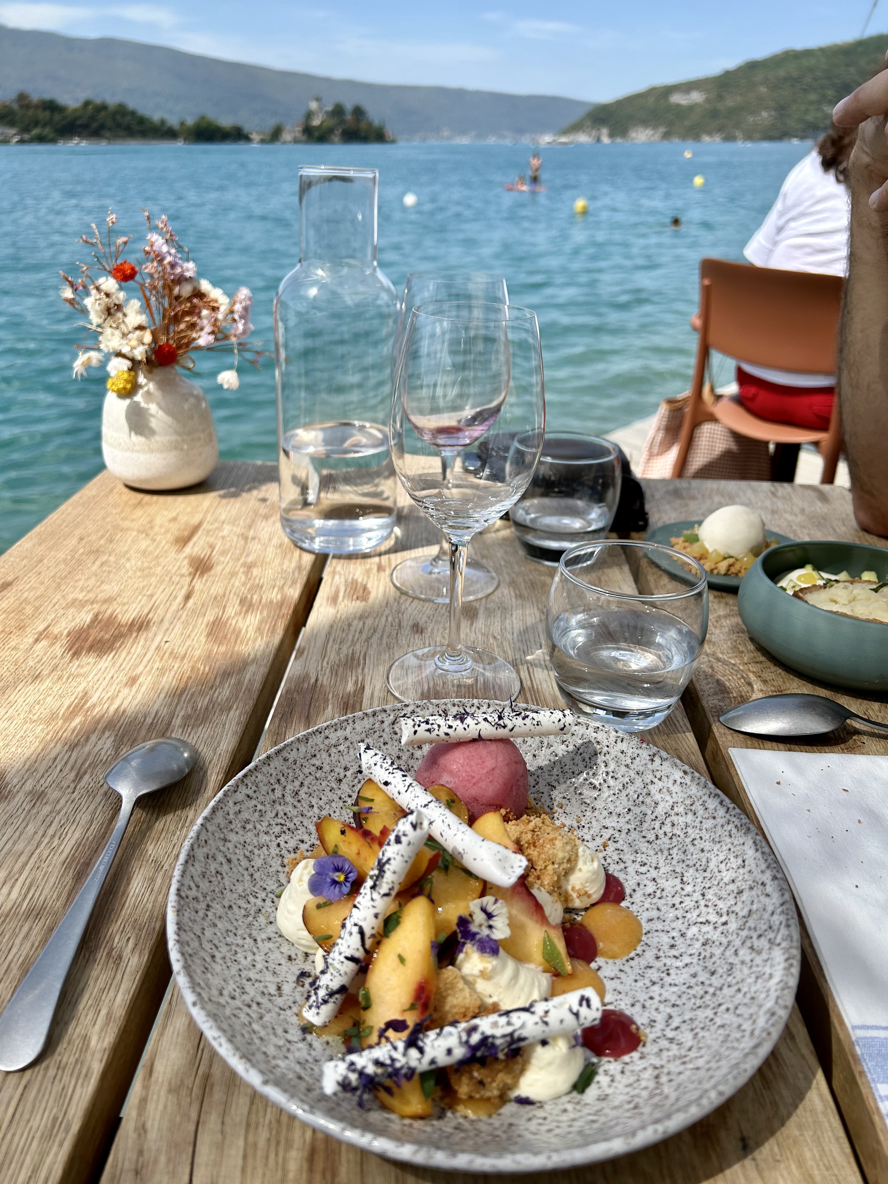Expérience en journée parfaite ! Du thé glacé maison, tranquillement posé au bord du lac, au déjeuner composé de produits frais et locaux cuisinés sur place, toujours dans un cadre aussi délicieux que le contenu des assiettes, la guinguette des Cassines a enchanté ma journée ! Et les glaces artisanales sont également fofolles ! Bref, juste à côté d'une petite plage pour bronzer et se rafraîchir dans le lac, c'est un peu THE spot de ce séjour annécien !