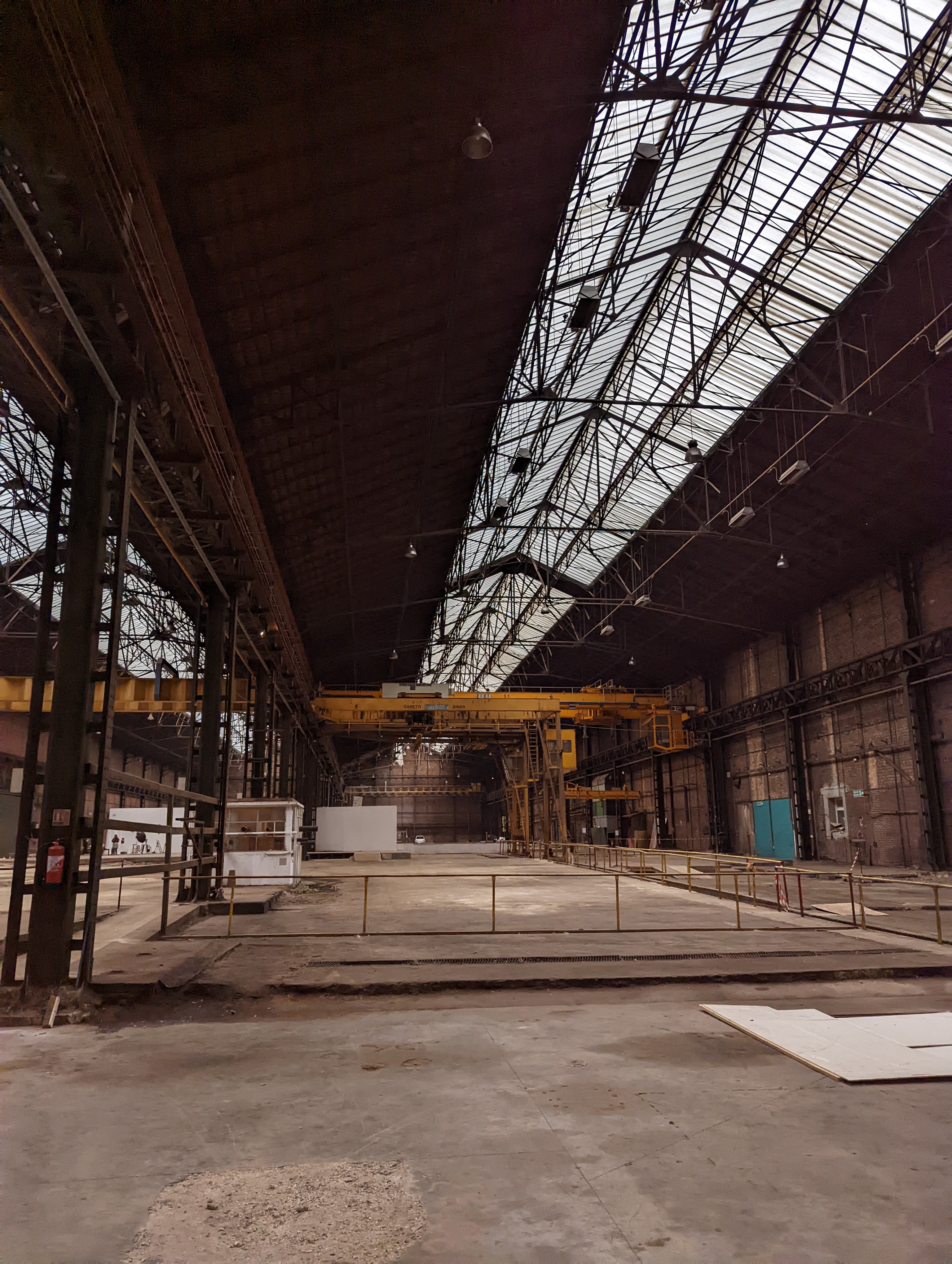 Exposition des étudiants en arts décoratifs en cours à l'hiver 2021/22 dans cet immense hangar qualifié de grandes serres, voire de cathédrale industriellepar ses animateurs. Abrite des Résidences d'artistes. Un beau réseau topographique de lianes court sur les parois translucides de cette structure. Très bien - et si surprenant - qu'elle n'ait pas été démolie... #parallelespotentiels