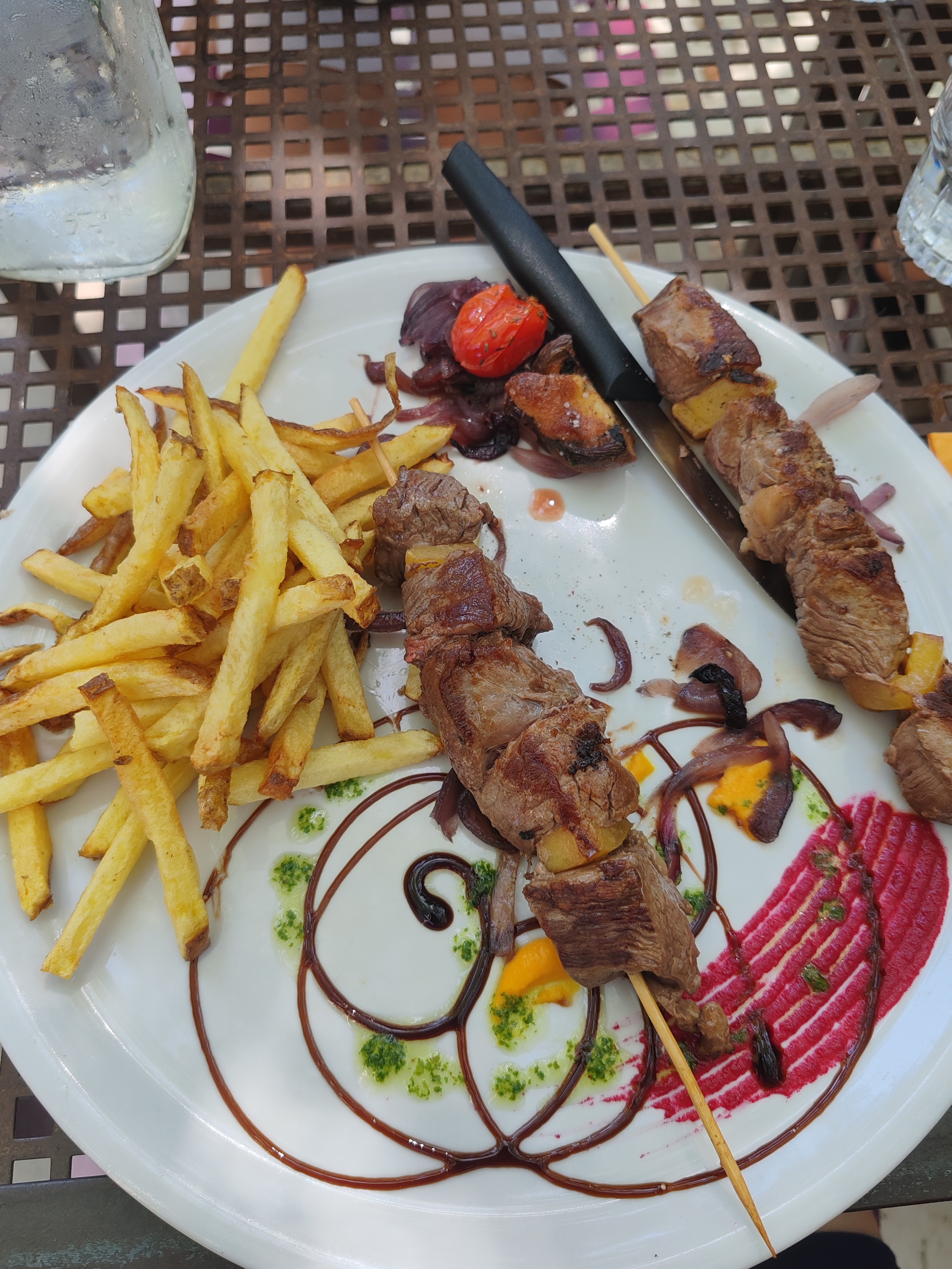 Un joli moment avec vue sur le lac, à l'ombre et dans une douce ambiance. De bonnes brochettes avec une cuisson parfaite et de bonnes frites maison!