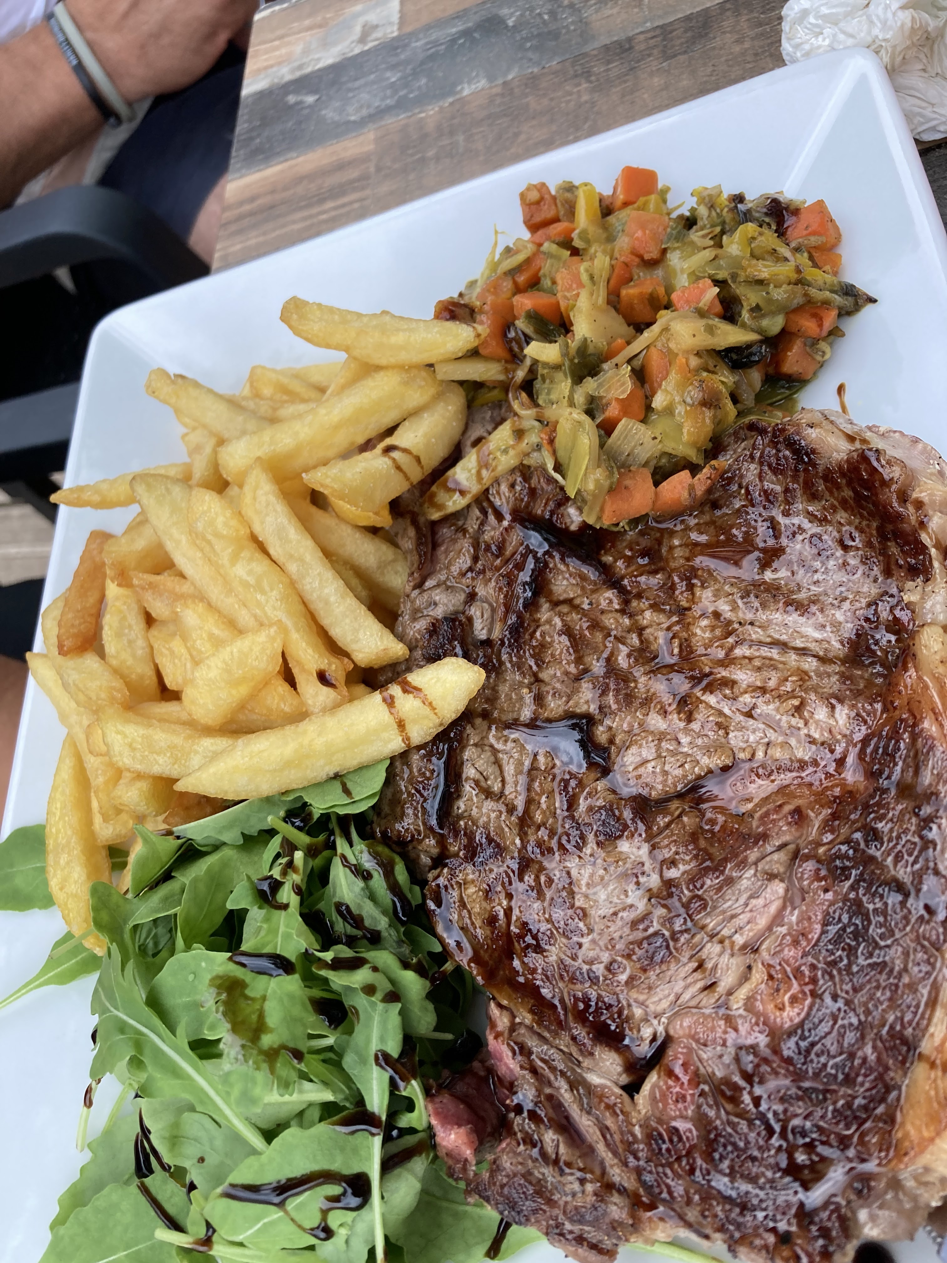 Serveur très gentil mais mou pour un mois d août. Mais vraiment le plat un échec total (pièce du boucher) viande servi avec beaucoup de crème de vinaigre balsamique dessus accompagné d une sauce froide (arrêté ce massacre svp) !! Riz sans aucun goût et sec, des spaghetti de carottes crû... poêles de légumes et tomates provençale qui relève légèrement le niveau. Bref dessus de notre dîner malgré un cadre sympa