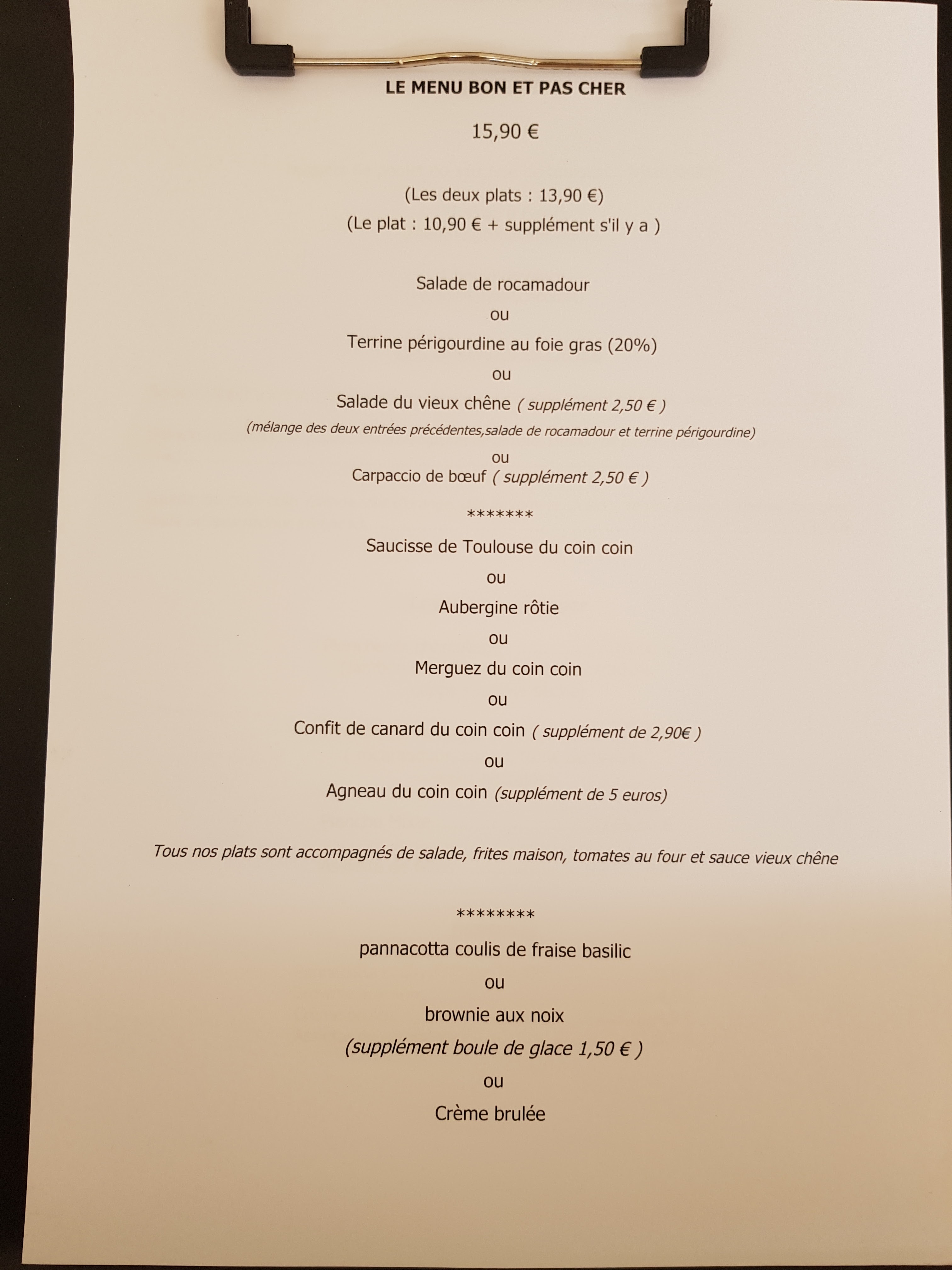 Heureusement qu'il y a le cadre... Le slogan sur l'ardoise et la carte : bon et pas cher. Une erreur a dû se glisser sur la position du pas. Attente interminable, erreurs de plats, la tranche de pain toastee du rocamadour est en fait une tranche de pain dure et rassie. Cuisine en deçà des pires fast food. Personnel et employeur indisponibles. Un patron avec un polo noir sale et taché. Pour avoir connu ce restaurant avec les anciens propriétaires, quelle décadence.