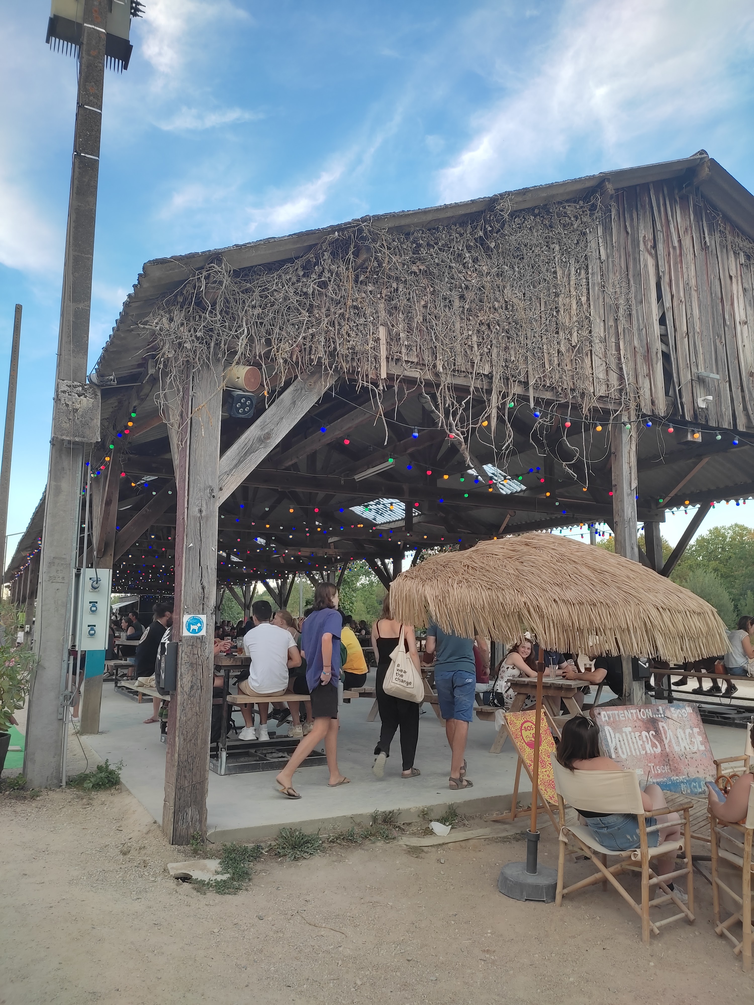 On ne fait qu’attendre. Pas assez de points de vente au vu de la capacité en période estivale. Les difficultés pour y accéder ne sont pas de leur fait mais quand des difficultés reviennent pour se servir rapidement des boissons (qui sont d’ailleurs à des prix équivalents à des endroits où on nous sert, ça dérange) avec un staff désagréable qui prend de haut à chaque question, ça embête. Pire encore, l’attente pour commander de la nourriture aux food trucks. On attend, on attend, on attend. 5 food trucks pour faire manger tout le monde, y a embouteillage. Mais alors quand en plus des membres du staff ou direction se permettent de passer devant les clients (une quinzaine qui attendent pour commander patiemment depuis déjà trop longtemps) en donnant un bon de commande perso format A4 alors qu’on nous annonce 30 min d’attente minimum pour des pizzas, ça passe plus. On se rabat sur un food truck libanais : cuisine et attente correctes ici. L’ambiance est sympa avec le thème guinguette, il y a du monde qui se mêle entre le lieu public et le lieu commercial ouvert. Mais les installations semblent usées, voire complètement cassées. Une première et dernière