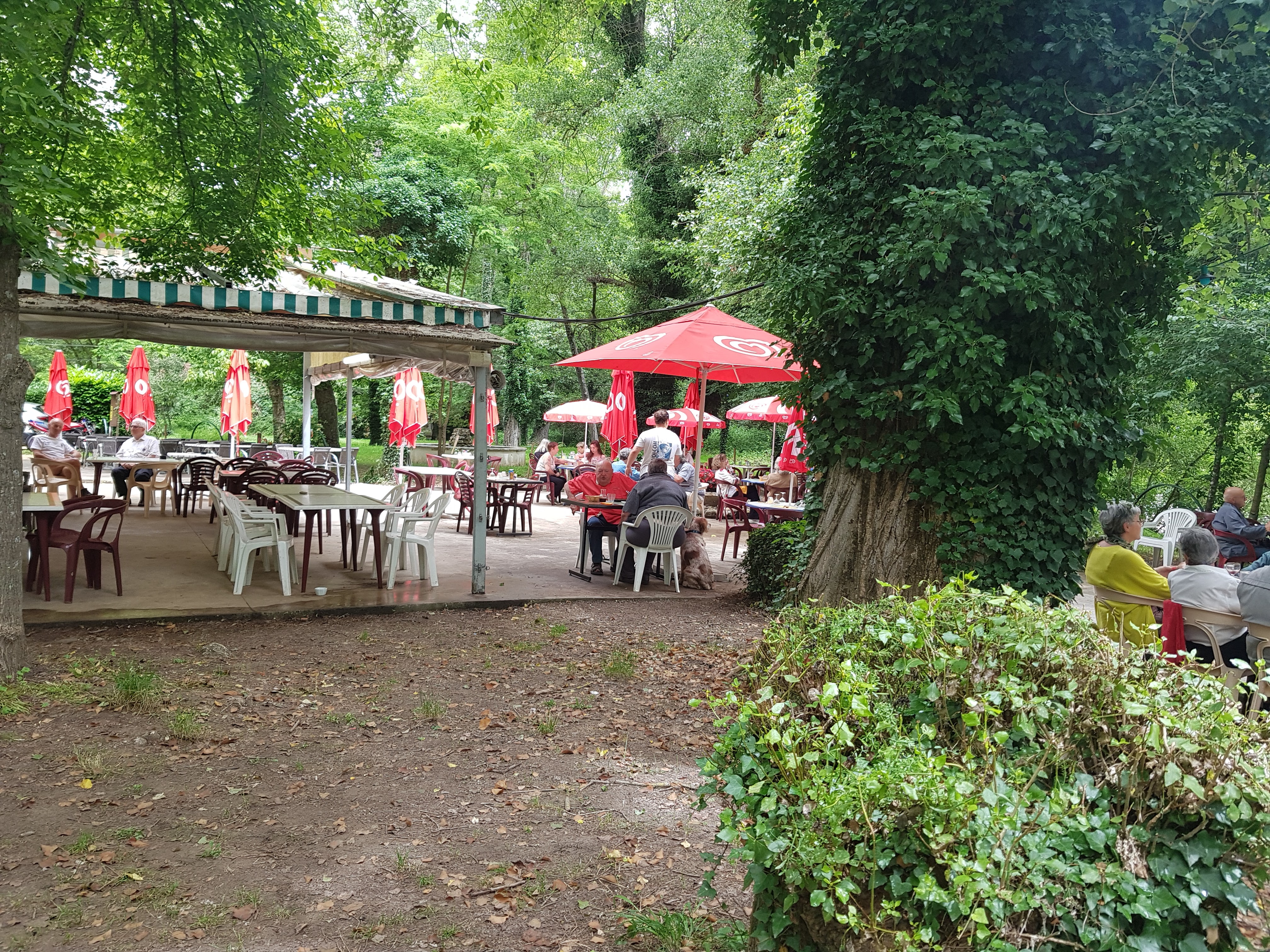 Endroit parfait pour déjeuner tranquillement au bord de la rivière sous les arbres a l'ombre. Repas bon et copieux et de plus servi avec le sourire