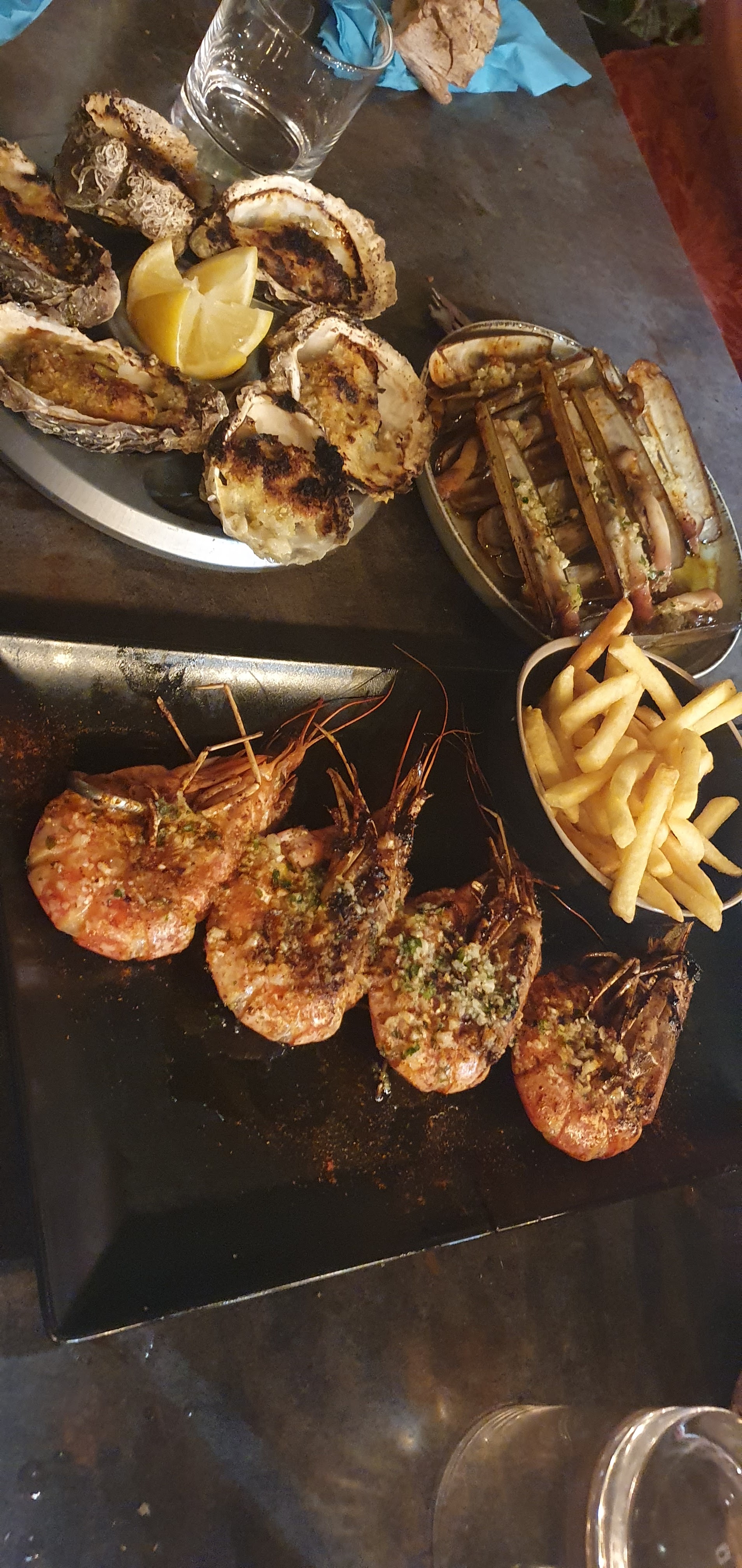 Super moules gratiné les meilleurs de la région huîtres gratiner un délice, les gambas un régal et dessert maison. 👍😋