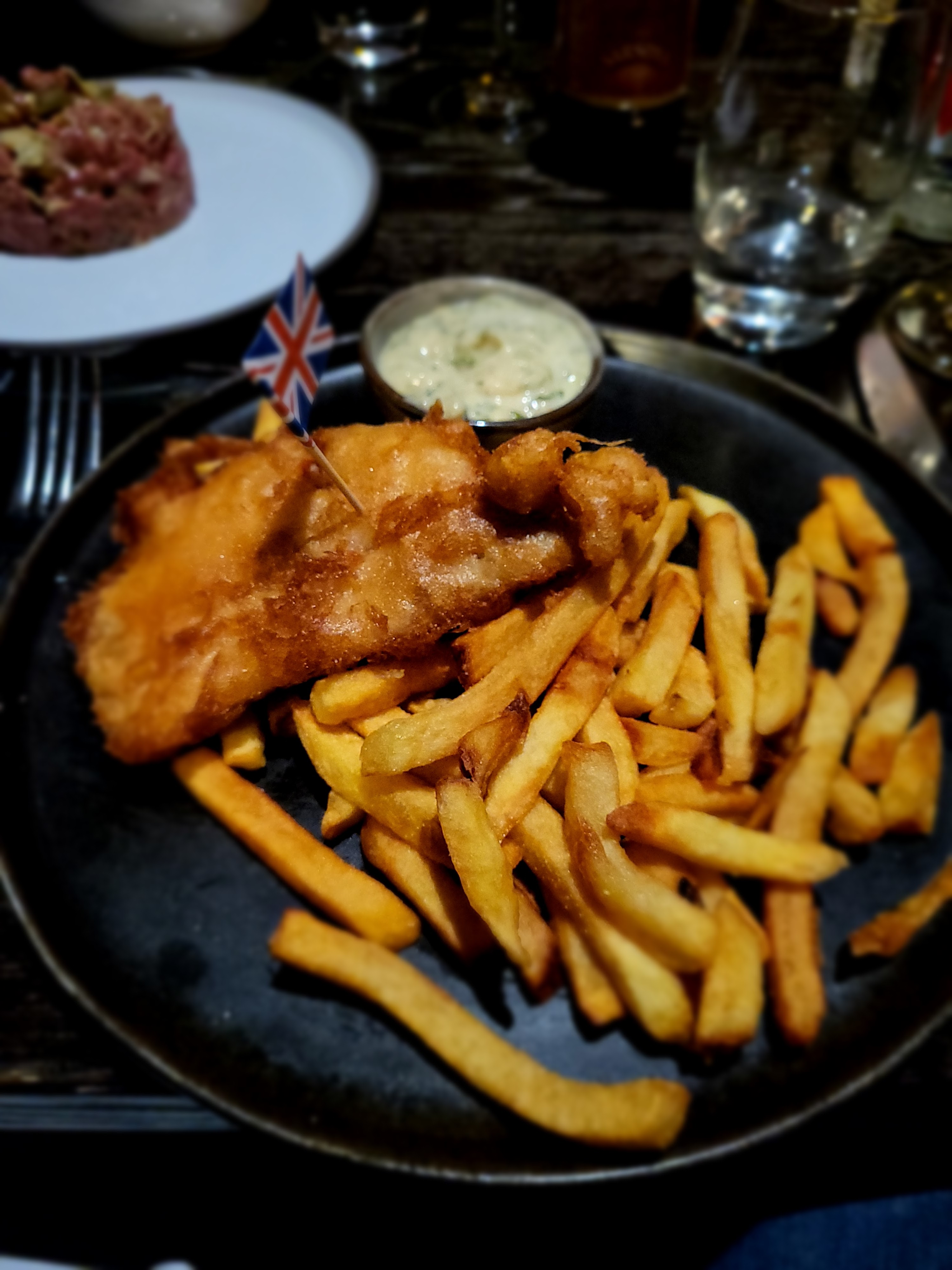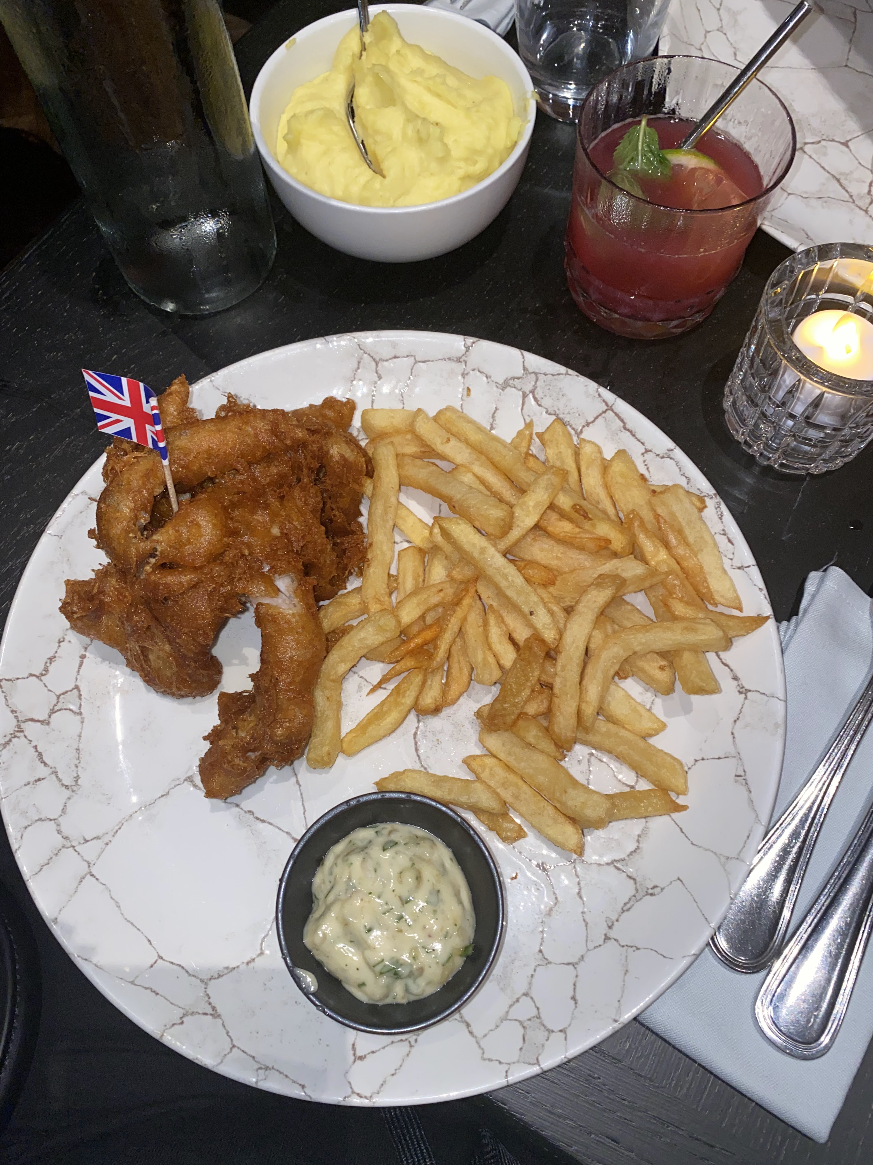 Nous nous sommes rendu dans ce restaurant pour dîner. Le restaurant était vraiment plein ce jour là donc de l’attente pour avoir une table. L’ambiance fais assez intimiste, lumière tamisée. Nous avons pris un fish and chips pour ma part et un suprême de volaille pour monsieur. Nous avons pris en plus une purée sous les recommandations des avis Google. Tout était très bon ainsi que les cocktails. Le seul bémol a était l’attente trop longue entre les plats et la prise de commande des desserts. Mais je vous recommande tout de même le lieu.
