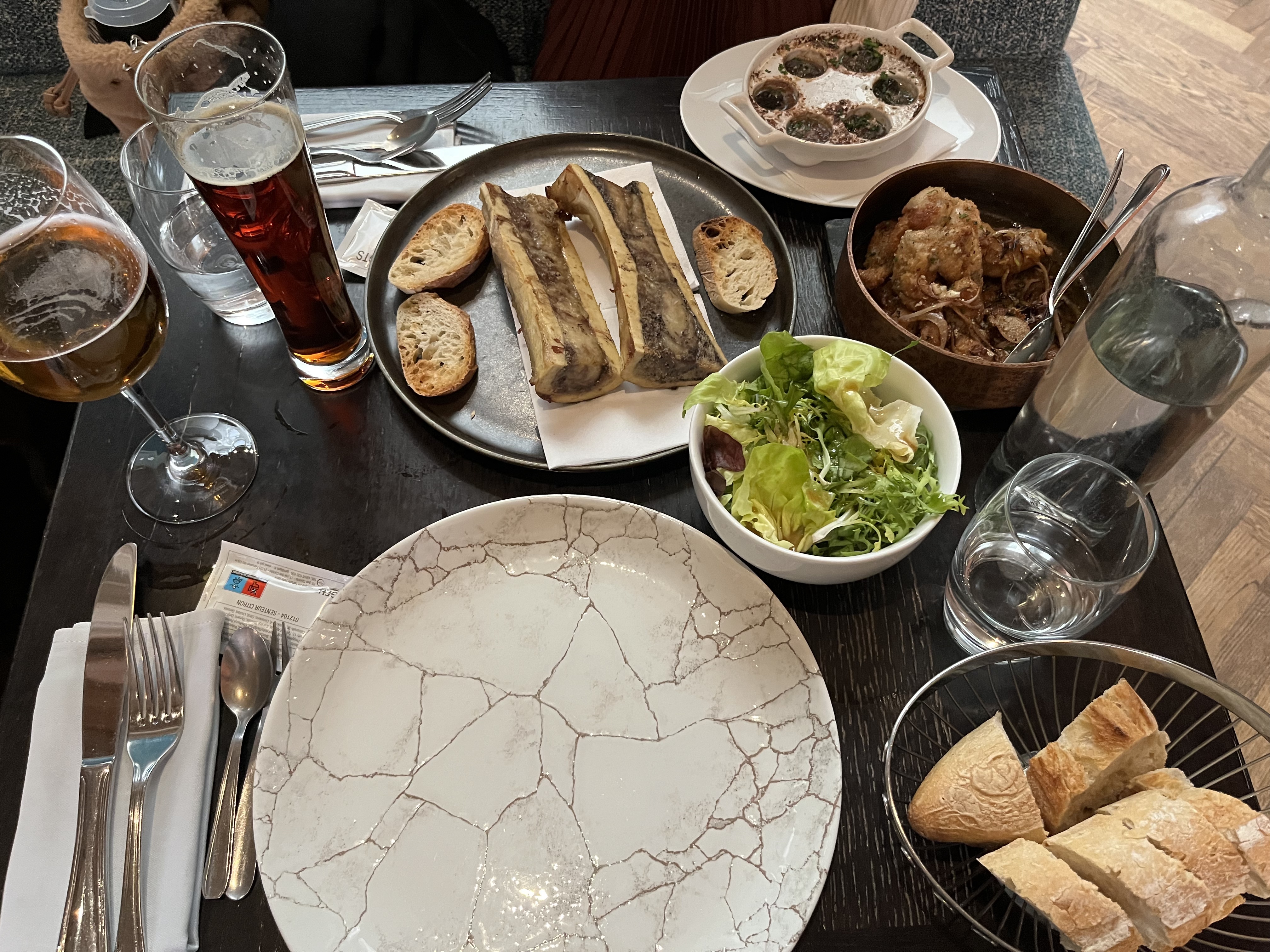 Depuis notre arrivée, tout était parfait. Ils nous ont trouvé une table immédiatement même si le restaurant était plein. Les gentils serveurs ont rendu un excellent service, ils sont jeunes et positifs. L'atmosphère générale est totalement recommandée. Nous avons eu des escargots et des os à moelle en entrée, puis des grenouilles, de la salade Cézar et de la crème brûlée plus tard. C'était un peu trop pour deux d'entre nous même si nous avions tellement faim (mais nous avons fait de la place pour le dessert 😀)