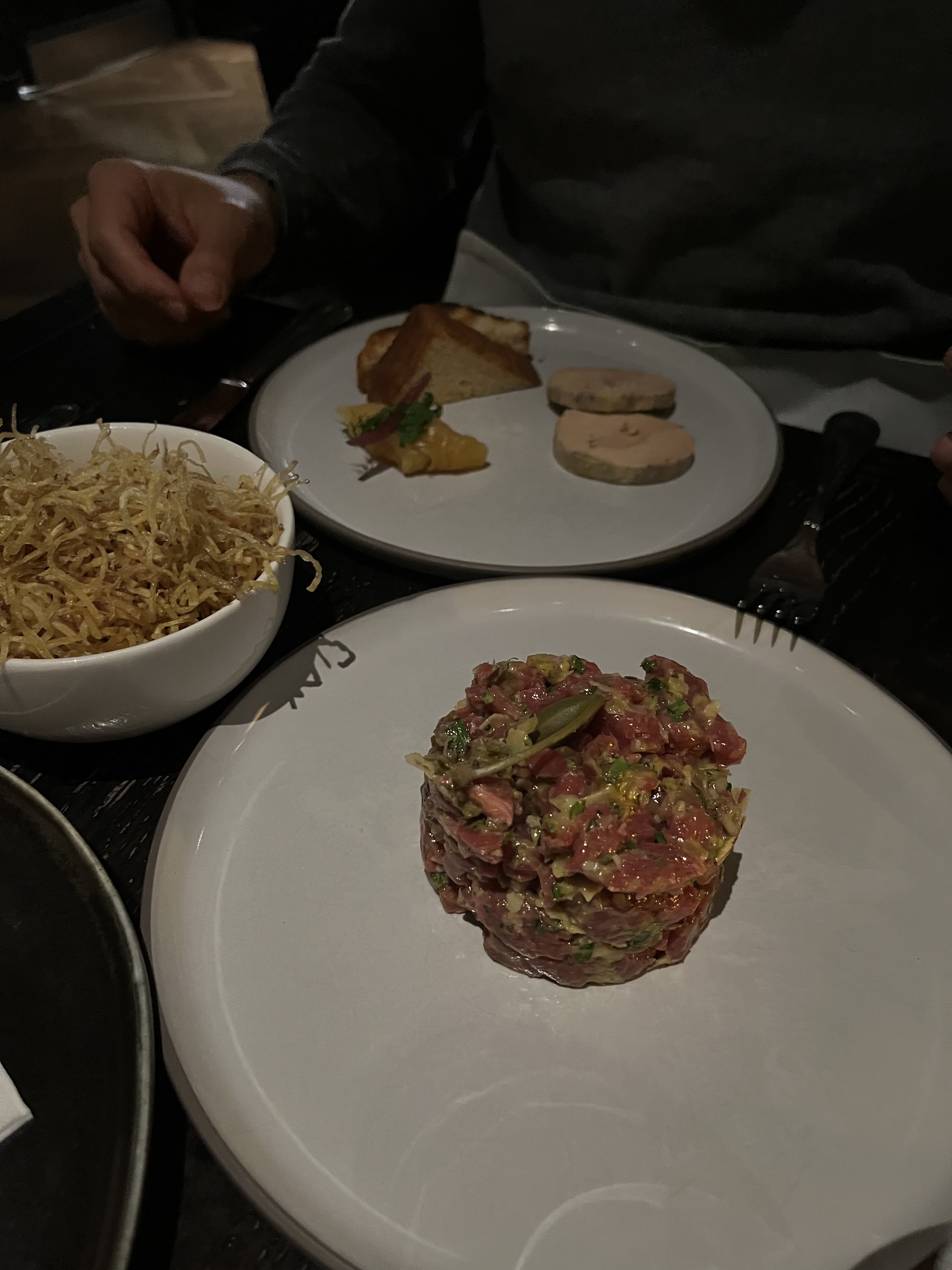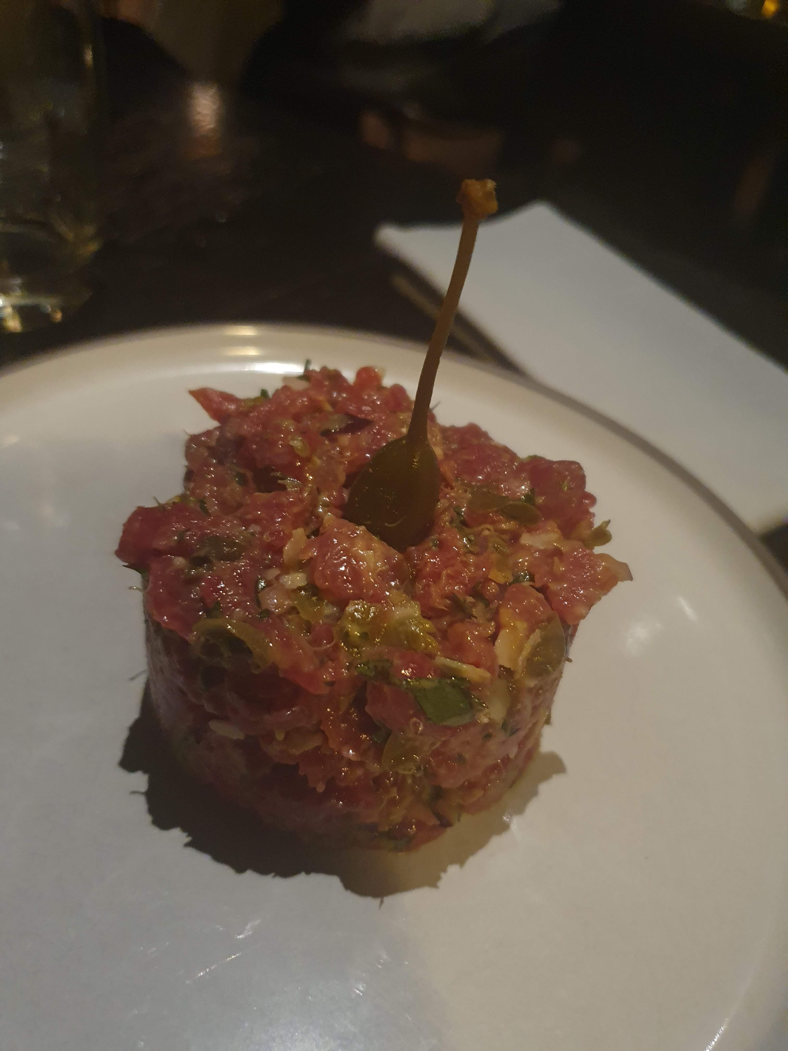 Dans une ambiance à la fois élégante et conviviale, nous avons été accueillis par des serveurs adorables, alors que nous étions en galère de trouver un endroit où manger car il était tard. Le restaurant ferme à 1h du matin, ils prennent les dernières commandes à 23h30! Je salue également les cocktails, de qualité, entre 8 et 10 euros. Excellent restaurant pour un date, mais pas que ! Il a des options végétariennes pas mauvaises du tout; pour ma part j'ai néanmoins opté pour le tartare, qui était très bon.