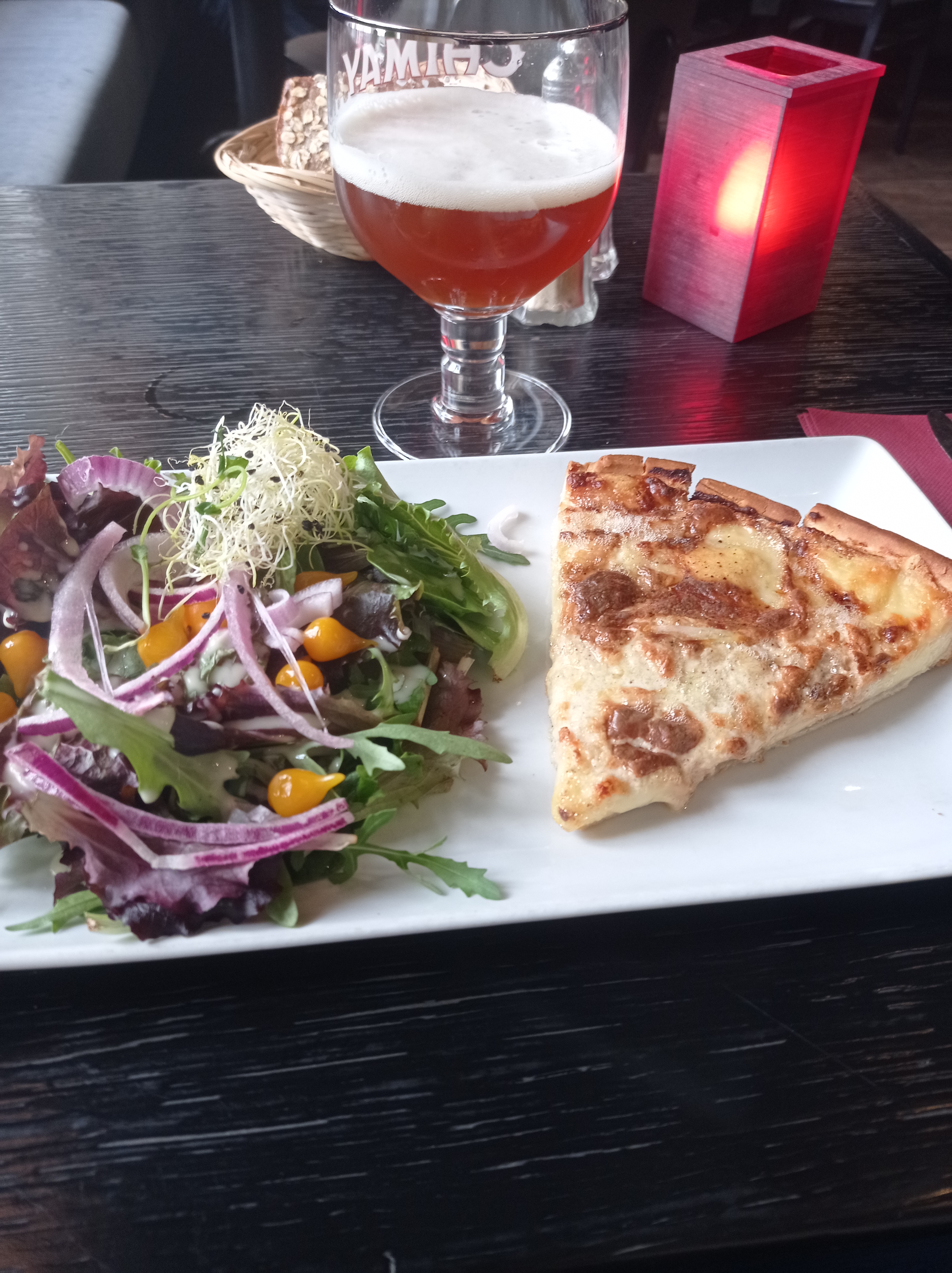 Petit arrêt à la houblonnière et découverte du jour. Service du midi assez rapide malgré le monde ! Plat assez généreux et complet. Du soleil en plus rien de tel La vue sur la place est top ! Je recommande vivement