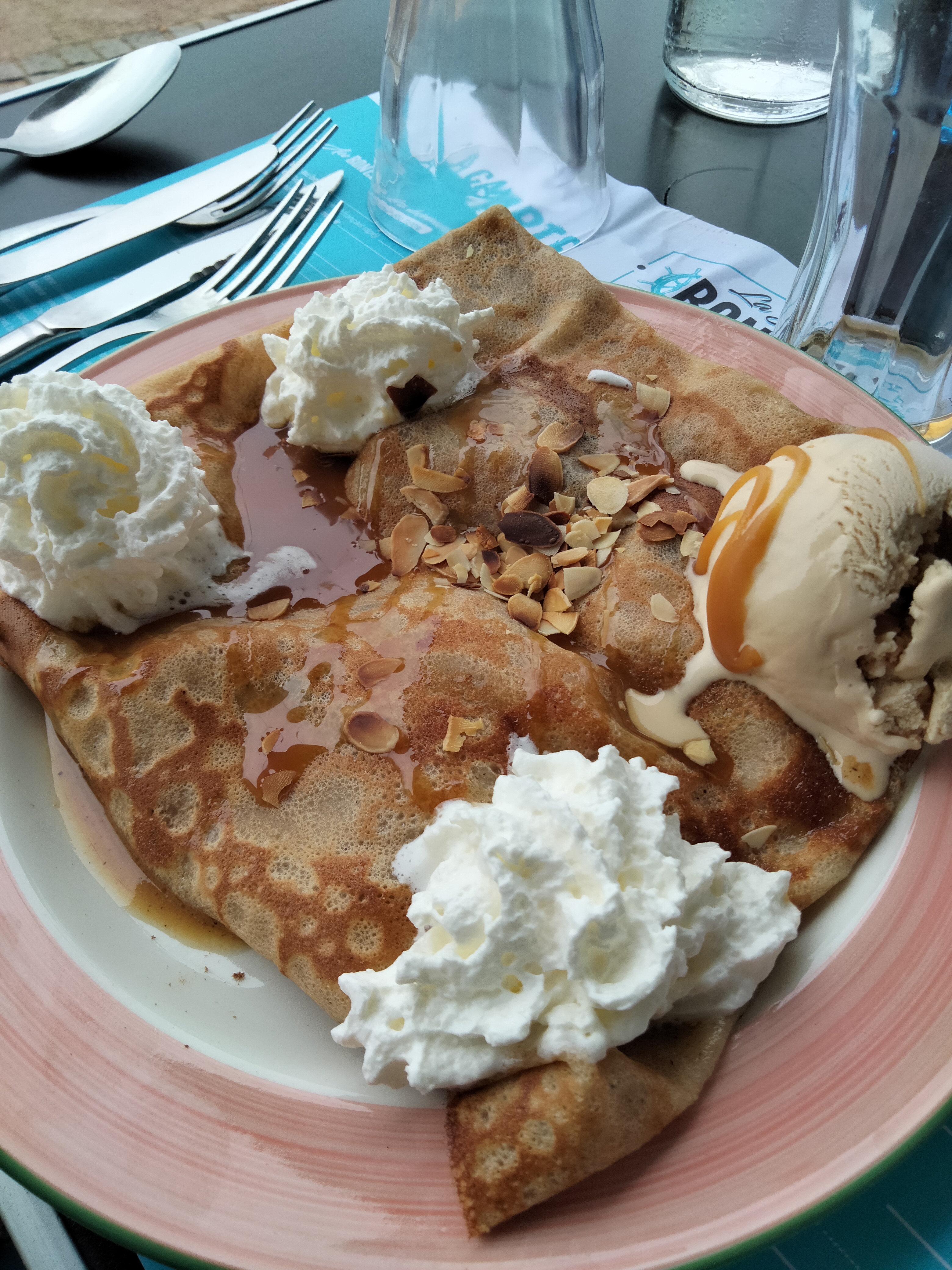 Bonjour 30.06.22 restauration le midi avec une bonne crêpe complète oeuf miroir et crêpes bananes chocolat un régal je recommande.