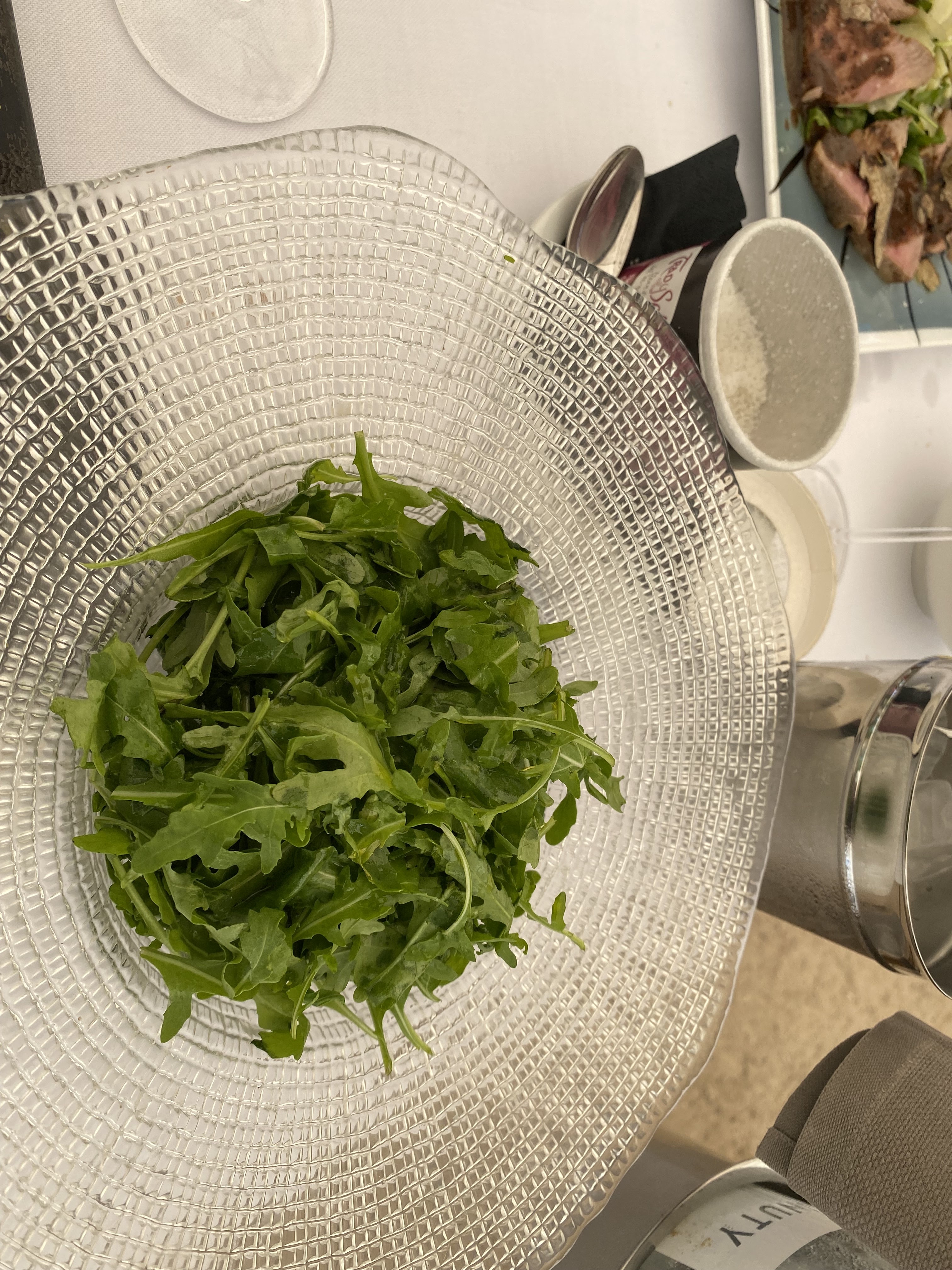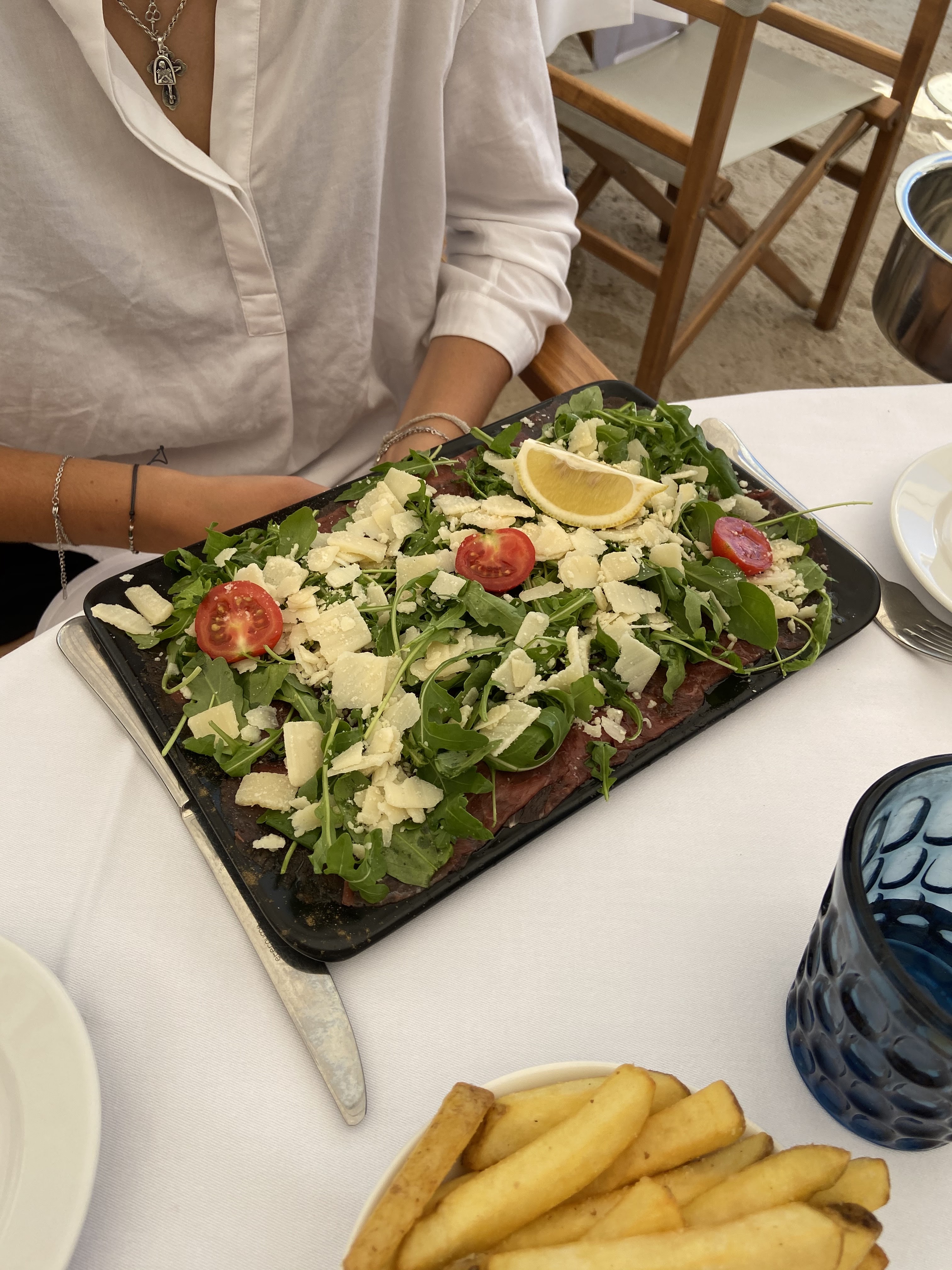 Euh… rien de spécial. J'aurais aimé l'avoir davantage après avoir déboursé 100 euros pour 2 chaises longues, mais c'était au premier rang et une plage médiocre devant moi. La nourriture était très chère comme prévu. Ma salade César était juste et la salade burrata de ma femme, elle aussi, la trouvait juste. Pour 26 euros par salade, je m'attendrais à plus. À la fin, au moment de payer l'addition, le serveur m'a demandé de lui donner un pourboire supplémentaire. Il a dit 20% de plus ? J'ai dit, euh… cela n'est-il pas inclus et il m'a dit qu'il avait besoin de 10 % de plus en raison du service. Il a littéralement mis nos serviettes de chaises sur le lit. Ce fut un échec global pour nous. Nous avions hâte de partir après avoir mangé. La grande montagne à proximité est, je suppose, la meilleure attraction, tout le reste laisse beaucoup à désirer. Le serveur qui demande un pourboire a tort et ne montre pas un bon service. Si je reçois un service de qualité, je donnerai un bon pourboire. Il doit être formé au meilleur service.