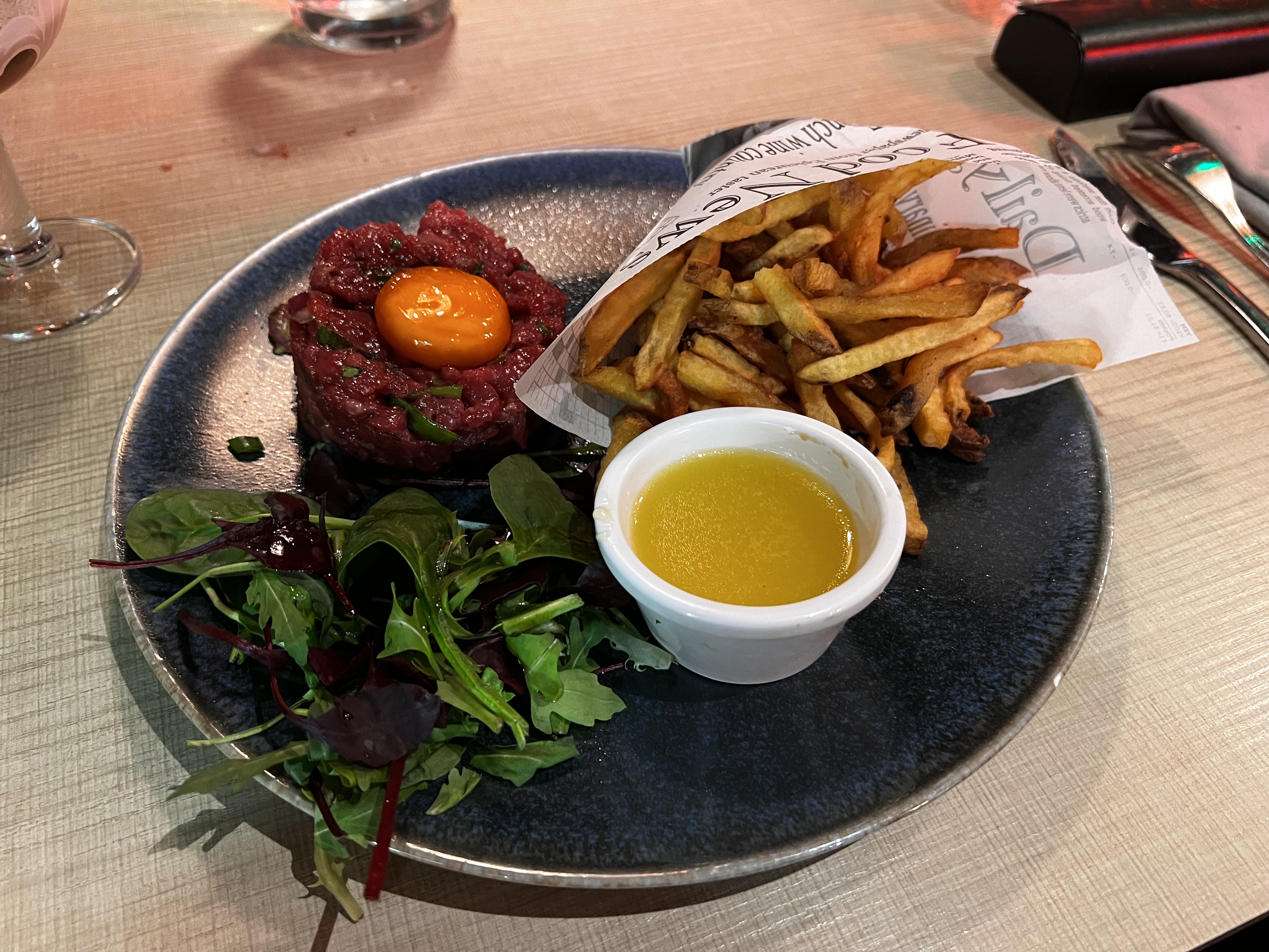 Bon pour une première c’est une première ! Ce restaurant m’était conseillé ! Après la commande de l’apéro et du plat chaud, 50 mn d’attente ! Si au moins le plat était bon, mais non, le canard aussi dur que la table en bois, notre voisine qui a choisit le même plat en demande au autre ! Les pommes de terre persillées sans ail et persil… pour moi un désastre ! Pas de goût ! Le dessert ça va mais sans plus. Dans ce type de restaurant, c’est bon quand c’est simple mais pas terrible quand c’est moins simple !
