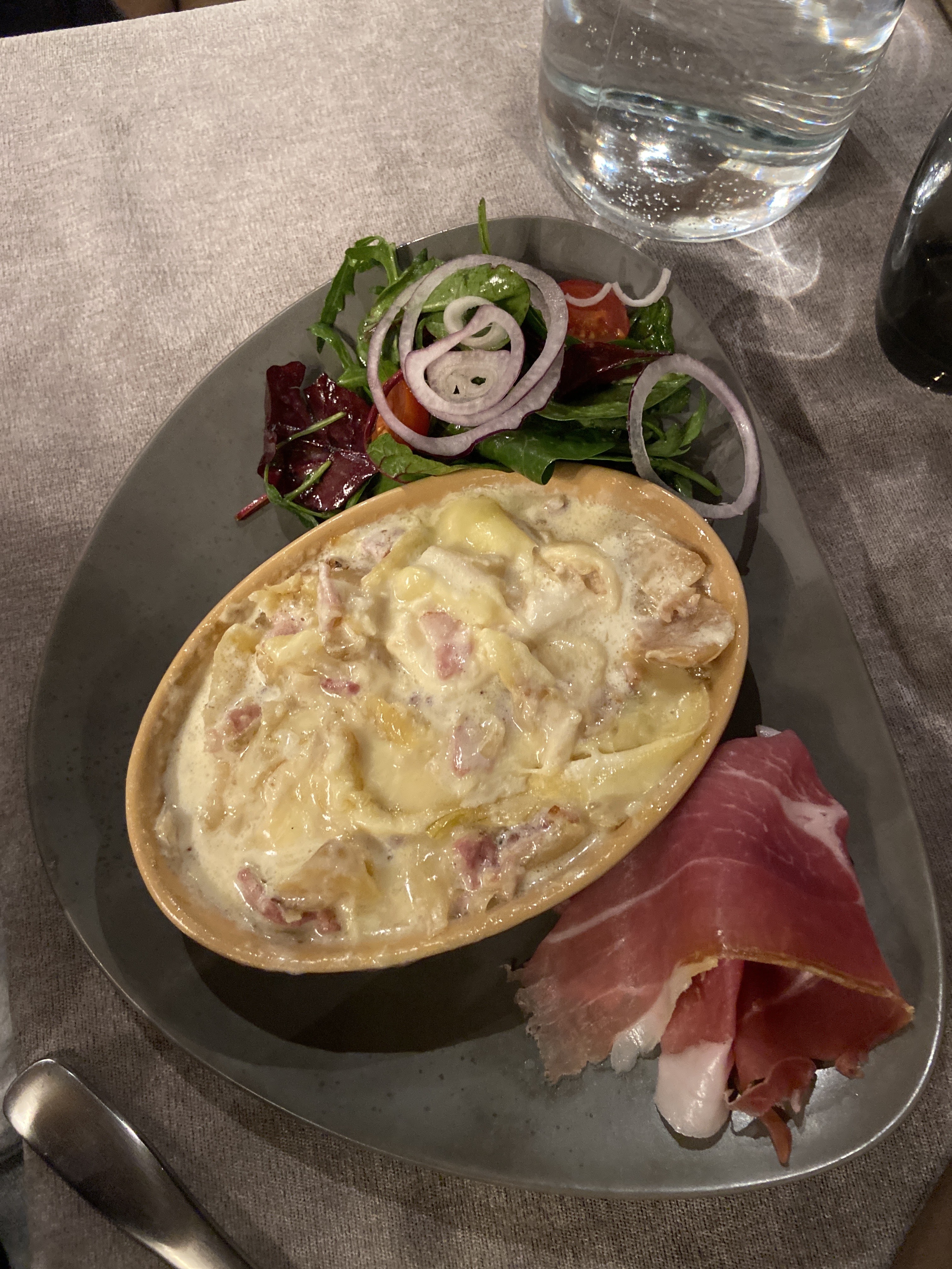 La raclette que nous avions était spectaculaire et la taille était plutôt bonne, accompagnée d'une assiette de saucisses locales et de jambon. Nous avons également eu une Tartiflette, excellente également avec sa salade et ses tomates ! Il n'y avait pas foule le jour de notre arrivée, mais je suis sûr qu'il y aura du monde le week-end. Réservez une table si vous souhaitez dîner.