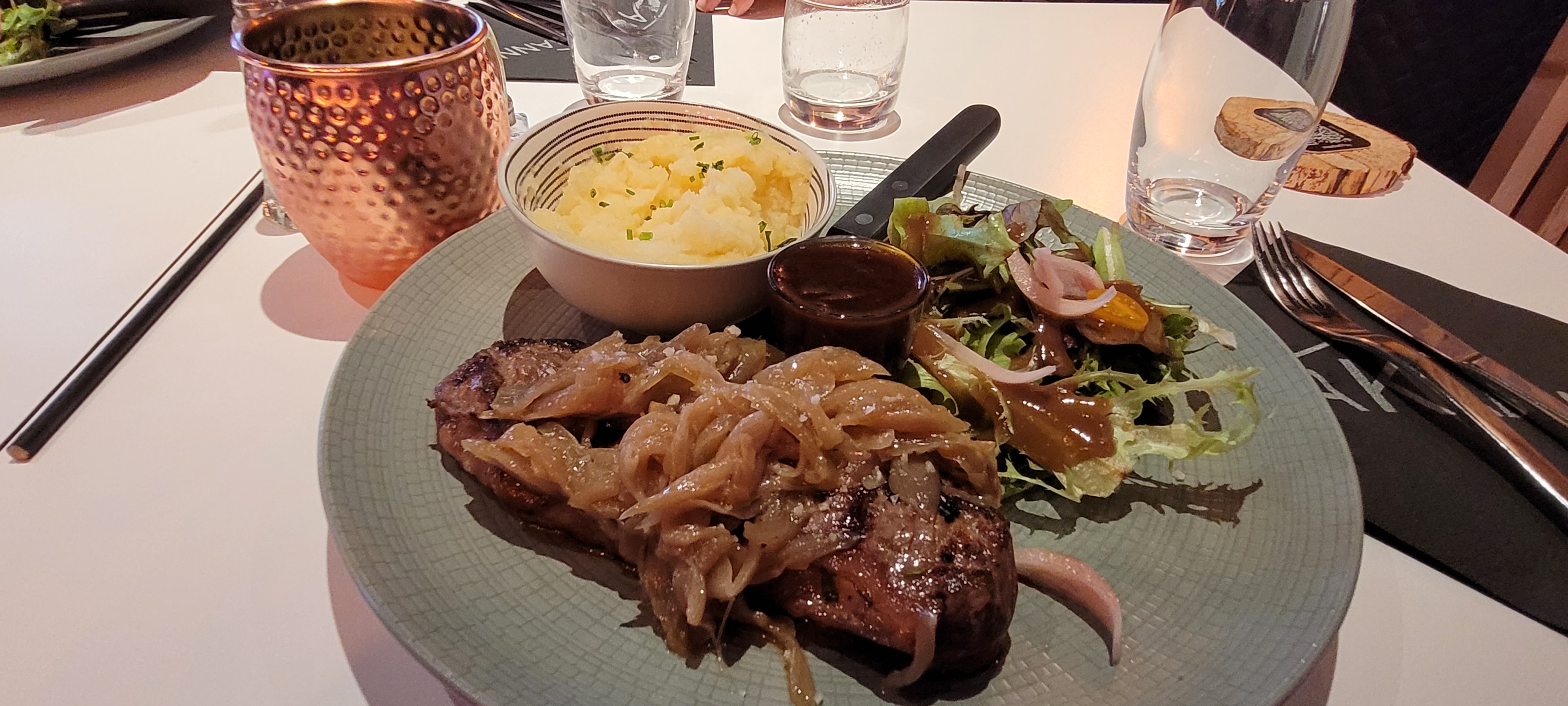 Cela faisait un moment que je n’étais pas retourné à La Kabann. C’est en regardant par hasard leur site que j’ai remarqué la nouvelle carte (qui est là depuis 6 mois !) qui désormais ne propose plus de pizzas. Et c’est à mon sens une bonne chose… car du coup il y a plus de choix en plats, burgers et salades. Un recentrage gagnant avec des plats de qualité qui proposent des ingrédients frais et savoureux (entrecôte de 300g et bowl asiatique sur les photos). Carte des vins bien fournie avec des prix corrects (entre 20€ et 30€ la bouteille) et grand choix de cocktails avec et sans alcool. Le personnel est toujours disponible et sympathique et réactif. Point important : nous y sommes allés un jeudi soir (salle très peu remplie) et un samedi soir (salle quasi pleine) et nous n’avons pas eu de problèmes de longueur dans le service dans les 2 cas… donc bonne gestion des tables même en cas d’affluence. Très bonne soirée au final dans un cadre sympathique et bien décoré.