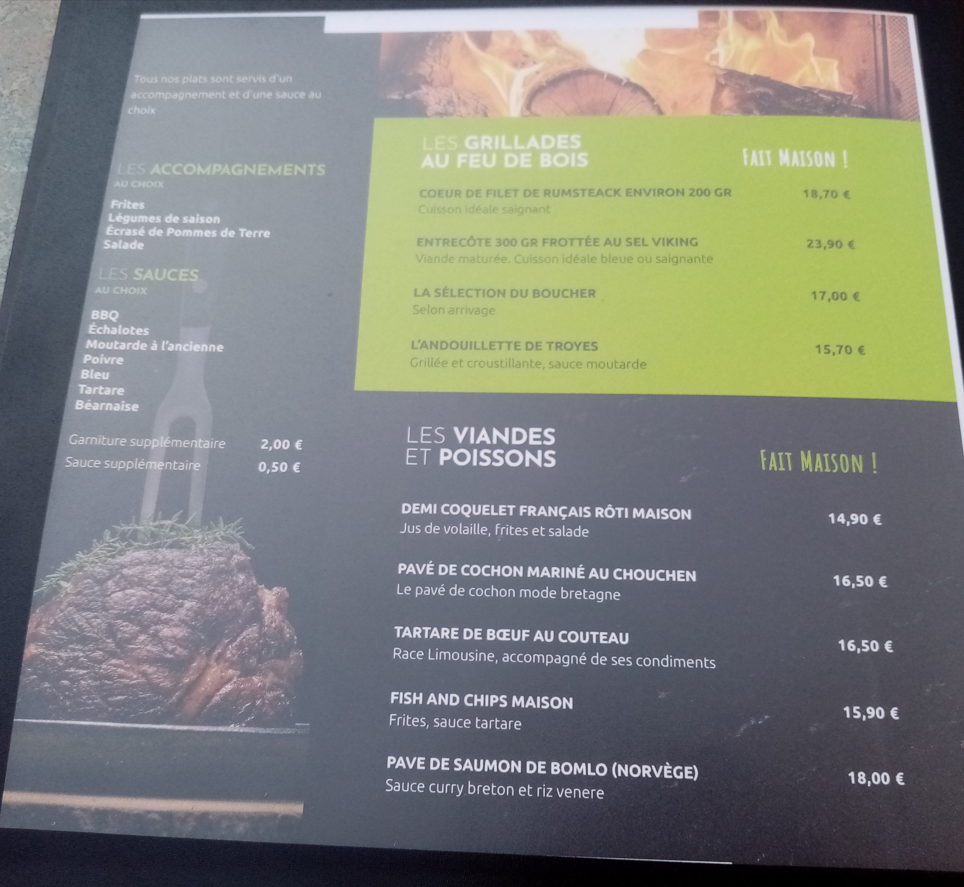 Bonjour, Nous sommes venus un samedi soir. Accueil très chaleureux. Comme entrée nous avons pris une planche duo à 14€90 qui était très bonne et bien garnie. En plat pour moi un poulet pané qui n'était pas assez cuit à mon goût ( texture limite crue ). Pour madame, un pavé de rumsteck qui a été commandé à point et qui arrivé bleue, cependant nous avons fait la remarque à une serveuse qui nous l'a gentiment renvoyer en cuisine pour qu'il nous revienne à la bonne cuisson. En désert, madame a pris une brioche perdue qui était très bonne, et pour moi un fondant au chocolat qui était très bon réussi. Pour conclure, restaurant très accueillant, cependant les cuissons des viandes ne sont pas parfaites et les prix restent relativement élevés ( 71€ pour un verre de vin blanc, une pression, une entrée, 2 plat, 2 dessert )