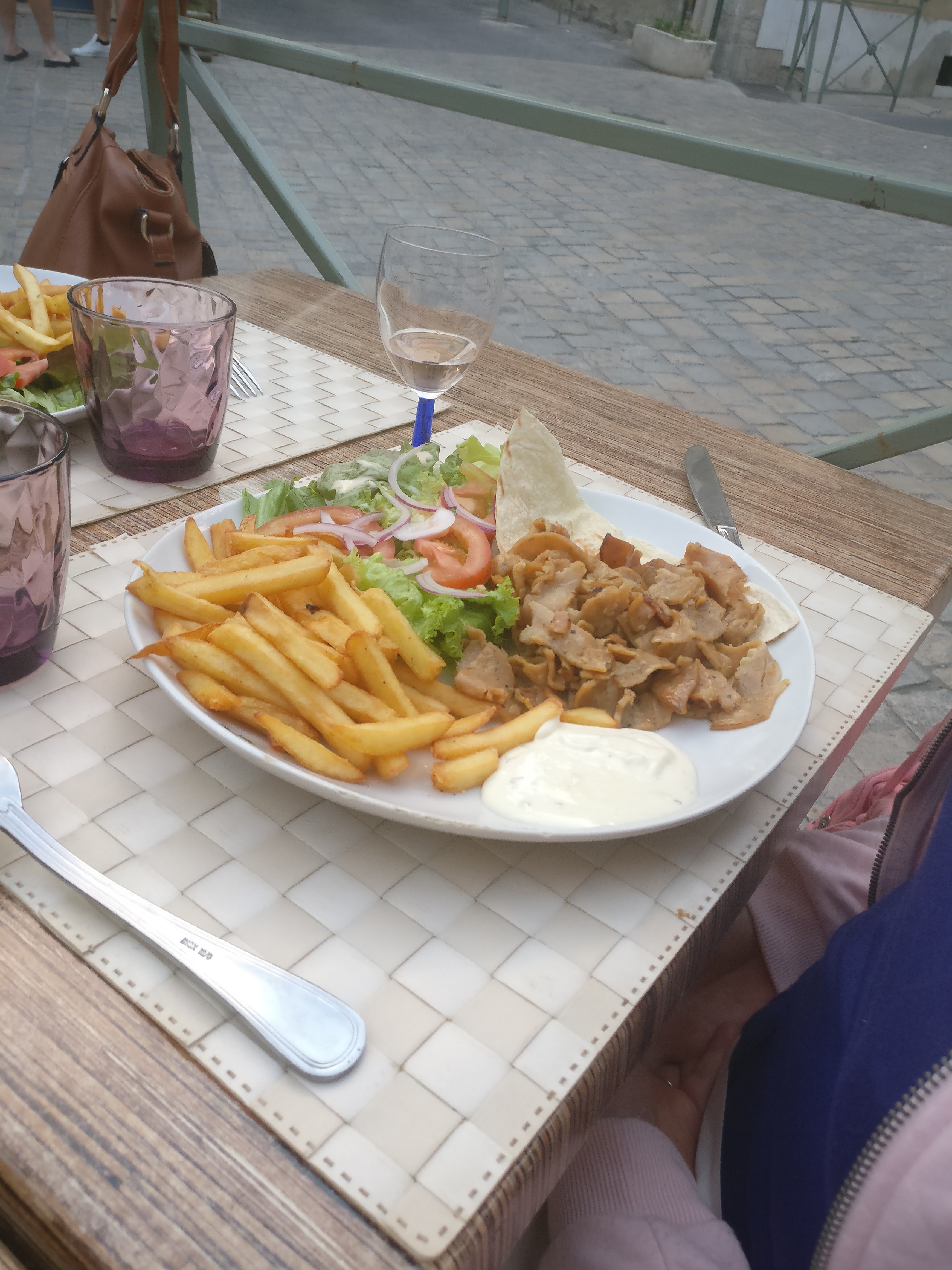 Assiette kebab et assiette orientale très bien En terrasse à l'ombre sous un Olivier, top ! Par contre l intérieur ça ne fait pas rêver, déco à rafraîchir