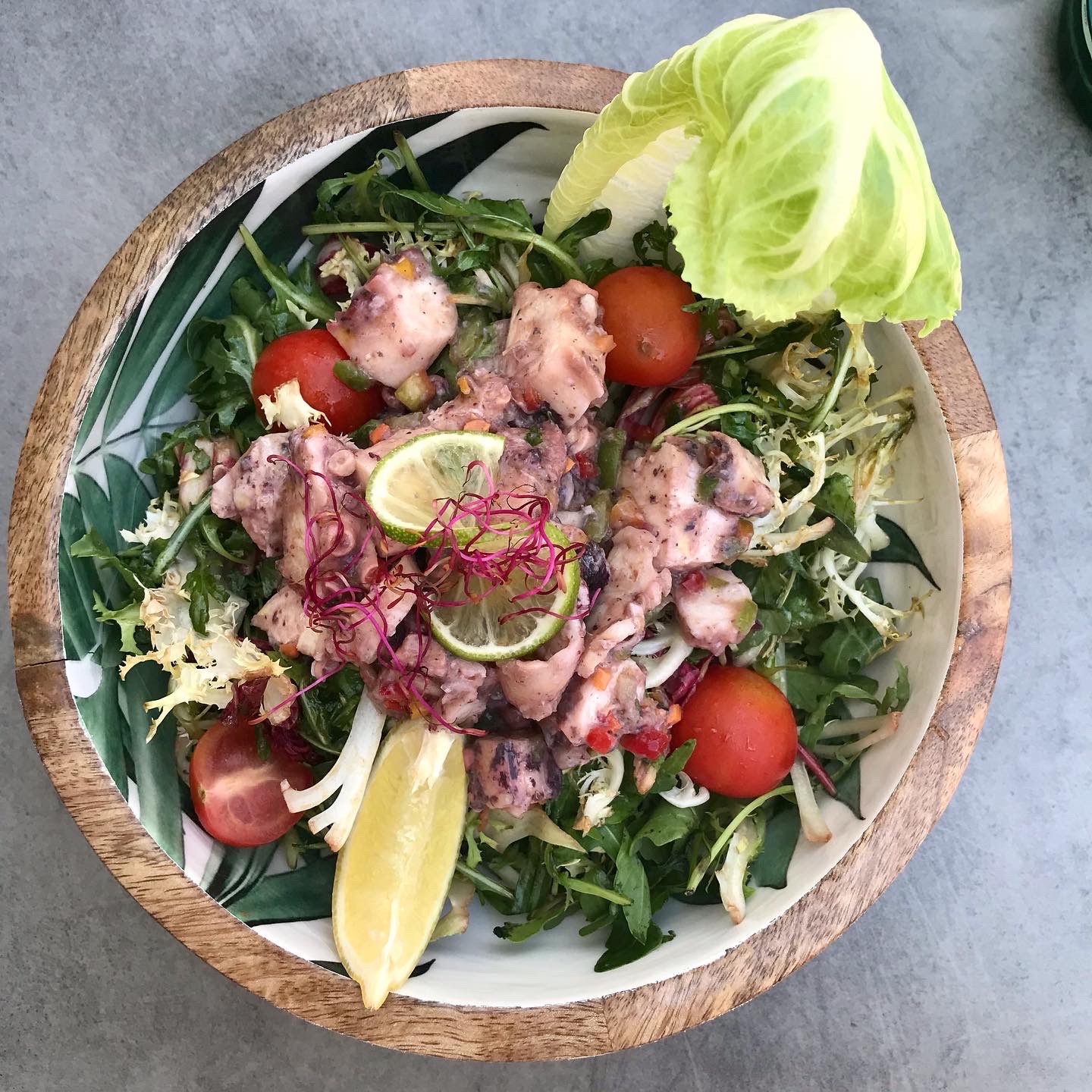 Déjeuner de Pentecôte en terrasse sous l 'ombre rafraîchissante des toiles de coco plat du jour espadon grillé avec purée d'artichaut un délice ! apéritif piña colada généreuse dessert Mascapina crumble ananas mascarpone autre délice belle après midi casi exotique avec petit vent rafraîchissant à faire et refaire