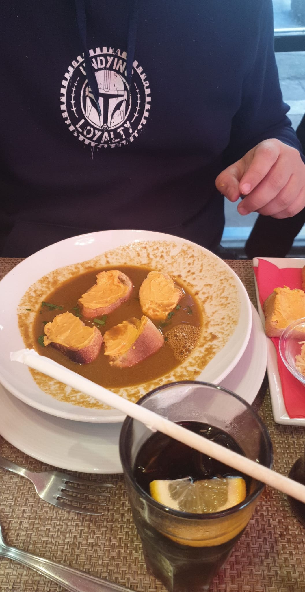 Ok donc boisson gratuite à l'arrivée grignote aussi de la soupe au menu à 20 euros bonne chute le plat principal a pris des siècles pas très chaud. Tirimasu sympa. Guy ne m'a pas laissé payer 4,50 par carte. Ah ça vaut vraiment le coup d'essayer
