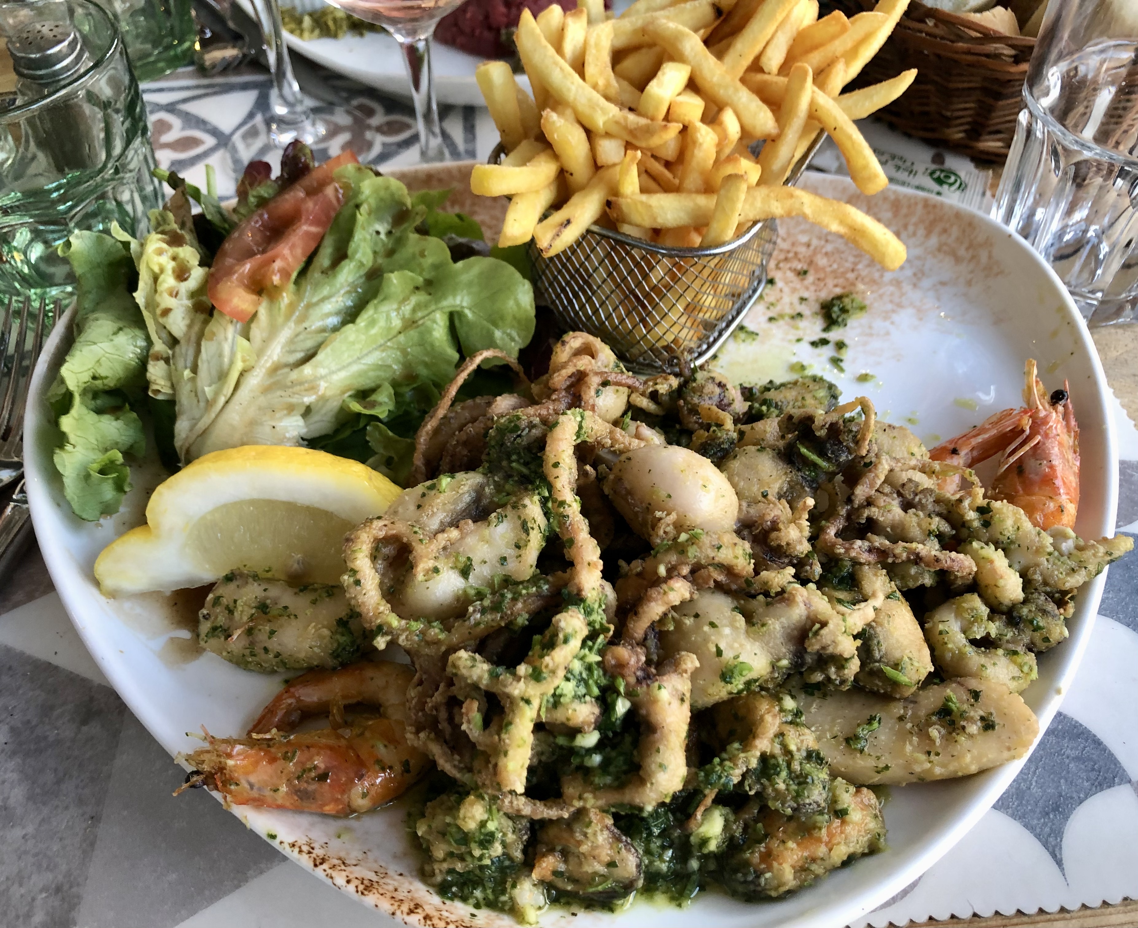 3demandes pour avoir de l'eau,moules roquefort bonnes mais de nombreuses étaient vides,friture de la mer bonne mais un peu trop grasse. Hélas même carte de formule part