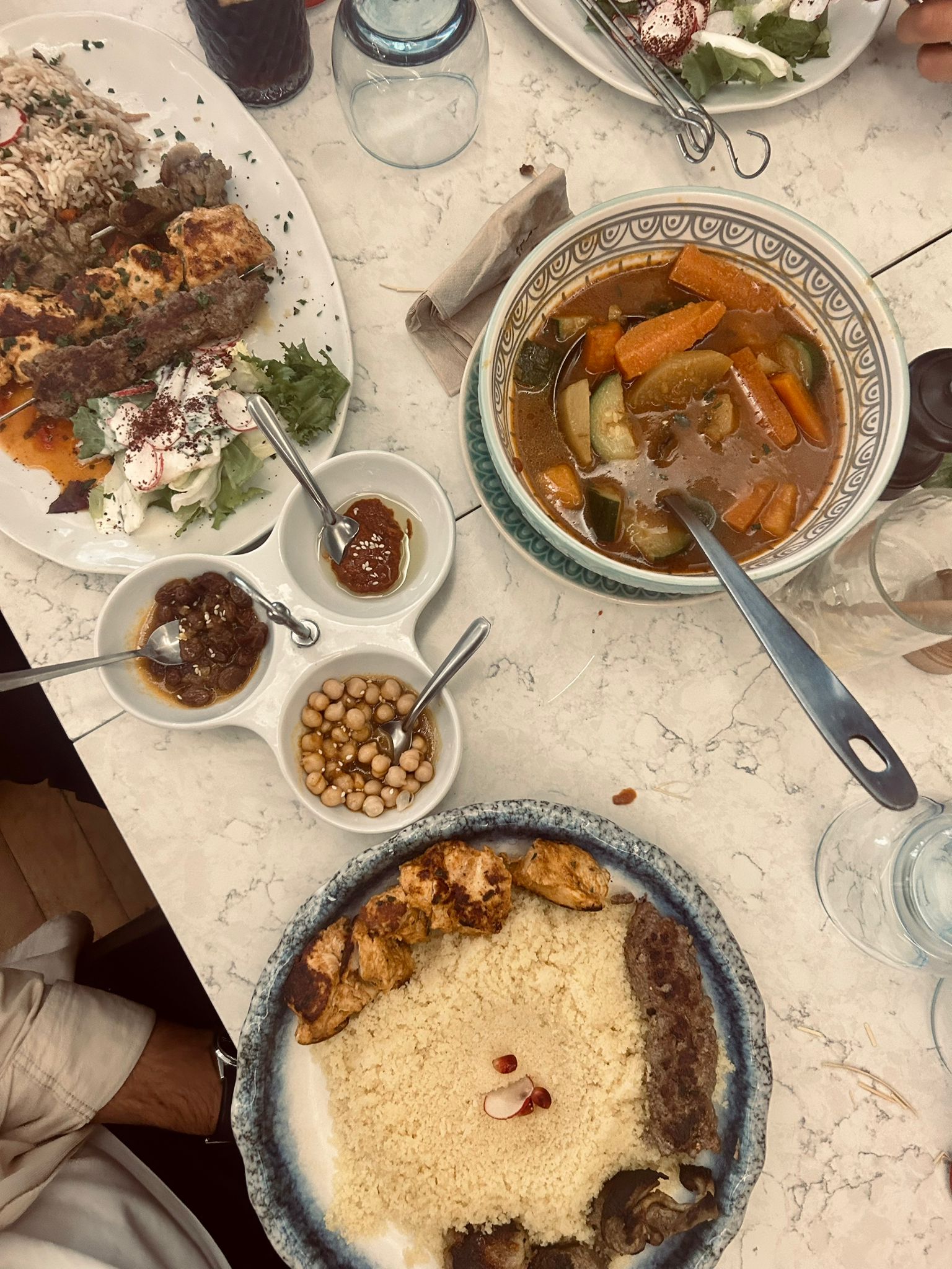 Nous avons été accueillis par le propriétaire qui était très accueillant. Nous étions un groupe de quatre personnes et nous avons commandé un grand choix d'entrées. Ensuite, nous avons eu une sélection de viandes grillées et de poulet sur un lit de riz avec des légumes. Un membre du groupe est végétalien et ils avaient un grand choix de plats et ils étaient très complets. En dessert, nous avons eu un assortiment de pâtisseries libanaises et une crème anglaise à base de lait d'amande. Dans l'ensemble, ce fut une expérience incroyable et je recommande vivement cet établissement. Ma recommandation est que si vous n'êtes pas familier avec ce type de nourriture, demandez au propriétaire de vous guider lors de la commande.
