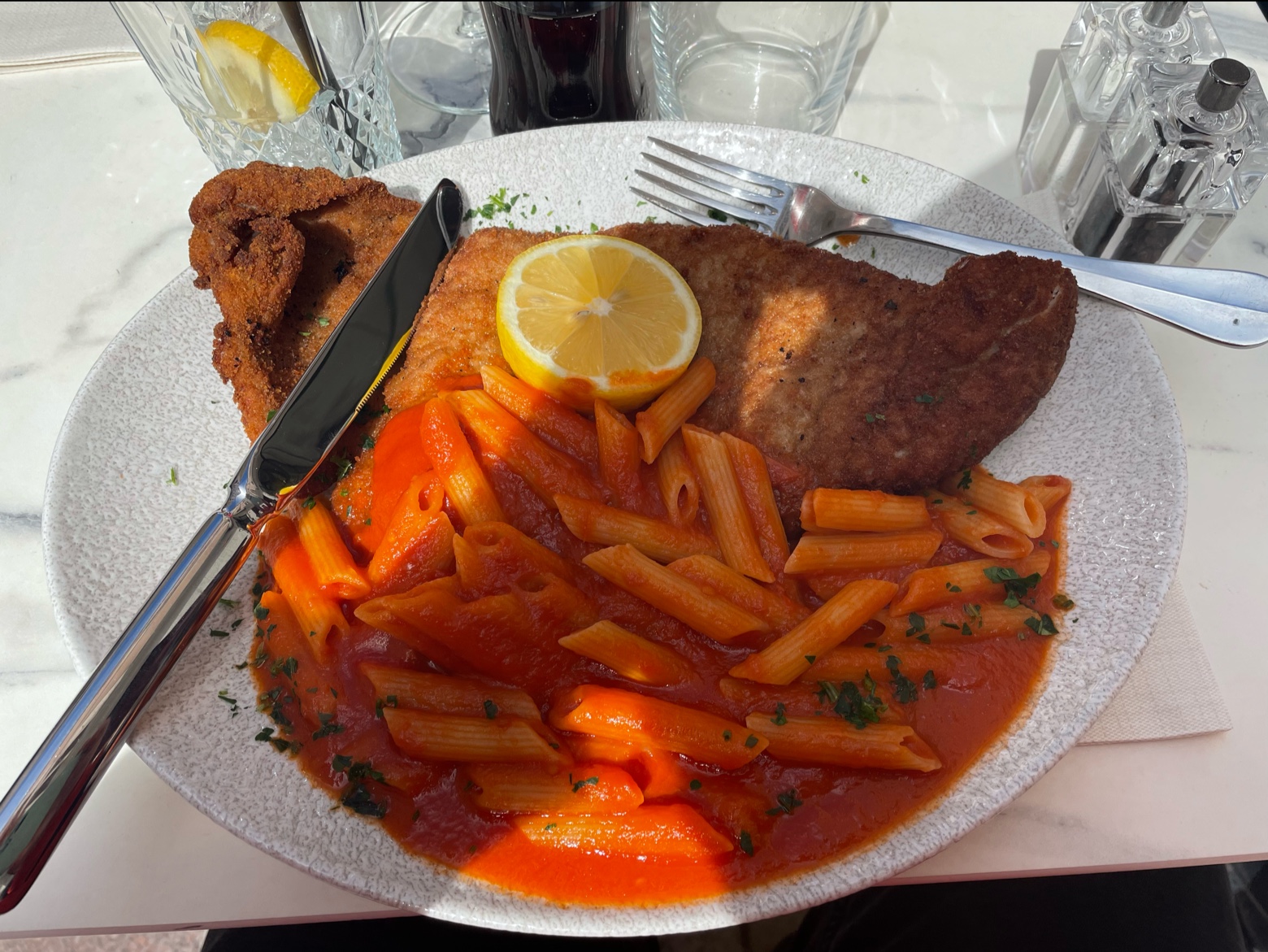 Je ne sais pas quel est le nom de ces pâtes car elles ont été recommandées par un ami français mais les pâtes elles-mêmes étaient fraîches et leur sauce qui est la chose la plus importante pour des pâtes à mon avis, était si savoureuse et la quantité d'épices était très bonne. très bien . Cependant, l'escalope de bœuf/veau n'était pas mauvaise mais je préférerais personnellement un menu avec plus d'options de viande/poulet ou même en accompagnement de pâtes. Le service était excellent, mais les tables extérieures étaient près de la rue, donc les voitures et les motos qui passaient étaient ennuyeuses et vous pensez toujours qu'elles pourraient vous frapper mdr