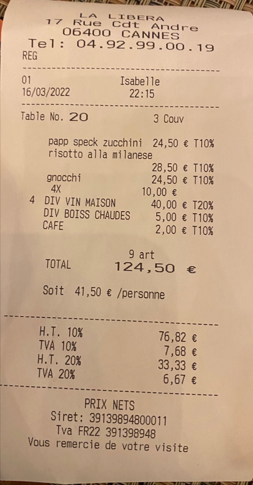 Très bon restaurant italien les plats sont faits comme en Italie et les serveurs au top. Propre et rapidement servi je vous le recommande. Les prix sont corrects pour une ville comme Cannes oû sur le bord de mer les restaurateurs vous prennent pour des pigeons.
