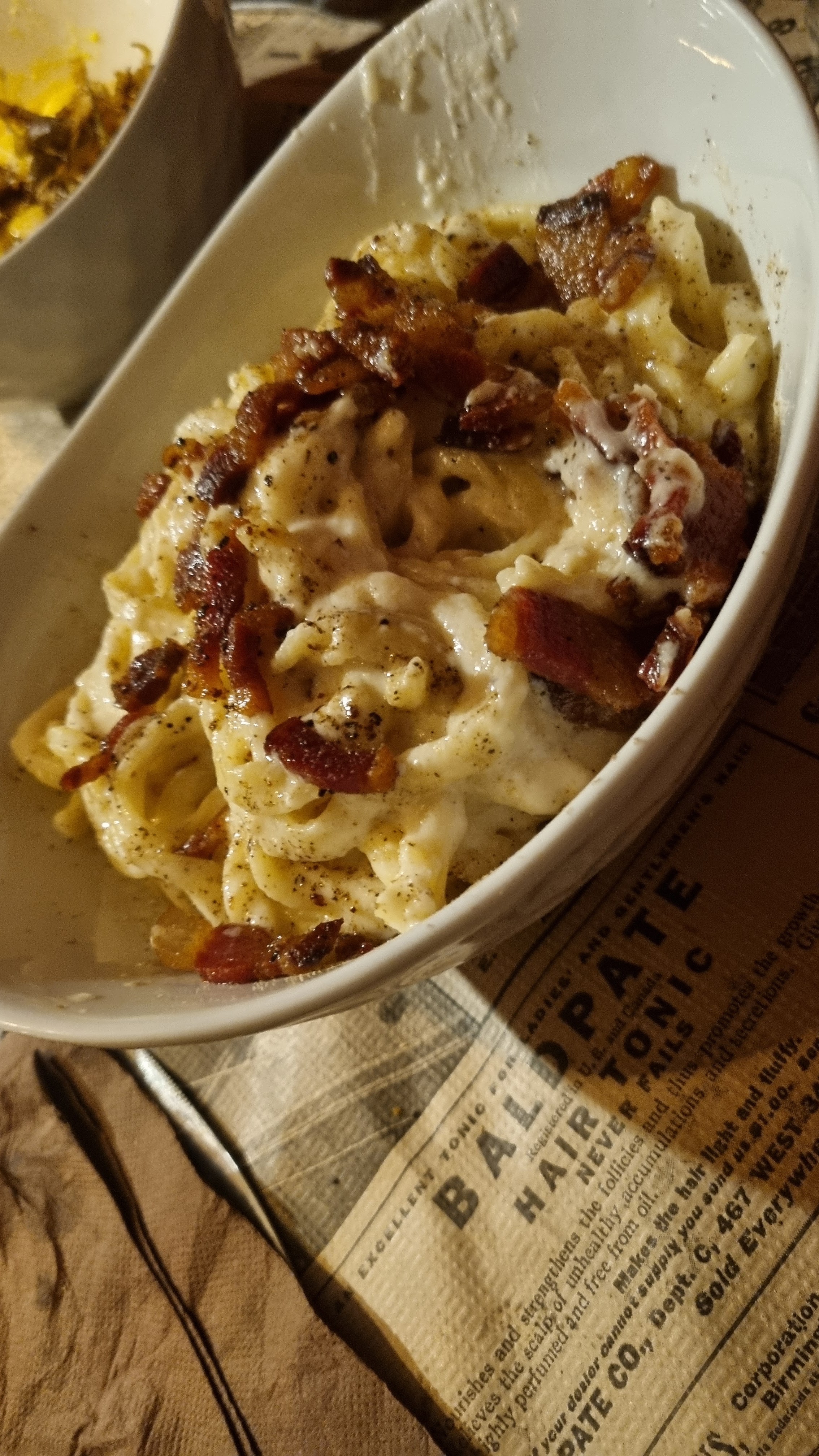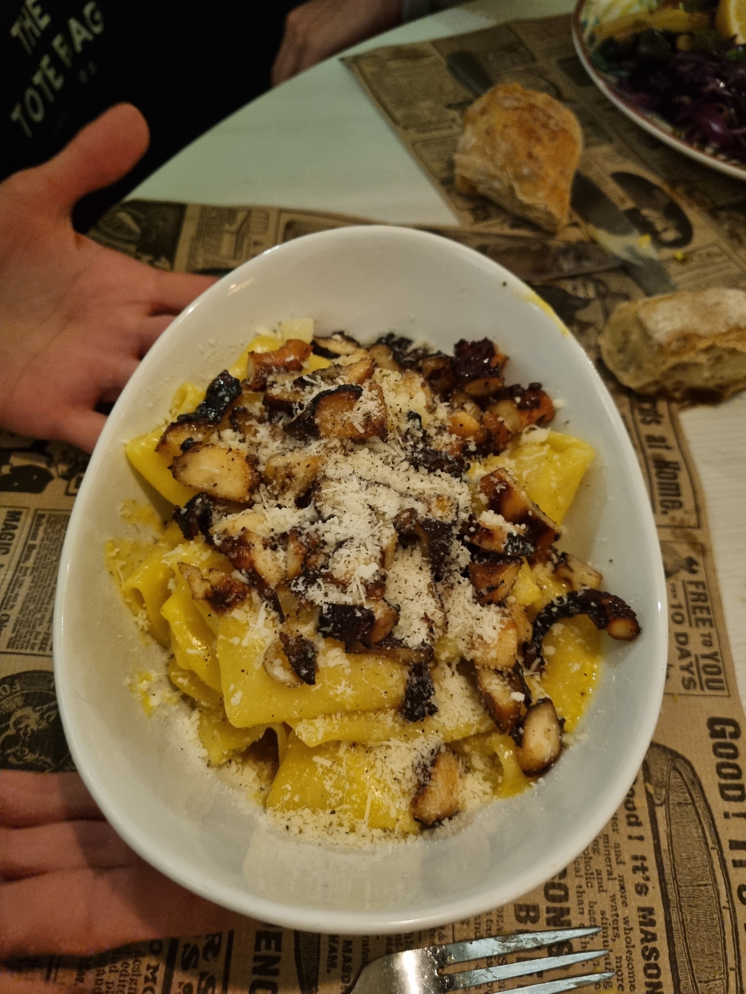 Très bon et les serveurs sont sympas. Il y avait juste beaucoup de bruit ce soir-là et les prix sont plutôt élevés. Je vous recommande l’expérience des pâtes cacio e peppe cuites dans la meule de fromage directement! N’hésitez pas à y aller!
