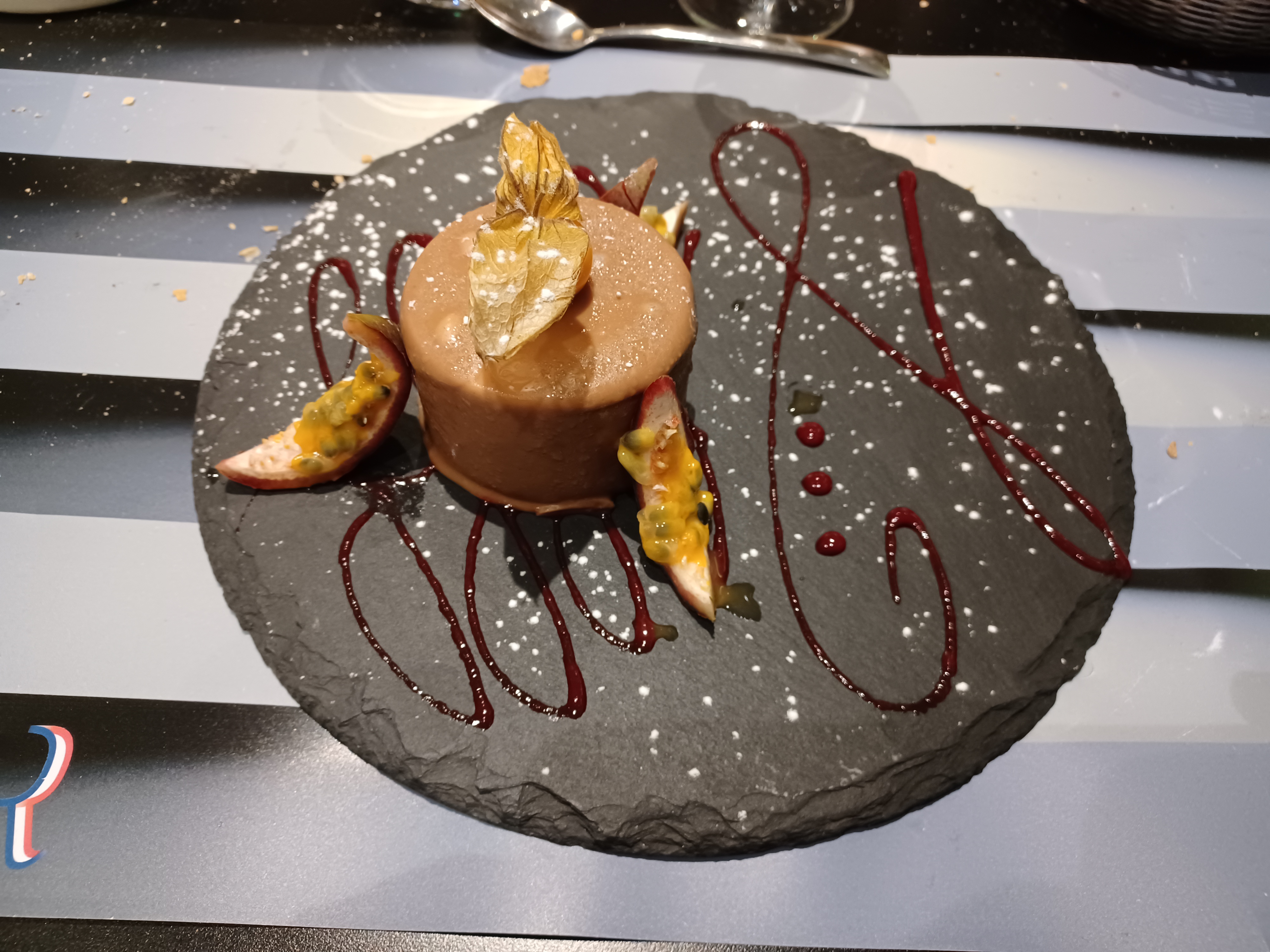 Très déçu, entrée foie gras faible quantité et tomates de faible qualité, Plat que se soit poisson ou viande (cuissons réussie) même garnitures, riz beaucoup trop cuit et sauce qui ne semble pas être maison (au poivre ) En se qui concerne le dessert ; entremet glacé passion , complètement gelé, sablé immangeable car dur comme du béton, Ne change pas les couverts entre l’entrée poisson et le plat viande. Service rapide par ailleurs et agréable. En résumé pas de quoi se réjouir, repas plus qu’en demi teinte , nous n’y retournerons pas , rapport qualité/prix élevé pour le résultat final.