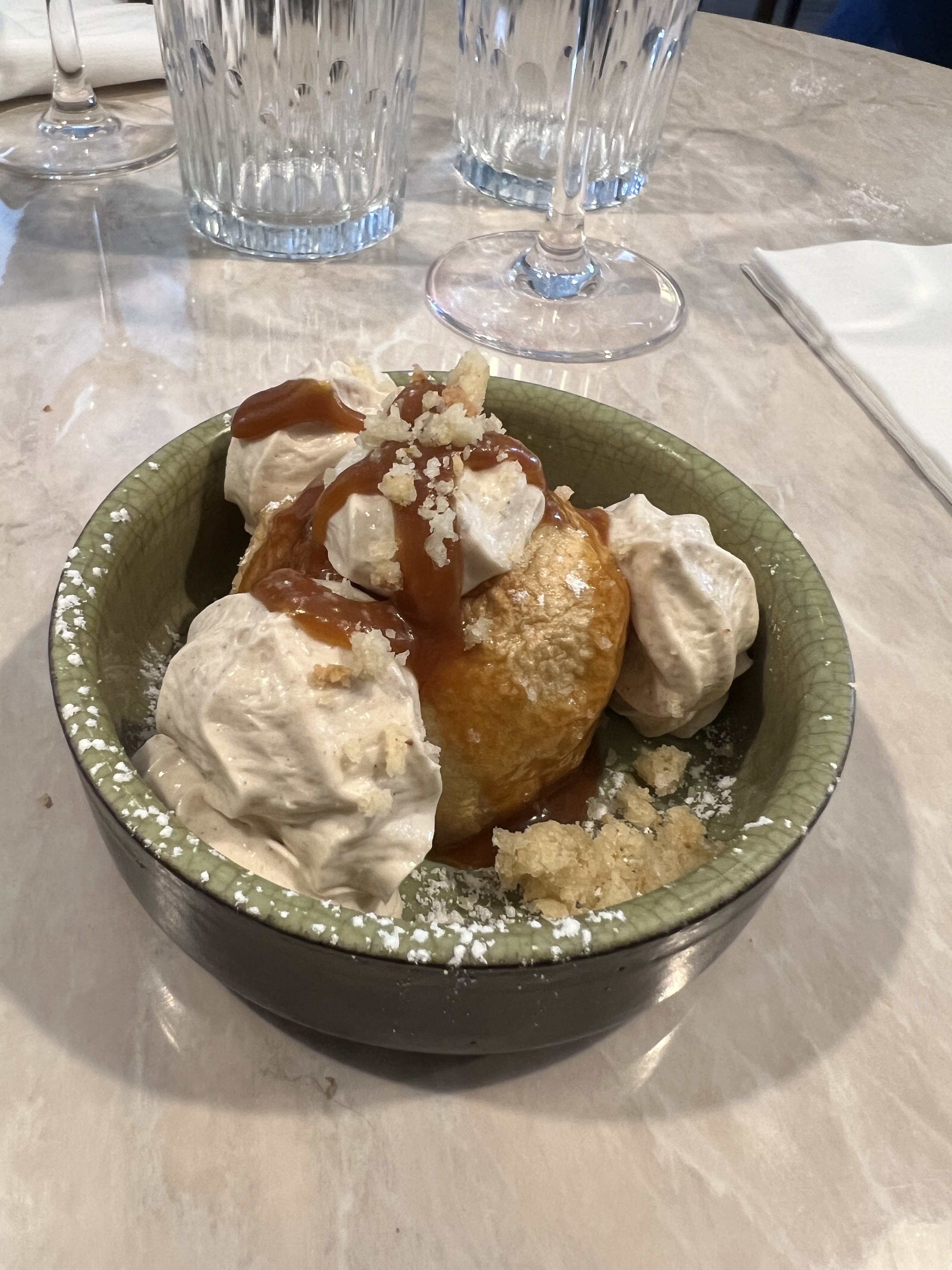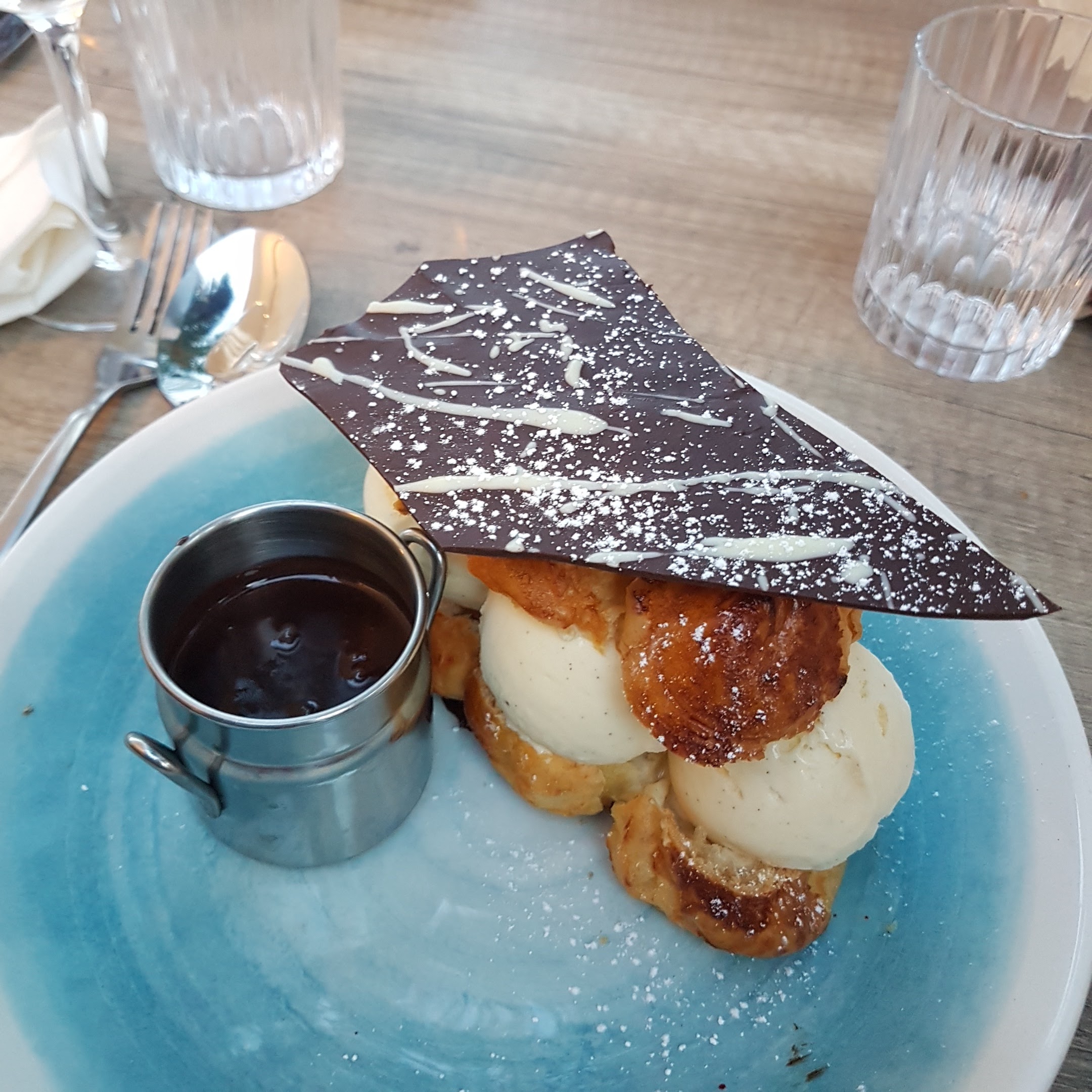 Nous avons dîné sur la belle terrasse. Accueil sympathique professionnel et souriant. Les plats sont très bien présentés et assaisonnés. La profiterole avec son craquant de chocolat qui fond avec le chocolat chaud . Wahou 🤤