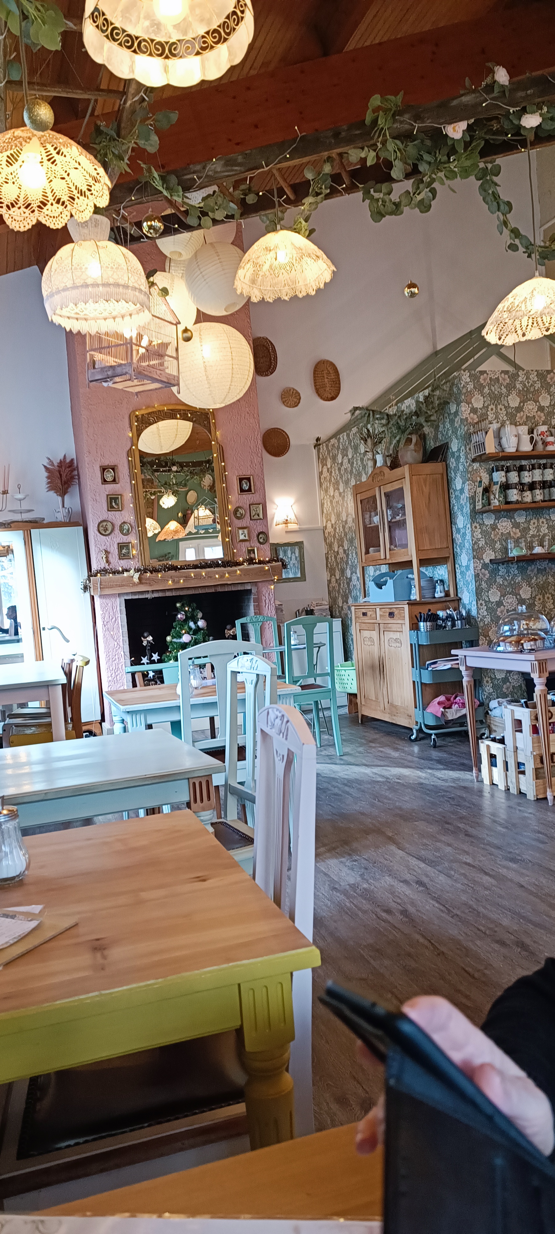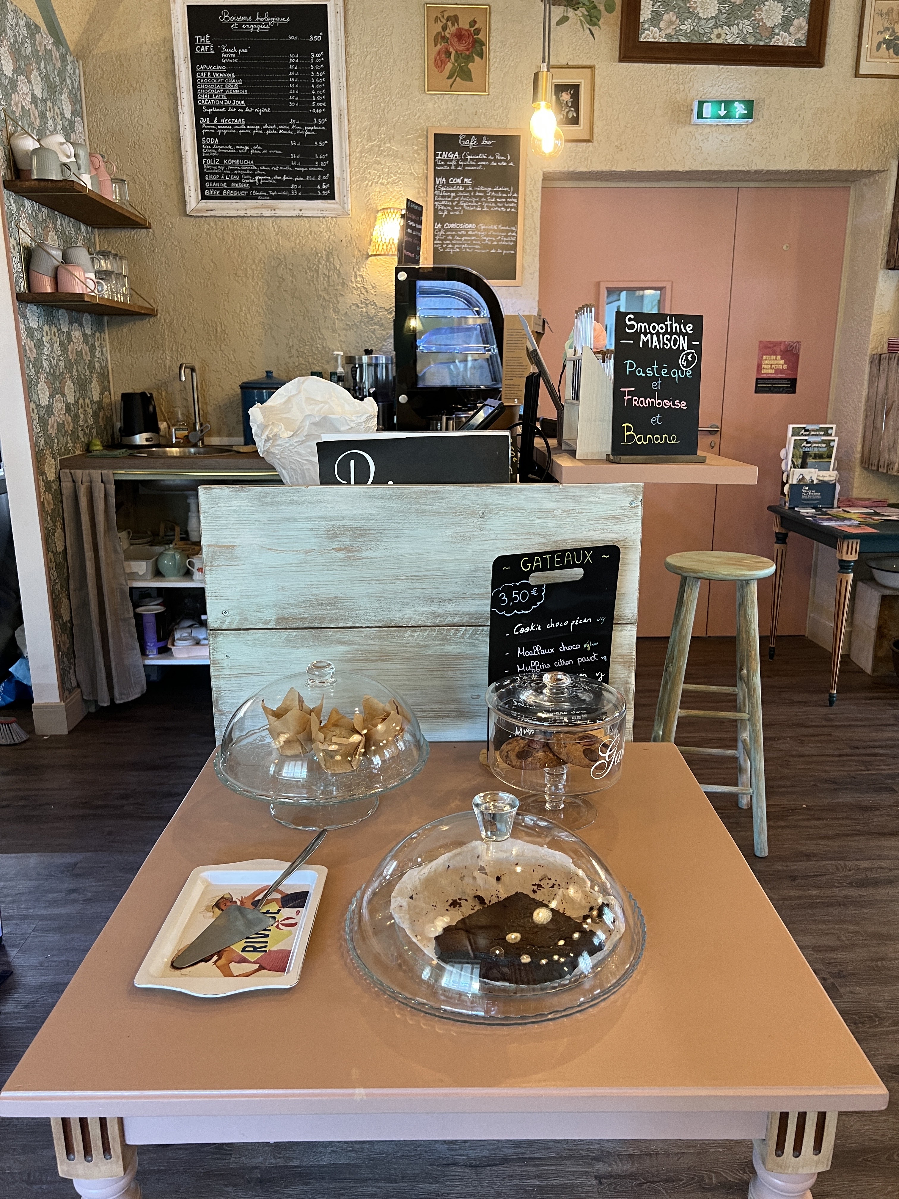 Déco vintage et magnifique. Salon de thé et en même temps boutique . Gâteau et boissons sans gluten. Prix raisonnable. J ai adoré le style.