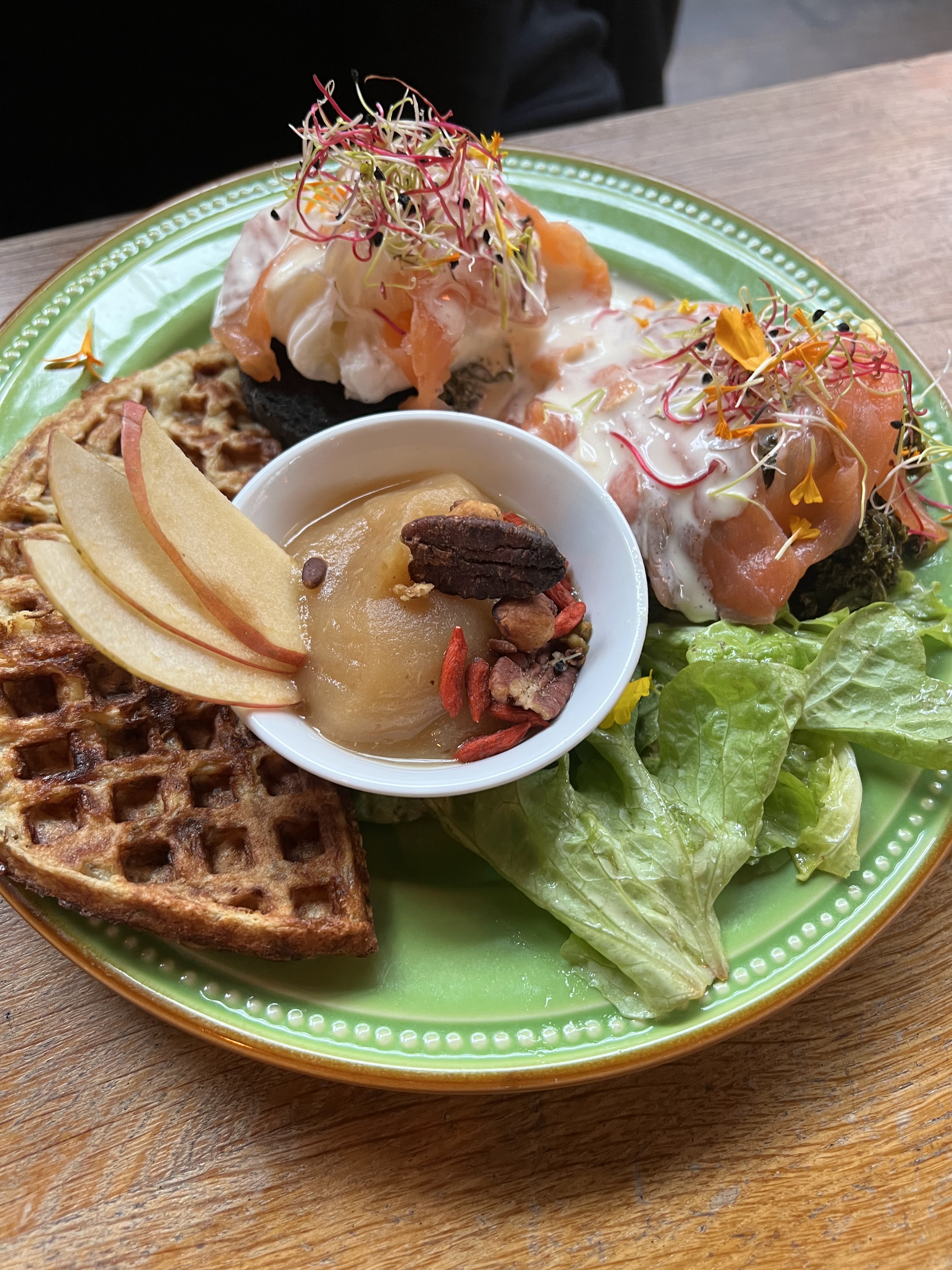 Le service était très bien. Cependant, nous avons commandé deux œufs bénédicte. Le pain à l’encre de sèche était de mauvaise qualité et très humide par la sauce(fade) …le plat était tiède limite un peu froid. Nous les avons trouvé écœurants. Malgré cela, coup de cœur pour les frites à la patate douce.