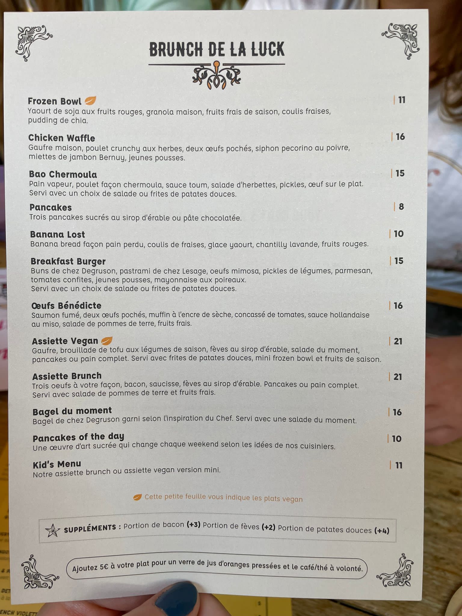 Nous avons partagé un brunch à la Luck avec des amis. Le concept est très sympa avec des sommeliers qui viennent à table nous conseiller/expliquer les jeux et faire un premier tour avec nous (5€/personne pour l'accès aux jeux et le service). Les 2 sommeliers qu'on a eu étaient vraiment tops ! Concernant la nourriture en elle-même : les pancakes au sirop d'érable sont délicieux et copieux, le chicken roll est très bon, l'assiette brunch est également bonne (sauf pour le coleslaw que personne n'a apprécié) et les oeufs Bénédicte sont bons mais la portion nous a semblé beaucoup trop petite pour le prix (19€).