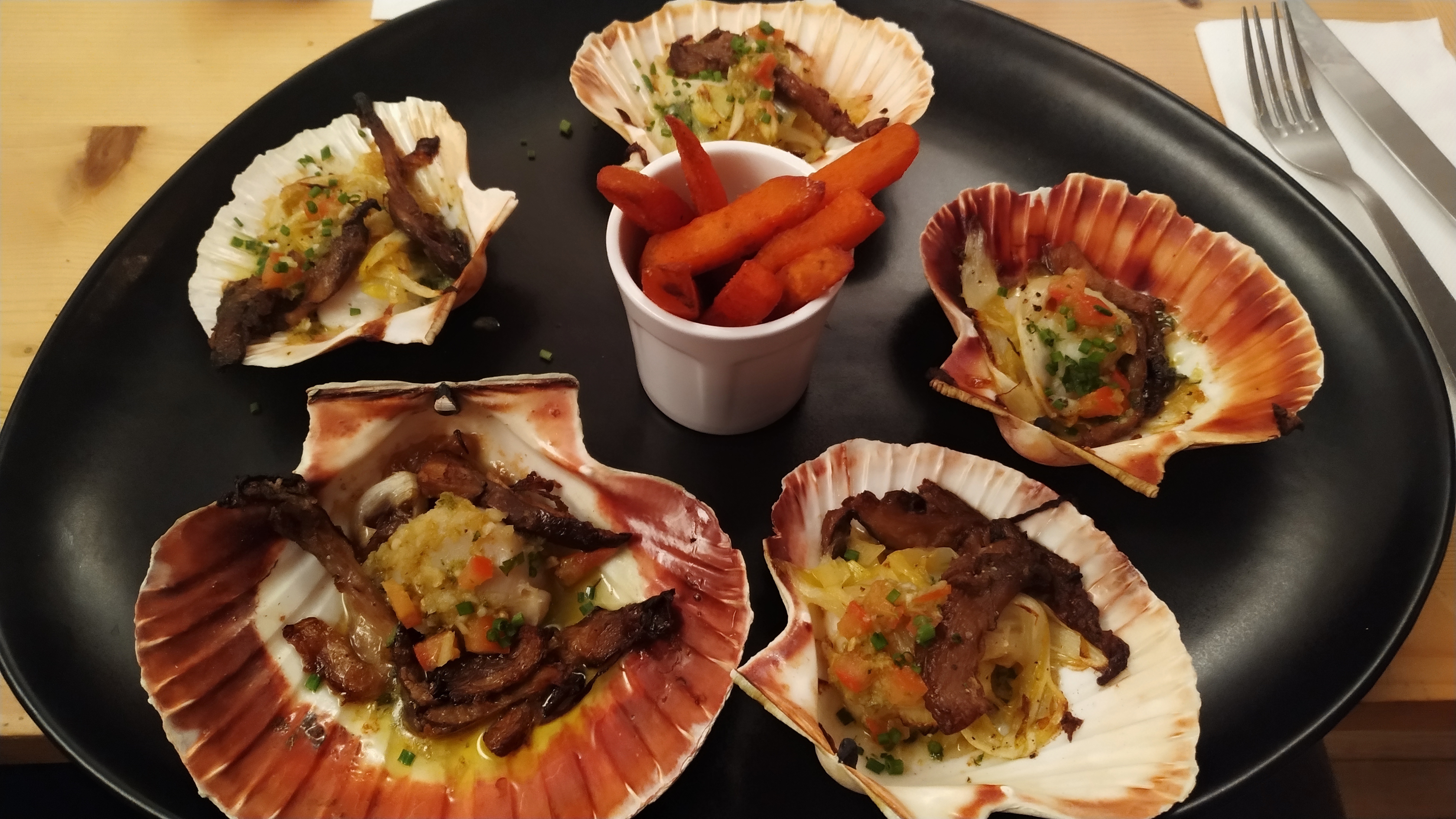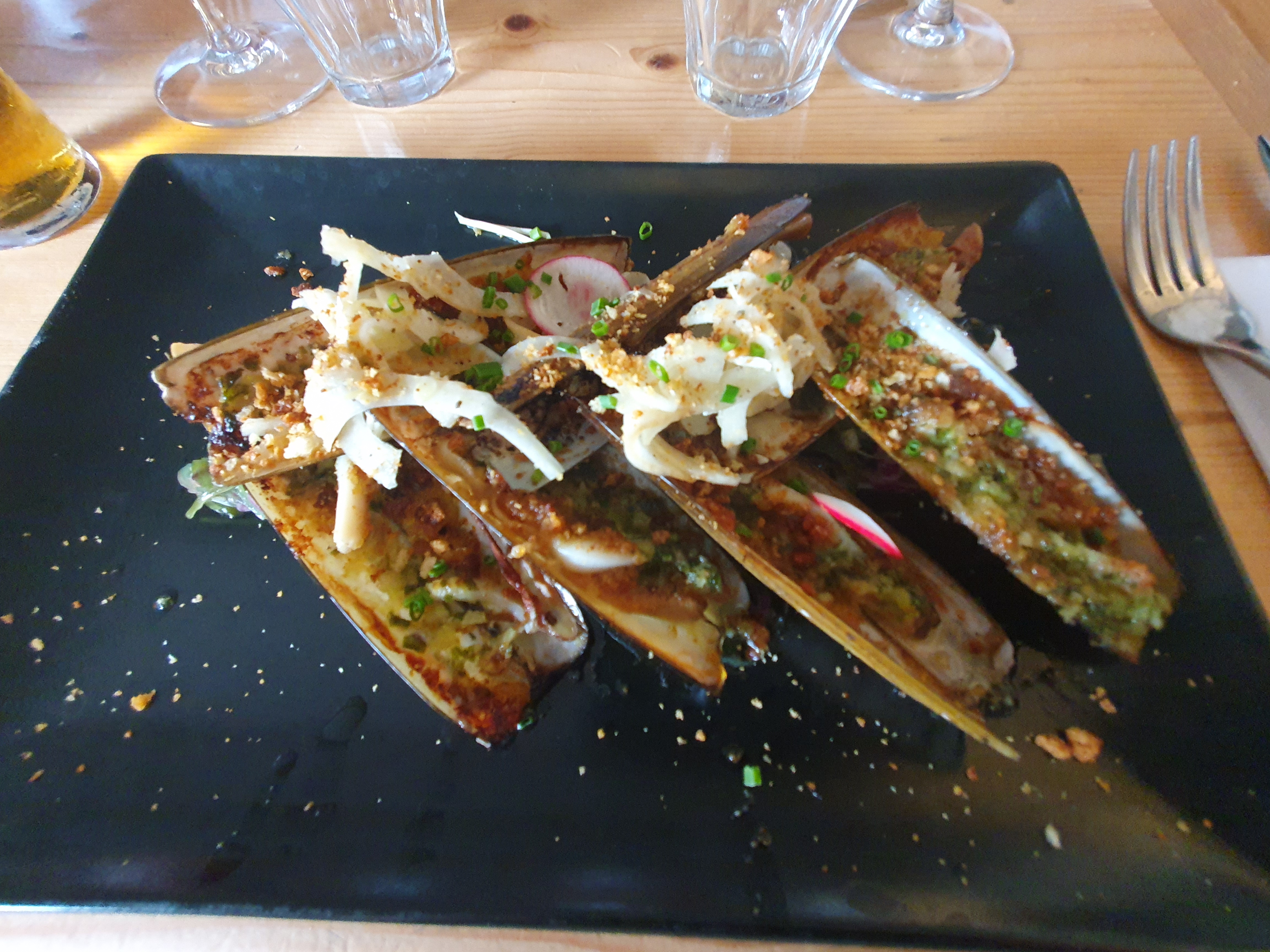 Nous avons déjeuner ce midi en dégustant les couteaux qui étaient excellents ainsi que les plats bien cuisinés et bien présentés. Le désert du jour délicieux avec une belle variété de goûts ! Merci c était un excellent moment avec un accueil chaleureux